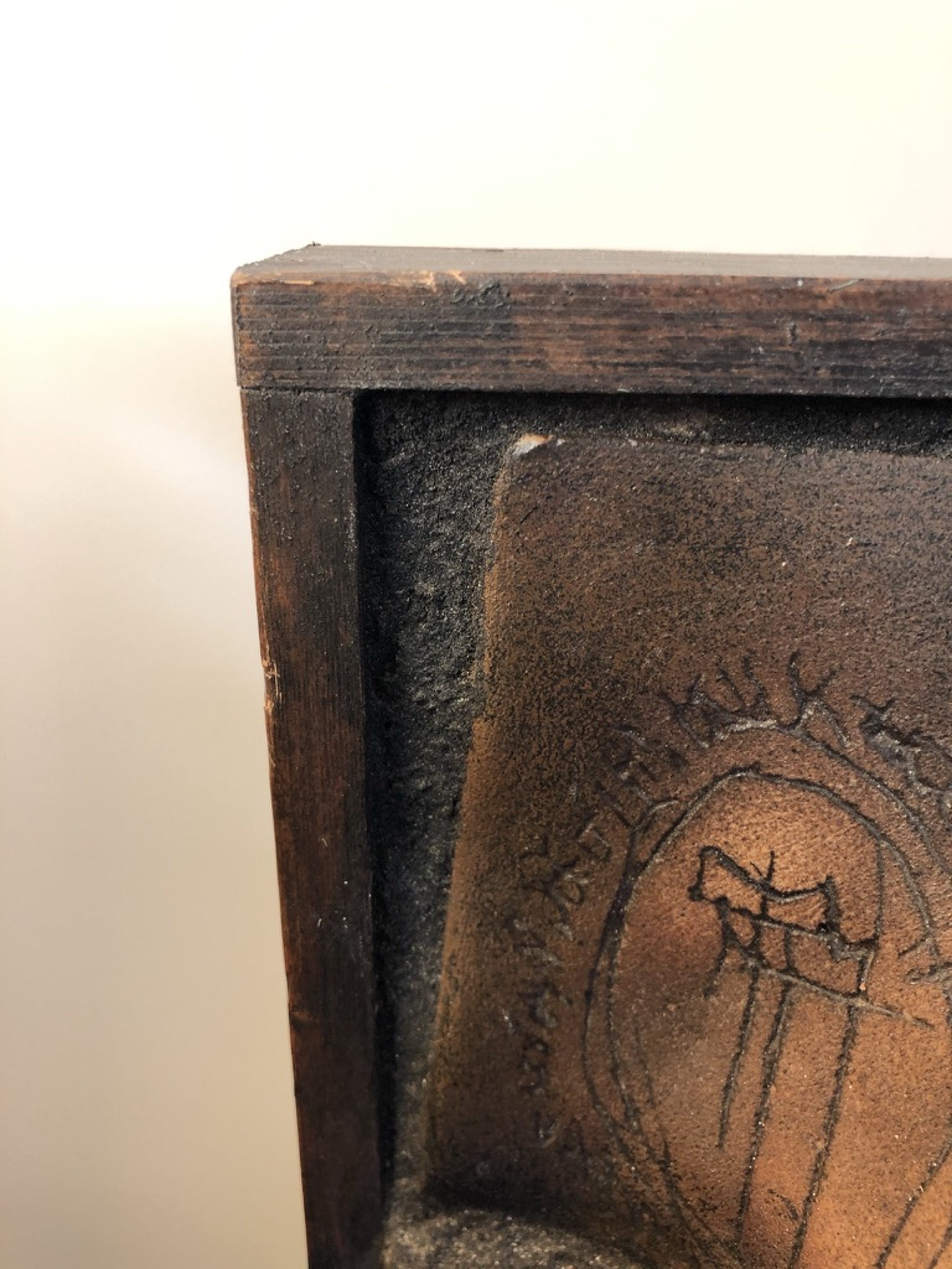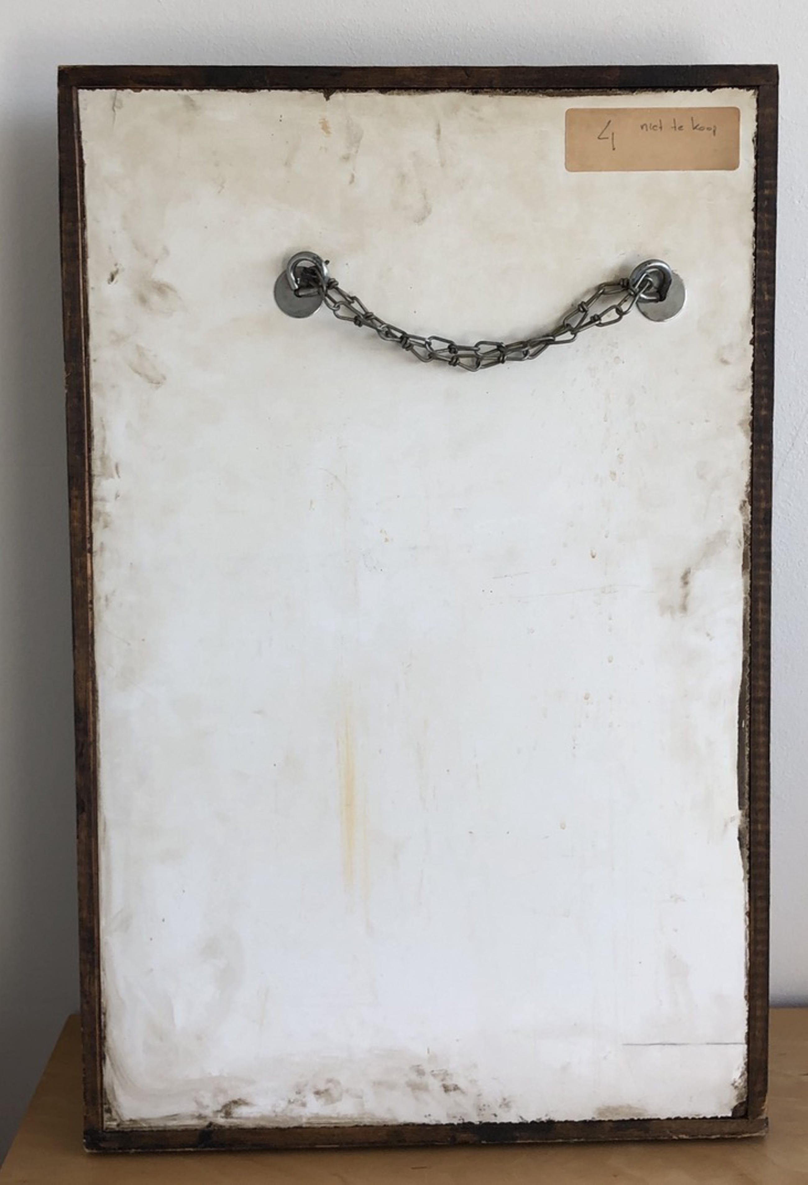 Het beeld zit opgesloten in een houten frame. Aan de achterkant van het frame zit een stevige ketting zodat het beeld aan de muur kan worden opgehangen.