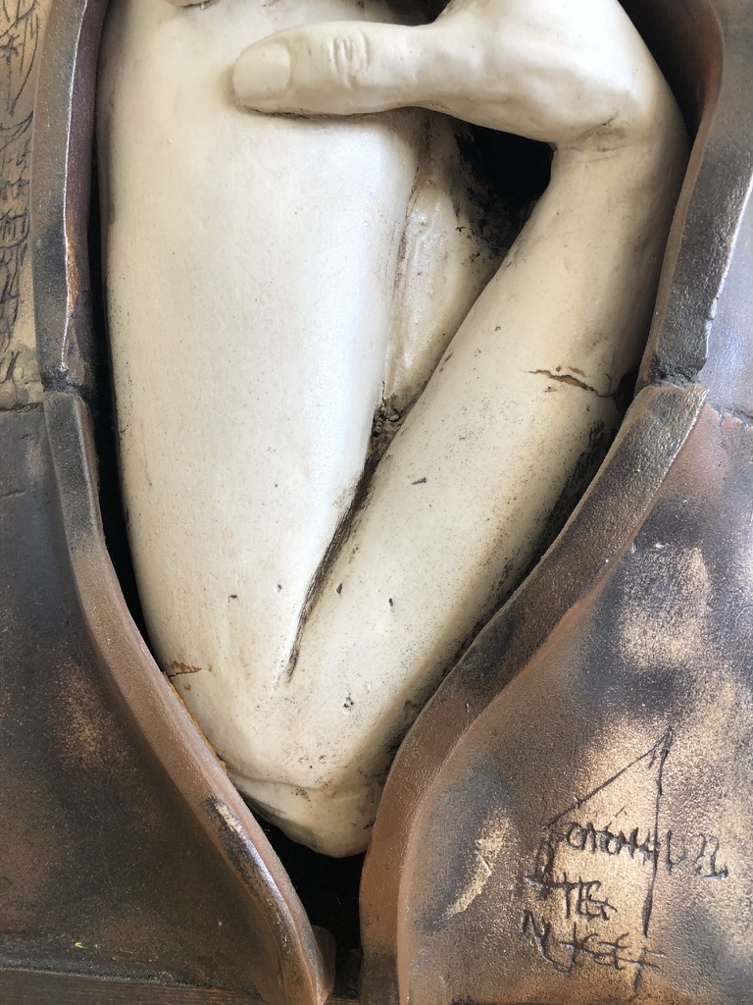 Een uitgebalanceerd effect bij dit beeld wordt verkregen door de prachtige kleuren in combinatie met in de klei gekraste decoraties. Het krassen met diepe en ondiepe halen is de specialiteit van Klaas.