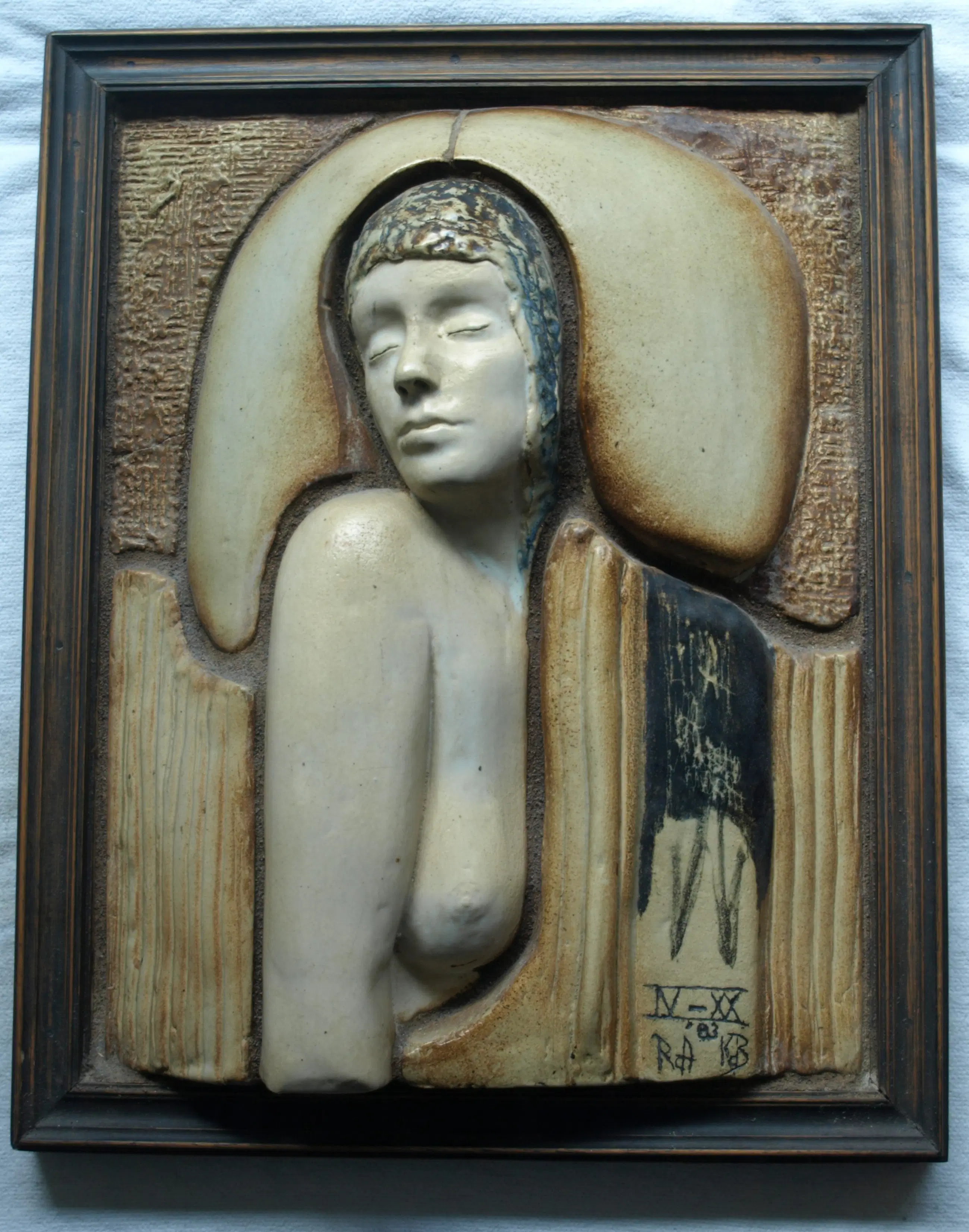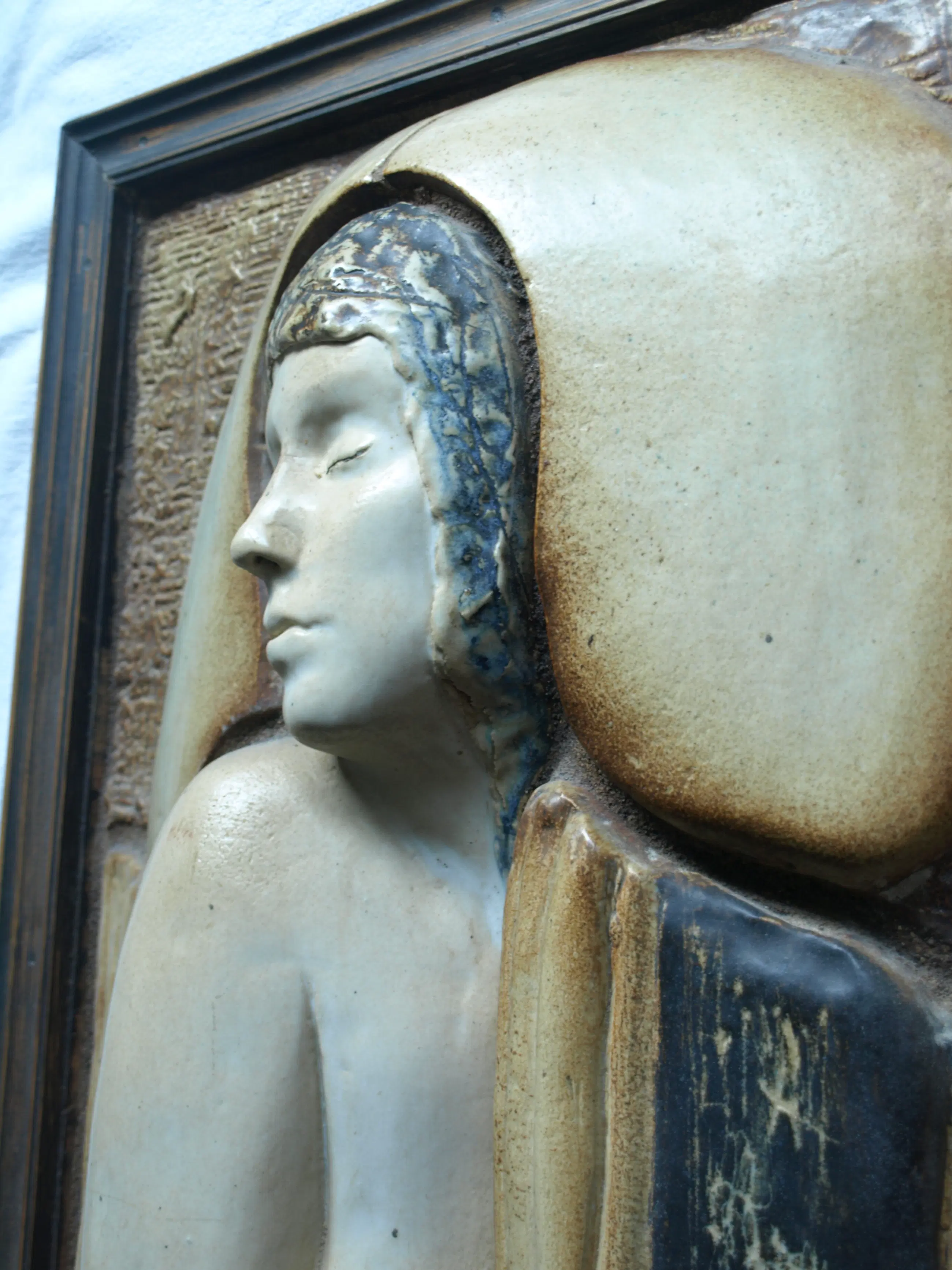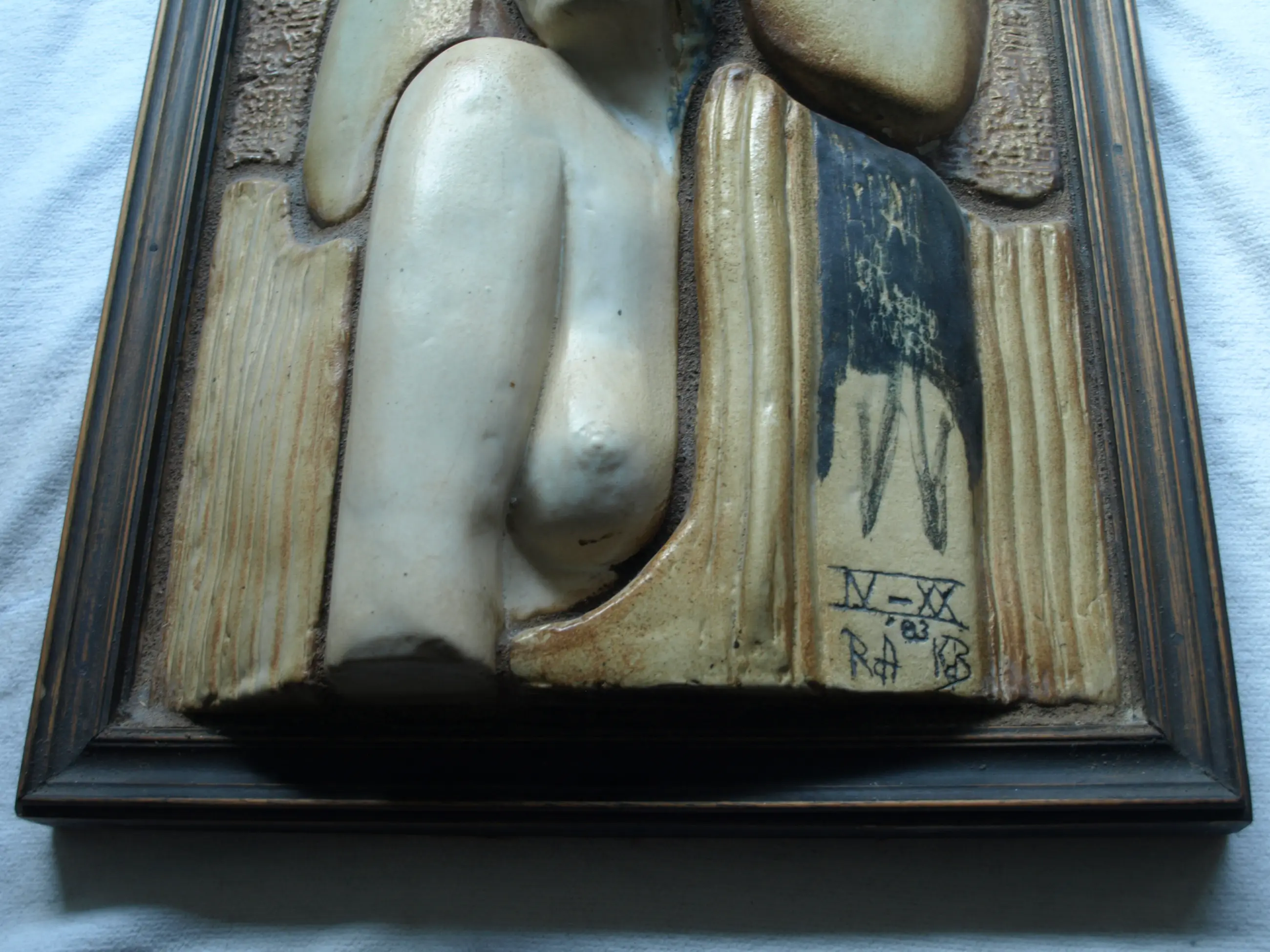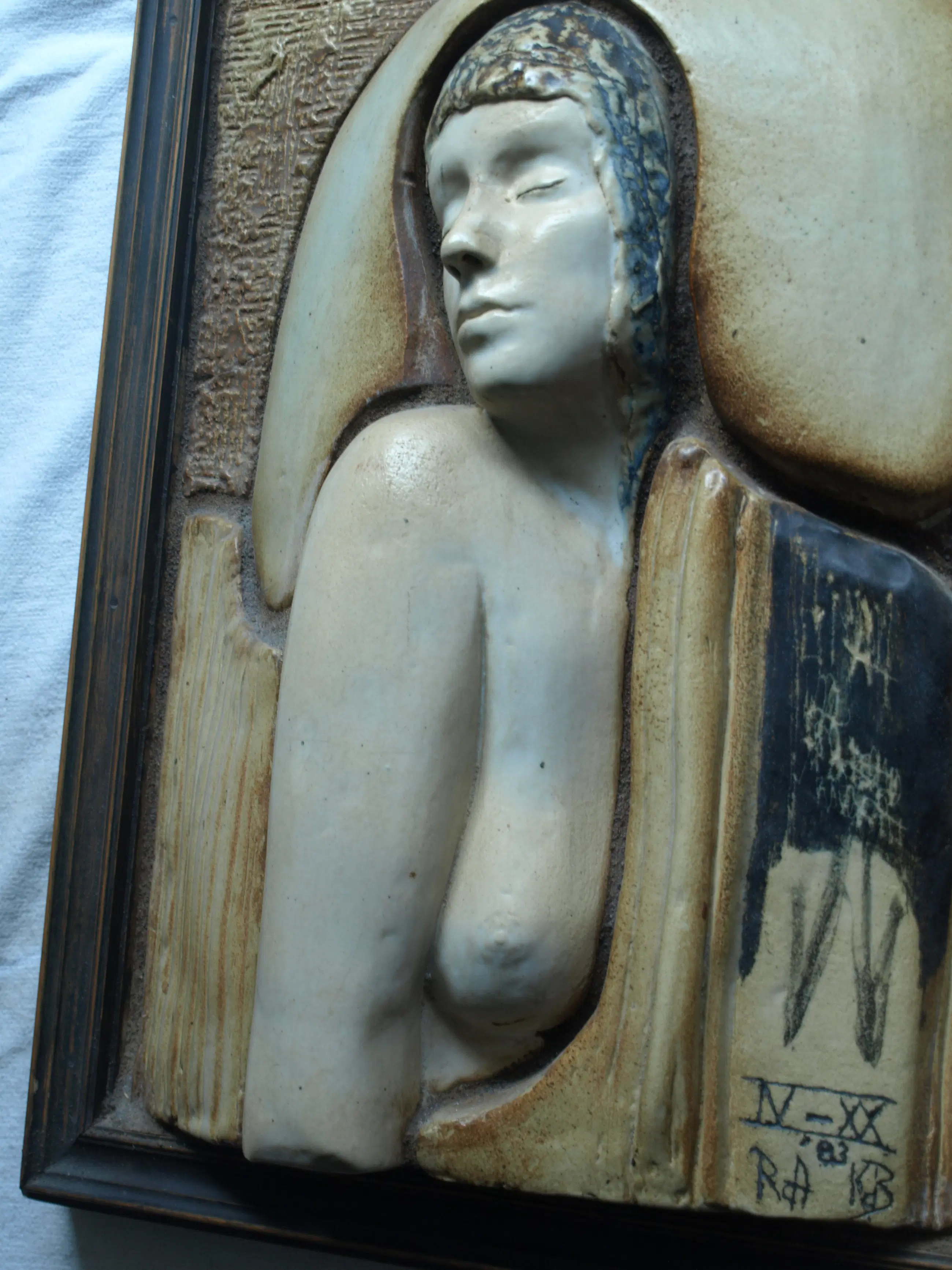 Een mysterieus tableau van keramiek gemaakt in 1983 door de keramisten / beeldhouwers Reinier den Adel (1950-2023) en Klaas de Boer (1944-). Dit kunstwerk is een driedimensionaal reliëfbeeld van keramiek dat een slapende of rustende figuur voorstelt; een vrouwelijke figuur met gesloten ogen, omgeven door abstracte, gestileerde vormen. -Gesigneerd door beide kunstenaars met hun initialen rechtsonder. Ook genummerd (dit is nr. IV / XX , 4 van 20 ) en gedateerd (1983) rechtsonder. Het tableau is omlijst door een houten lijst. Kan zo aan de muur. -Afmetingen: Lijst, 67 x 54 x 5 cm. Beeld, 59 x 46 x 13 cm (hoogte x breedte x diepte). -Gewicht: 23,1 kg. -Herkomst: Uit de inboedel van een kunstverzamelaar. -Conditie: Het beeld is in zeer goede staat met ouderdomssporen. Zie ook de foto’s voor een eigen indruk. Klaar om op te hangen.