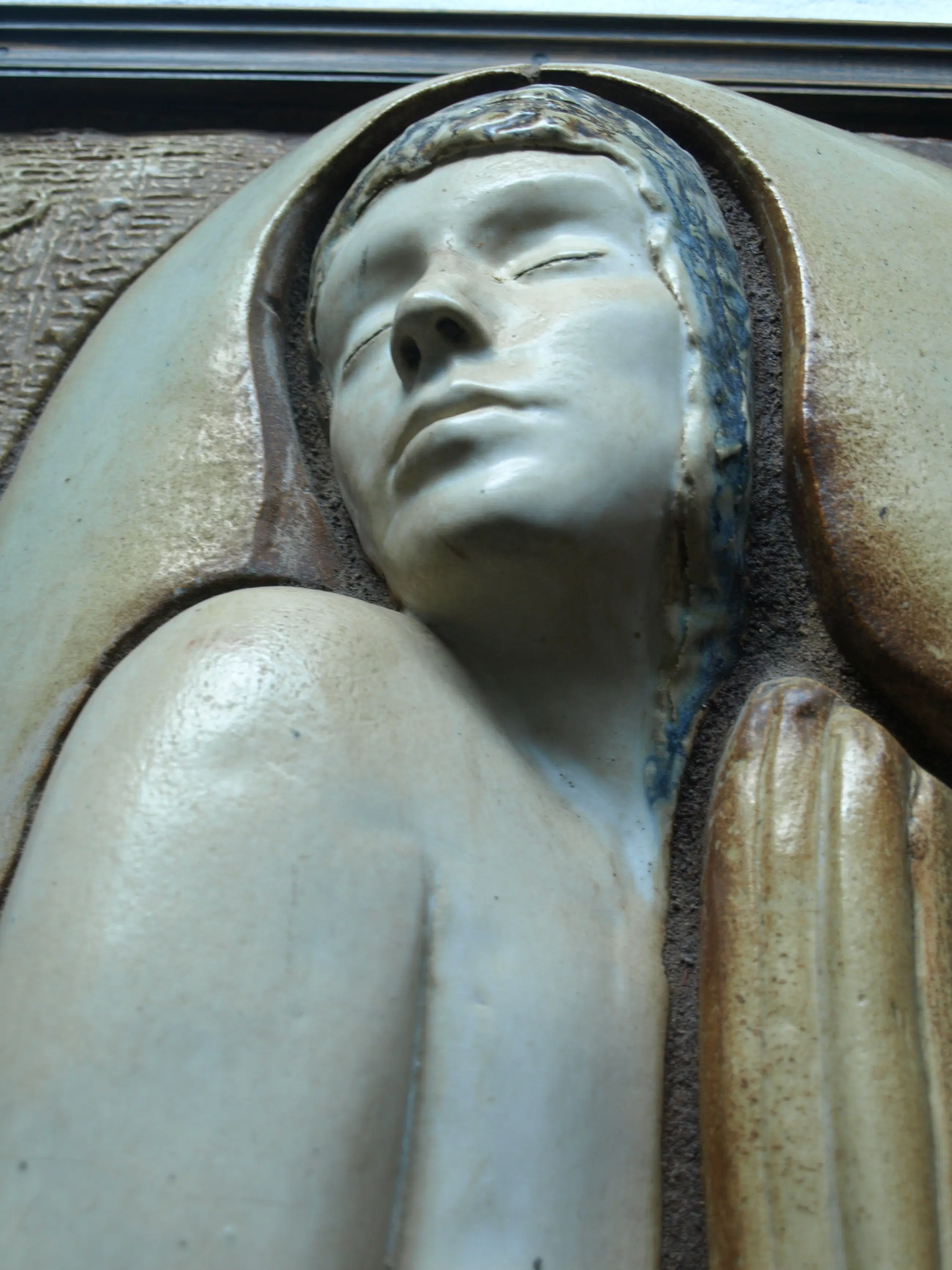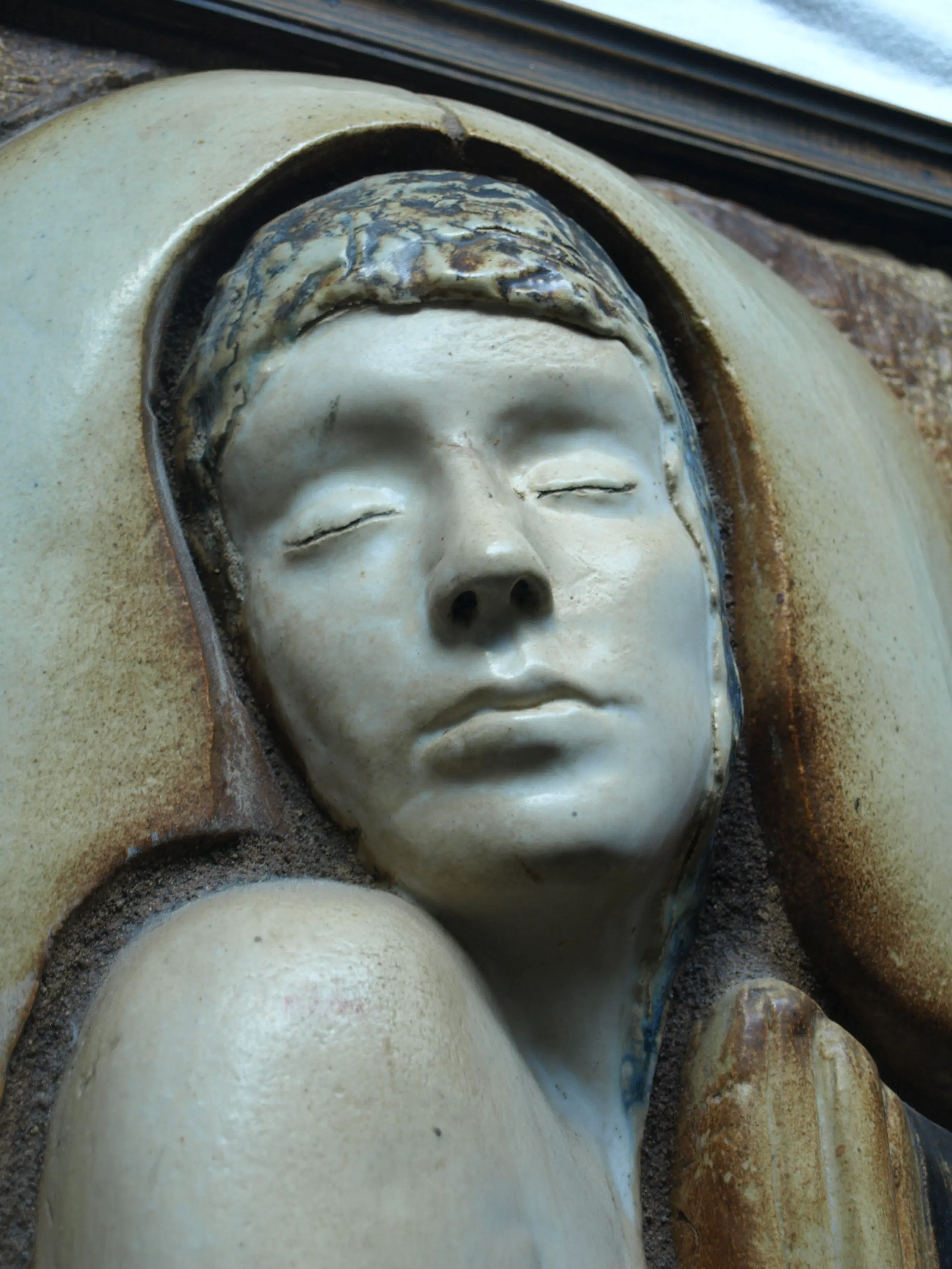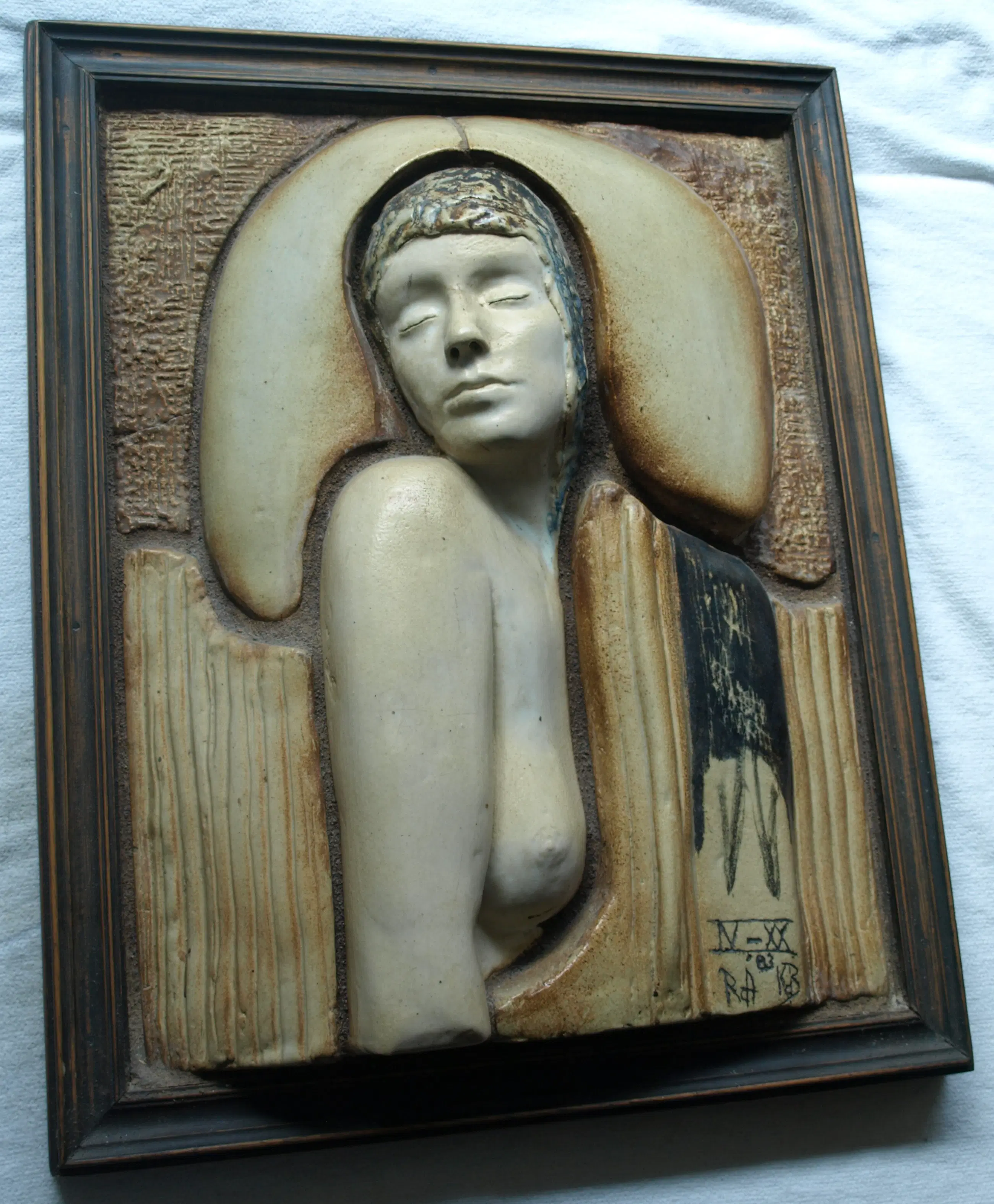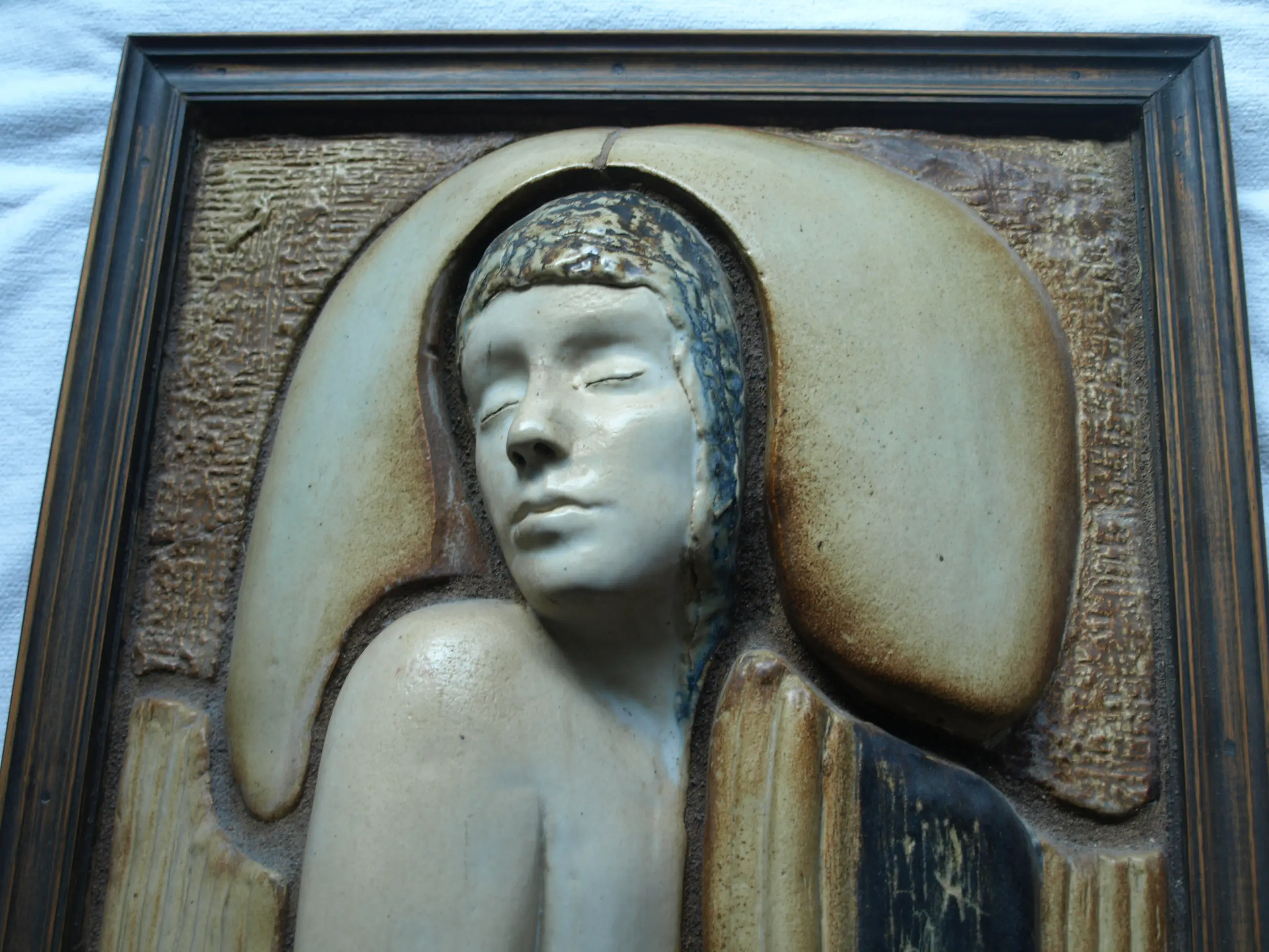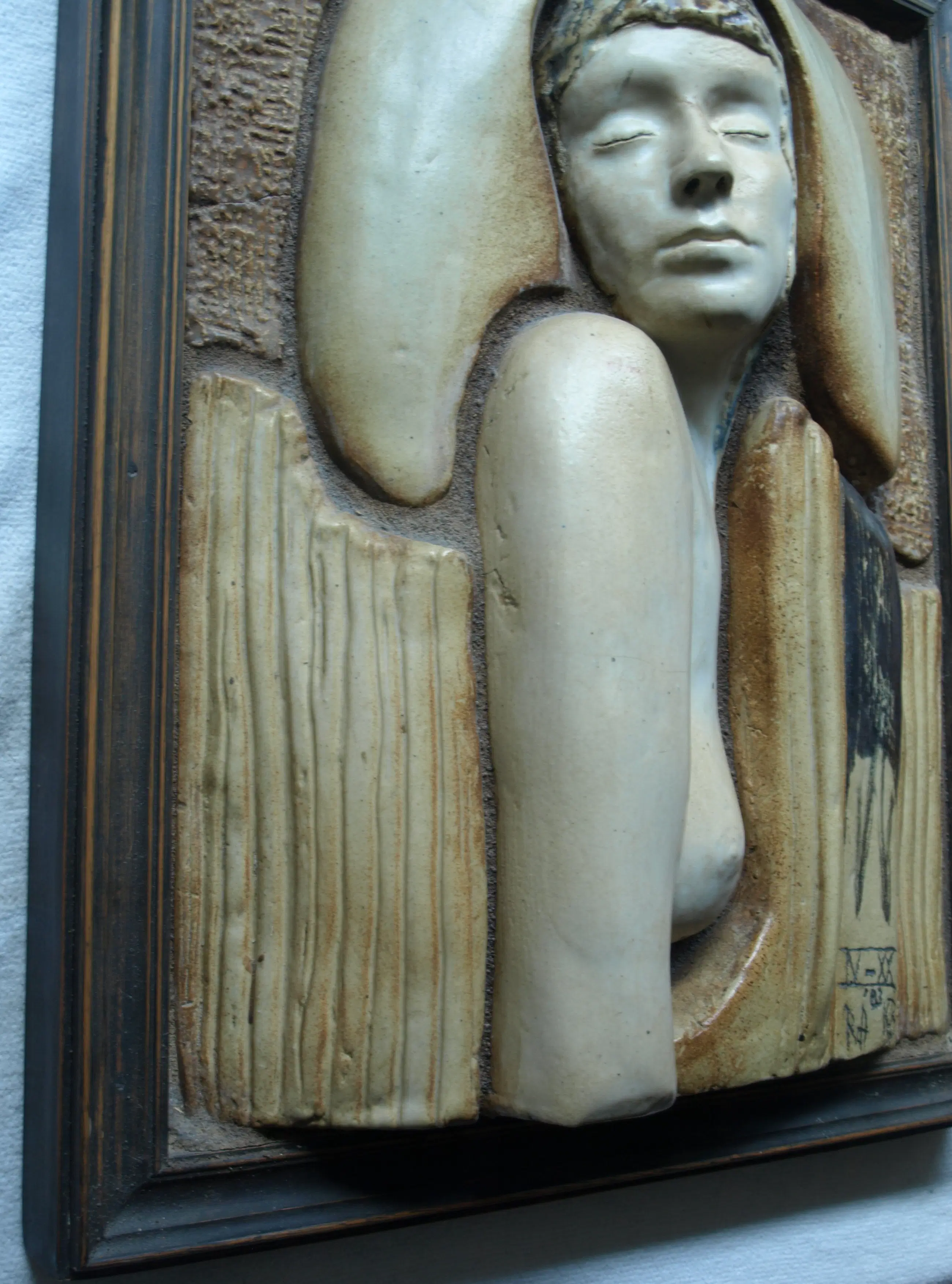 Een mysterieus tableau van keramiek gemaakt in 1983 door de keramisten / beeldhouwers Reinier den Adel (1950-2023) en Klaas de Boer (1944-). Dit kunstwerk is een driedimensionaal reliëfbeeld van keramiek dat een slapende of rustende figuur voorstelt; een vrouwelijke figuur met gesloten ogen, omgeven door abstracte, gestileerde vormen. -Gesigneerd door beide kunstenaars met hun initialen rechtsonder. Ook genummerd (dit is nr. IV / XX , 4 van 20 ) en gedateerd (1983) rechtsonder. Het tableau is omlijst door een houten lijst. Kan zo aan de muur. -Afmetingen: Lijst, 67 x 54 x 5 cm. Beeld, 59 x 46 x 13 cm (hoogte x breedte x diepte). -Gewicht: 23,1 kg. -Herkomst: Uit de inboedel van een kunstverzamelaar. -Conditie: Het beeld is in zeer goede staat met ouderdomssporen. Zie ook de foto’s voor een eigen indruk. Klaar om op te hangen.