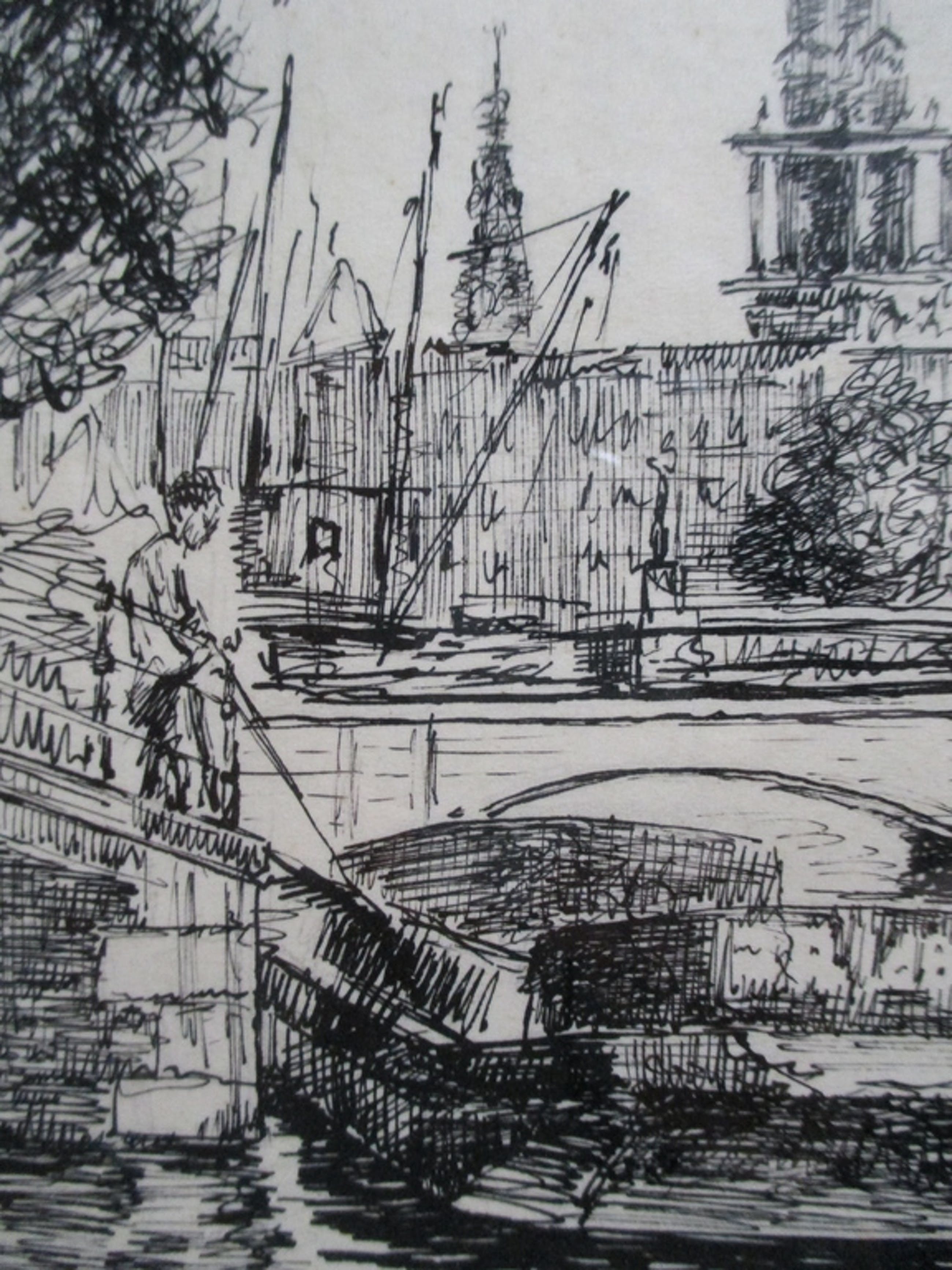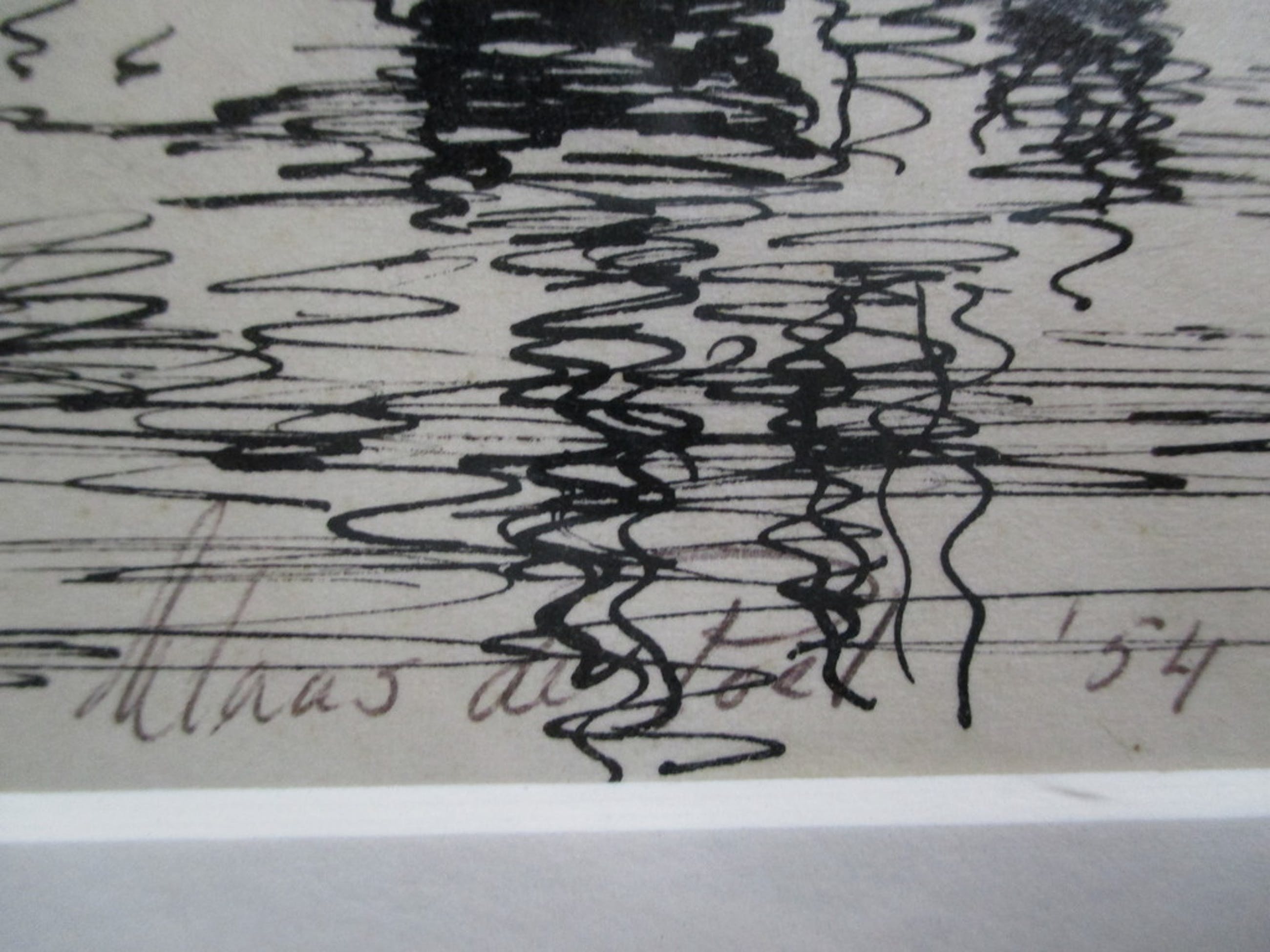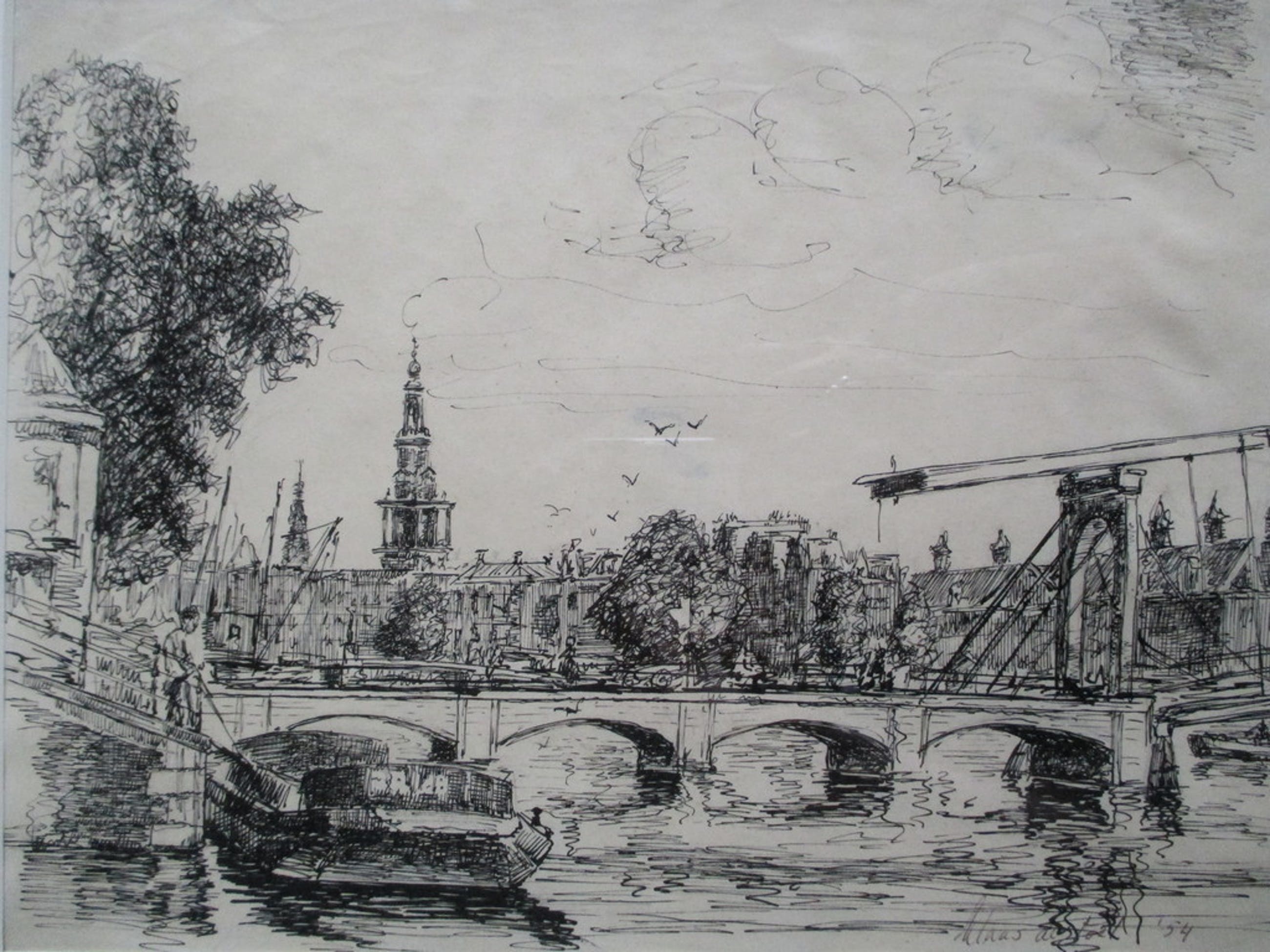 Ingelijste inkttekening uit 1954 van Klaas de Poel, voortsellende de Magere Brug te Amsterdam gezien vanaf de Blauwbrug. Rechtsonder gesigneerd en gedateerd. Afmetingen lijst 49x40,5 , beeld 31x23,5 cm.