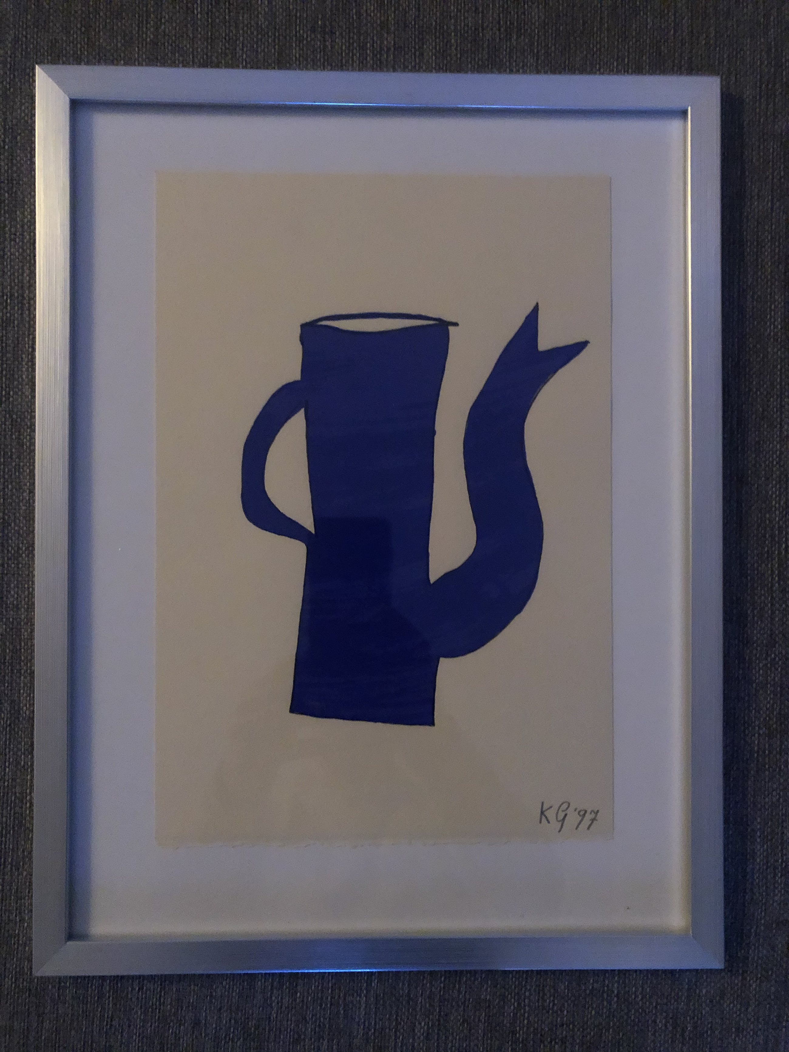 Ingelijst werk van Klaas Gubbels uit 1997 in zilverkleurige lijst. Werk kan zo aan de muur. Blauwe kan, frisse kleur.