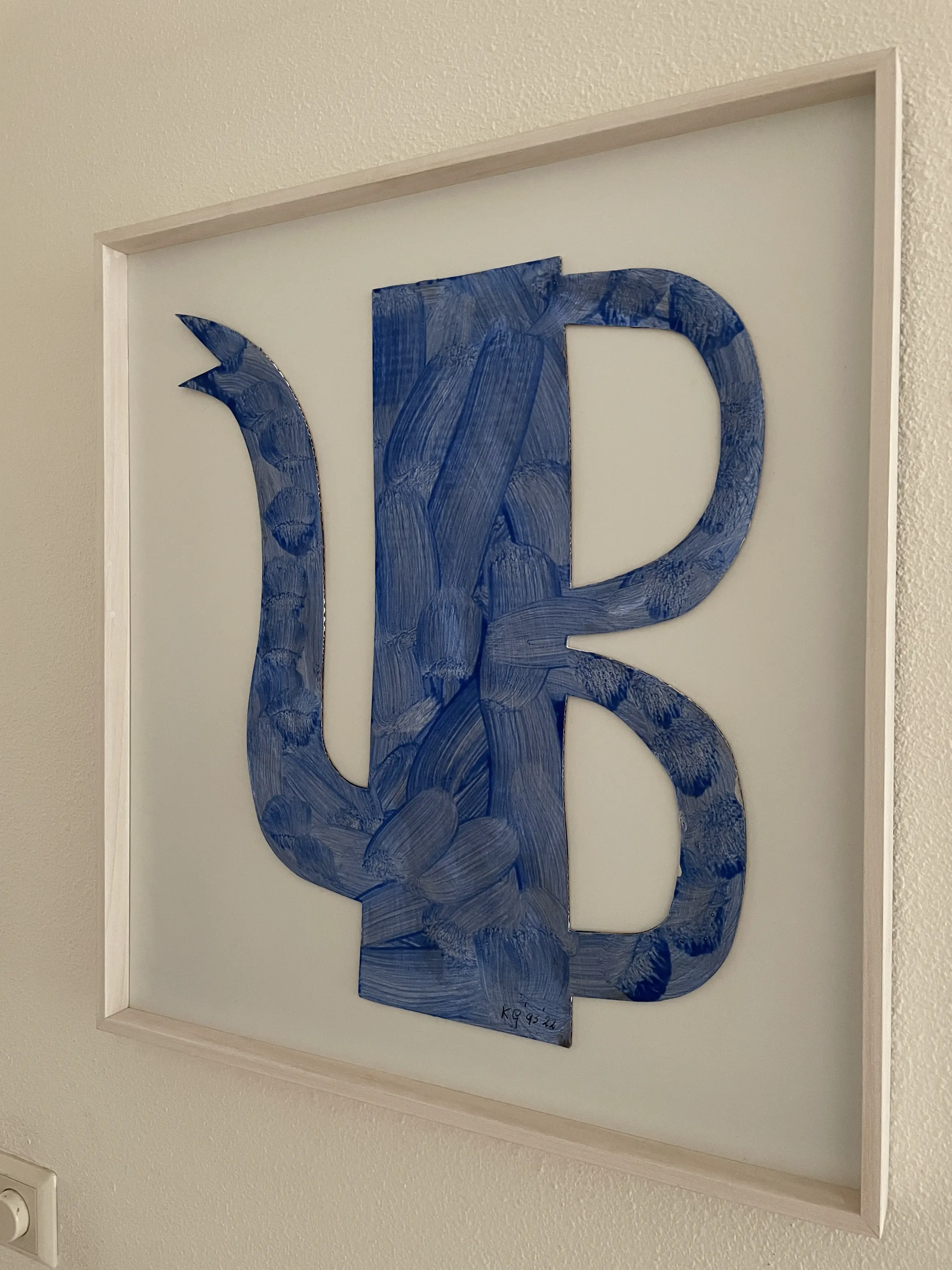 Kartonnen kan in fraaie kleur blauw beschilderd en bevestigt in witte baklijst. Dit hele geheel maakt het een fraai uniek werk.