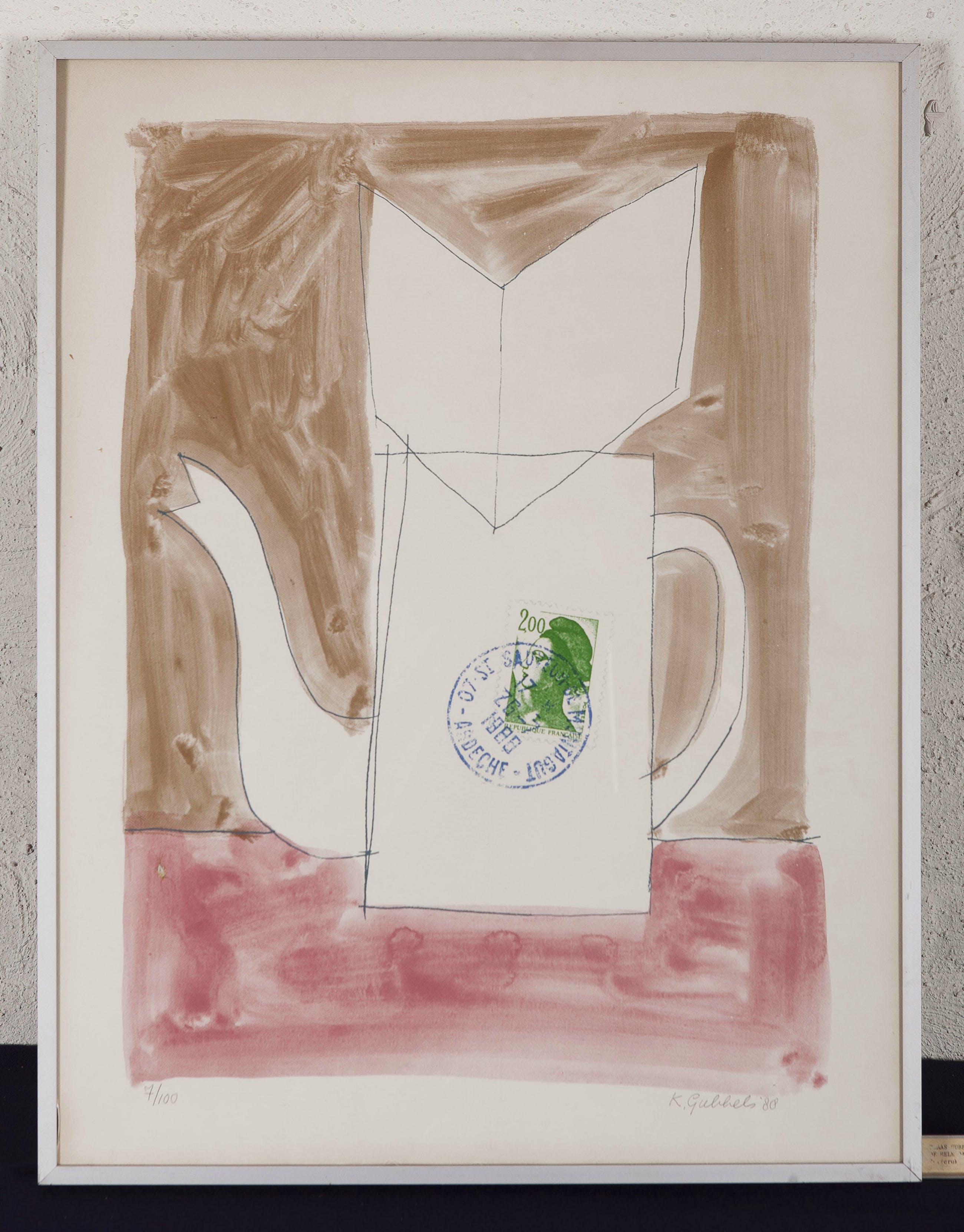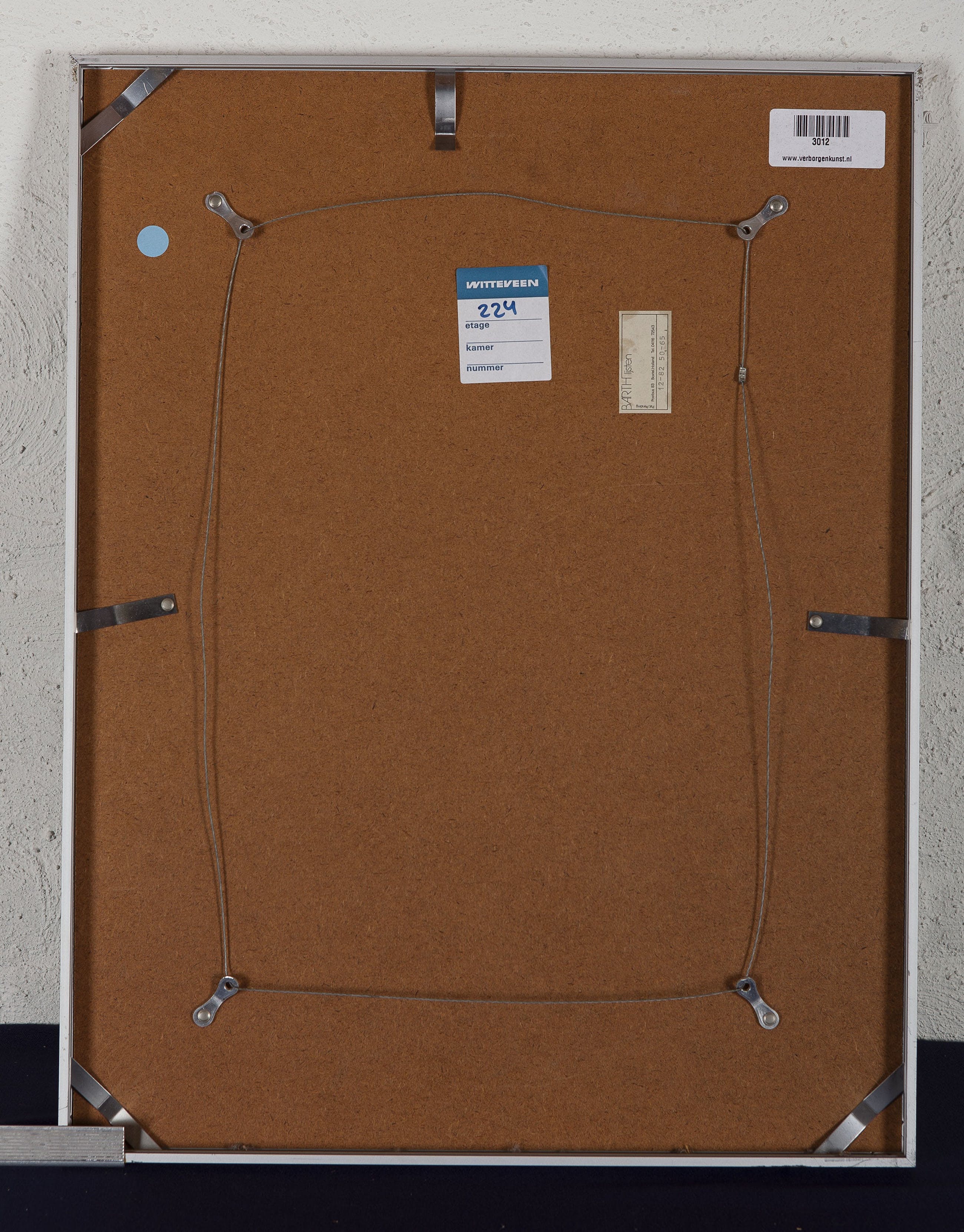De lijst heeft verschillende gebreken. De glasplaat is gescheurd in de linker onderhoek, de lijst klemt niet goed links boven en achter de glasplaat bevindt zich een dood insect.
