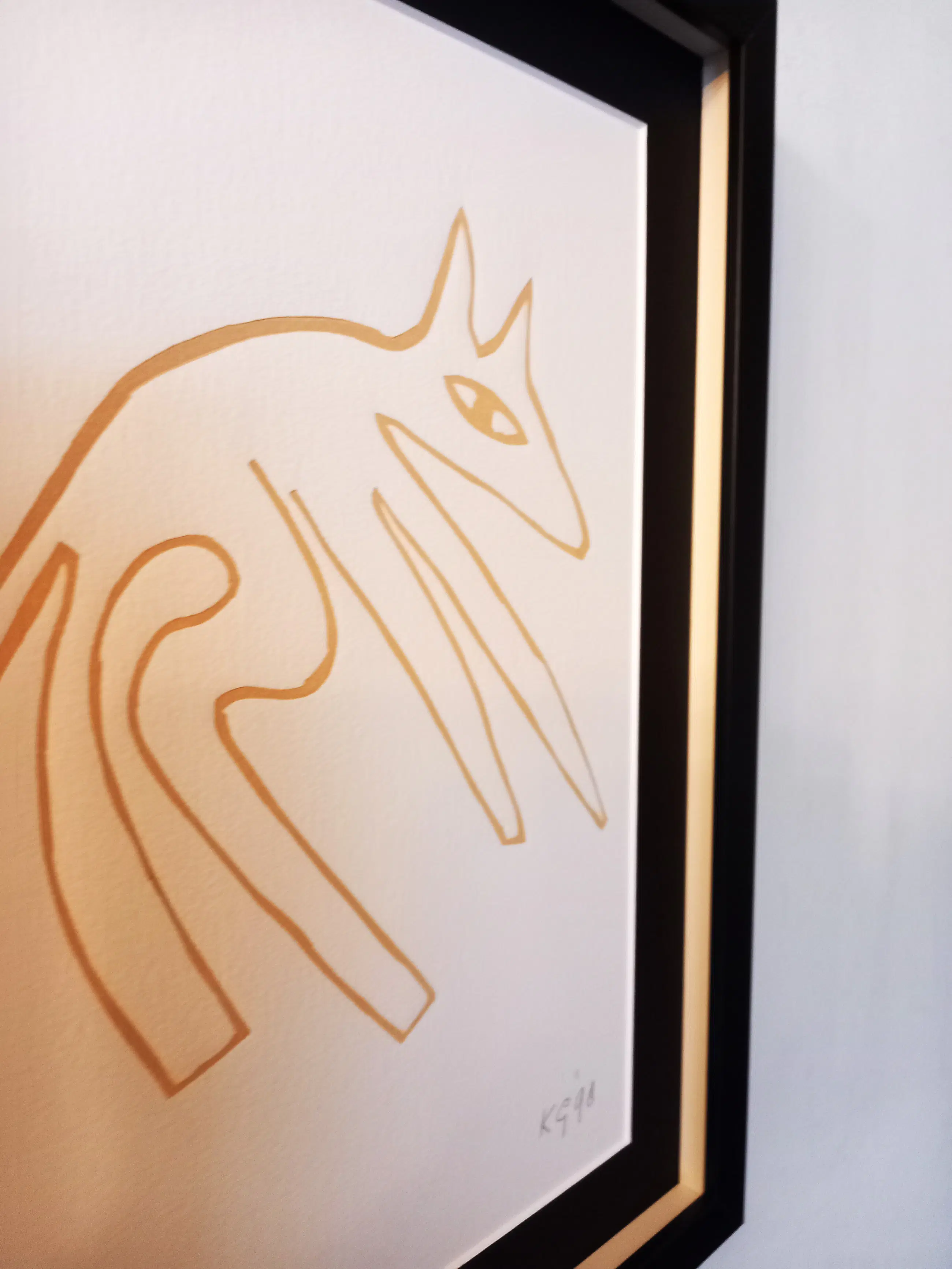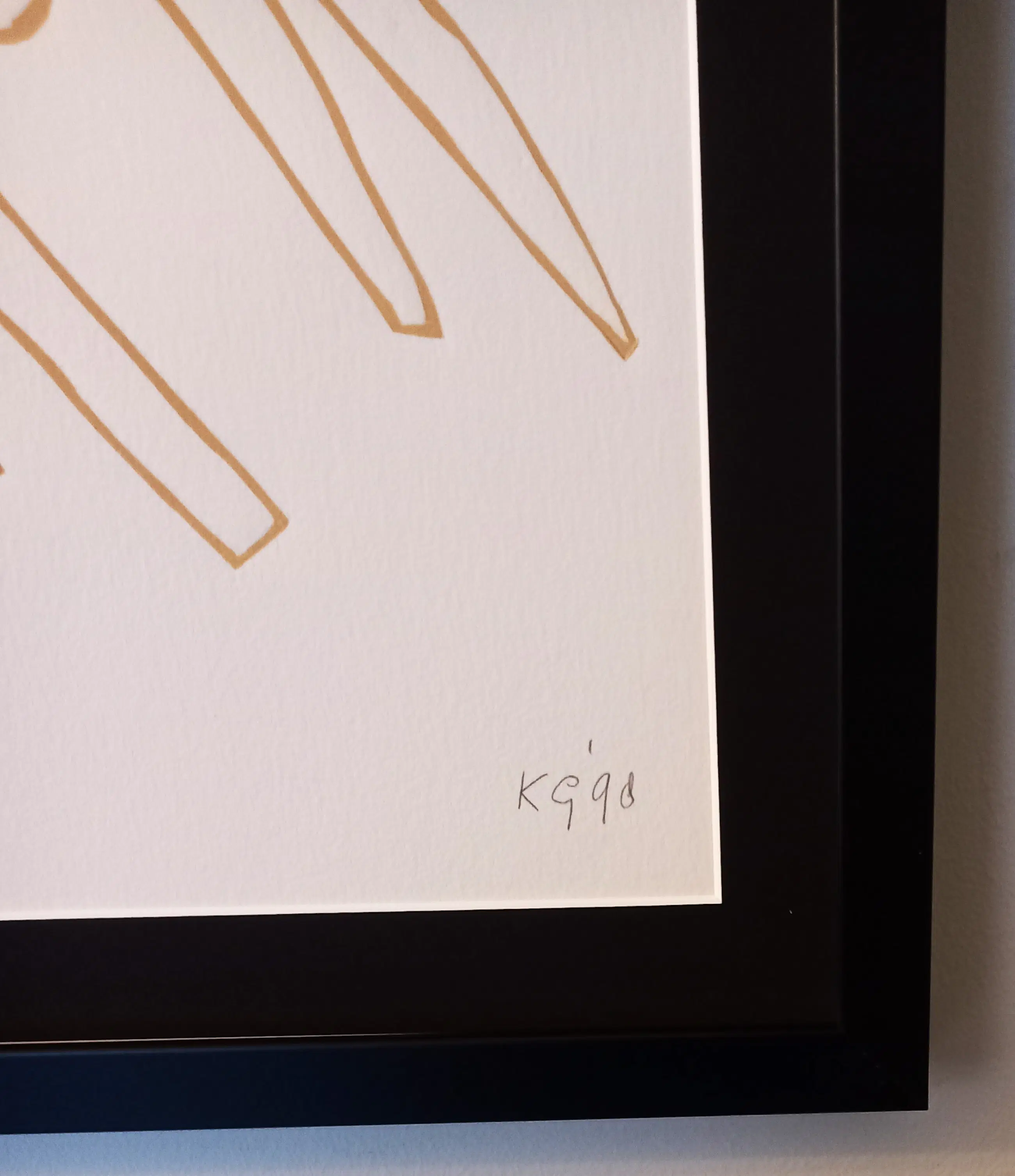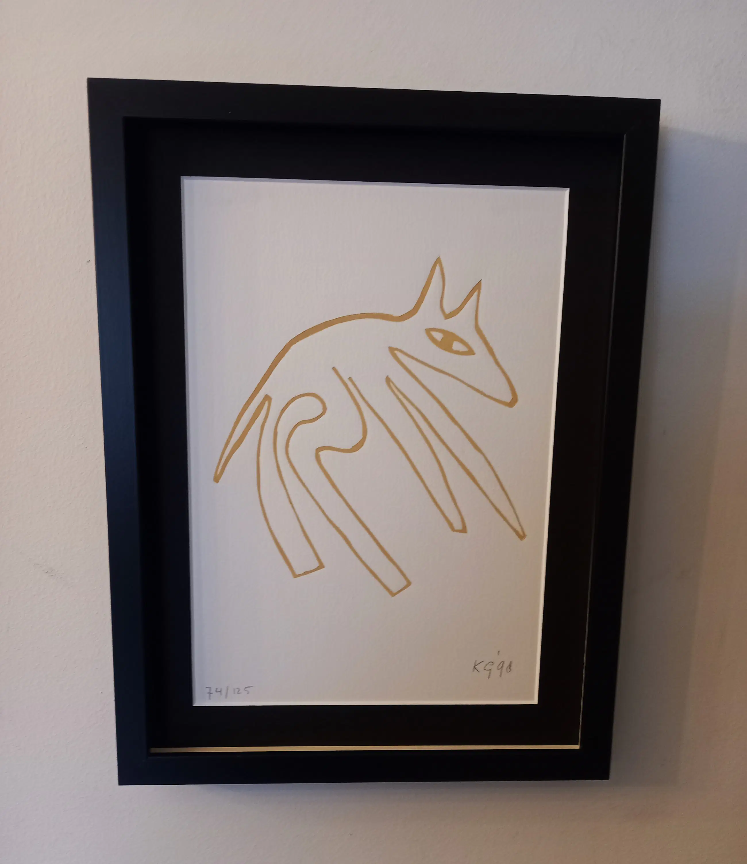 Fraaie linodruk in gelimiteerde oplage van Klaas Gubbels uit 1998, in perfecte staat. Het werk is geïnspireerd op de tekst 'Schuldige hond' van de schrijver Jan Siebeling. Gesigneerd K.G. en genummerd met potlood.