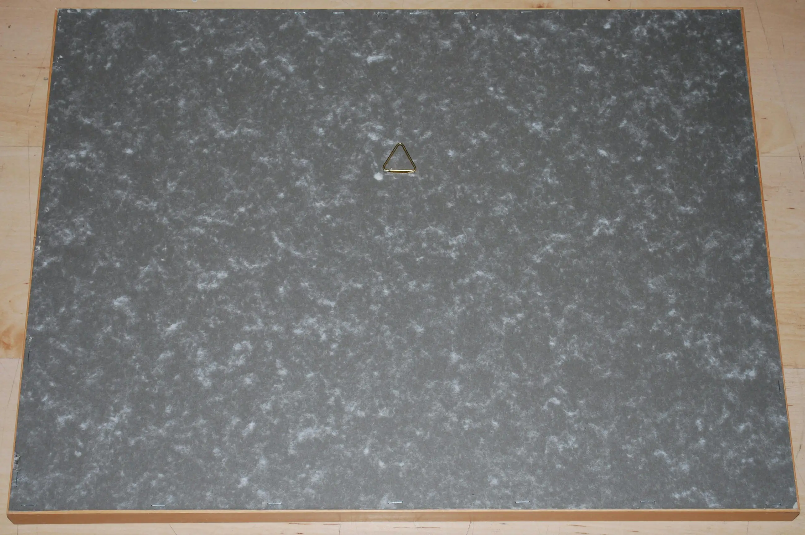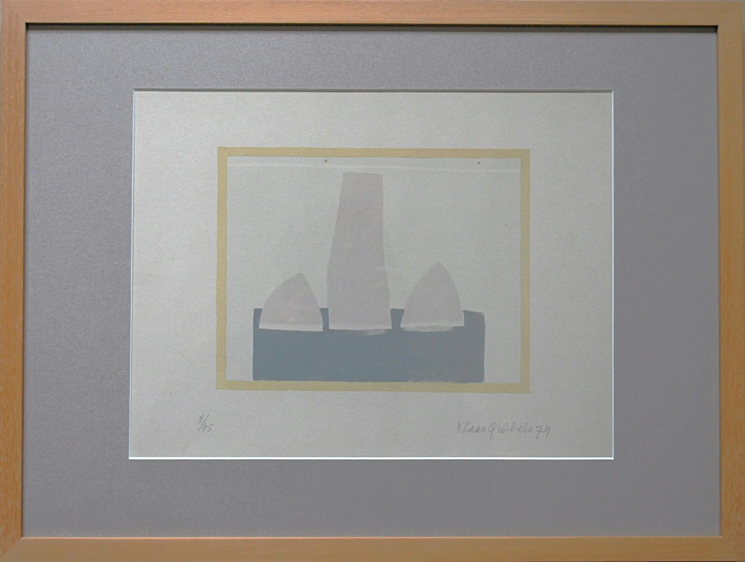 Minimalistisch stilleven. Oplage 8/45. Het geheel is zuurvrij ingelijst. De achterkant van het papier is wat gebruind (van de vorige inlijsting). Bovenaan in het beeld 2 minuscule foxing-plekjes. Achter passepartout en glas. In een mooie, strakke houten lijst.