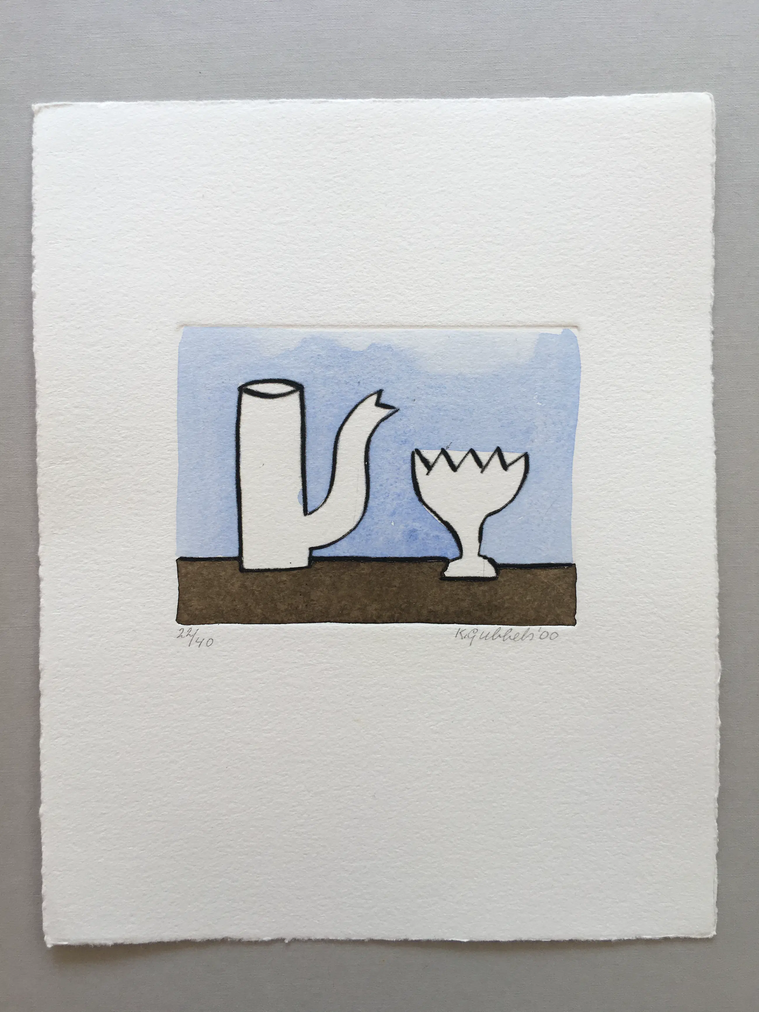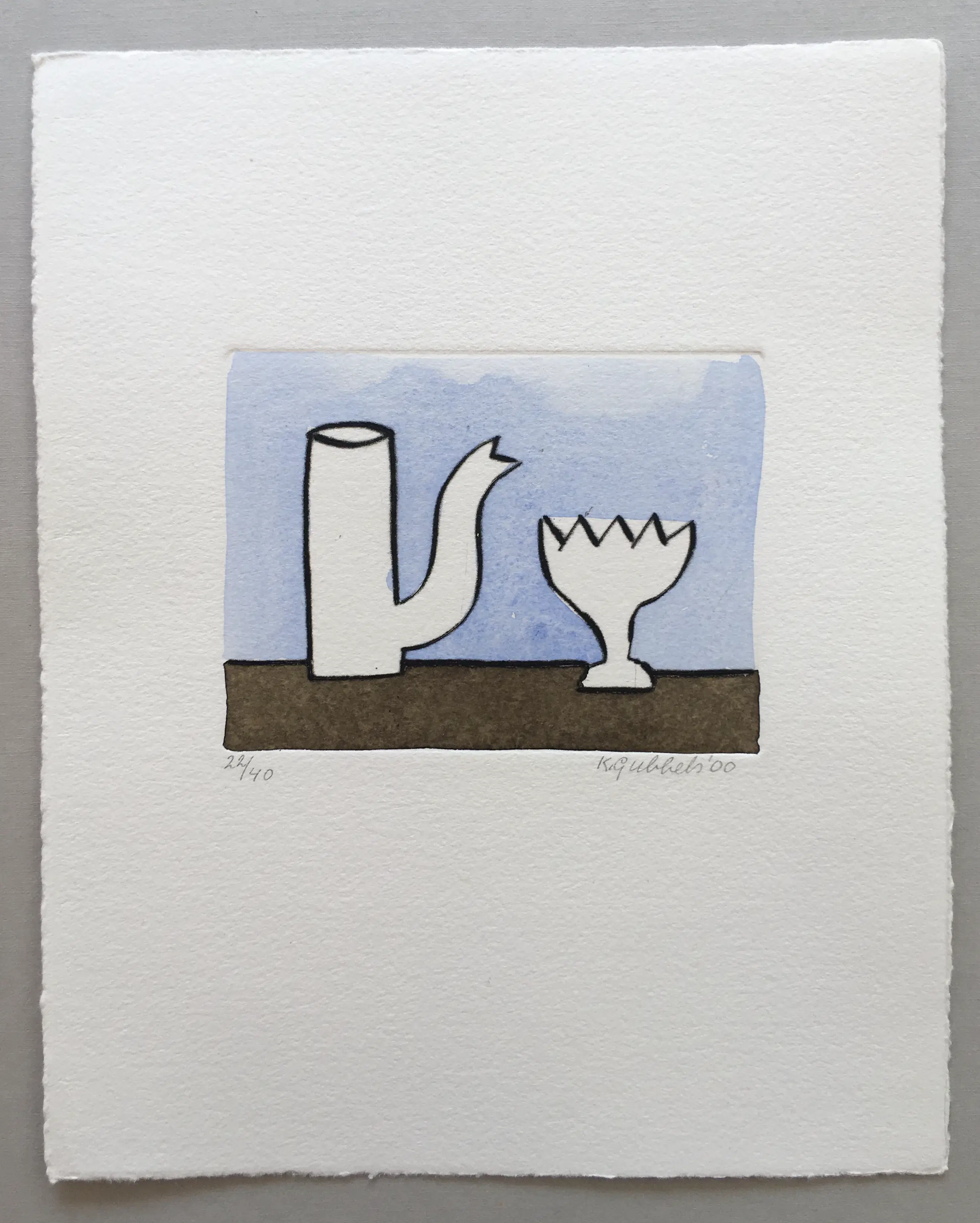 Deze fraaie ets van Klaas Gubbels uit 2000 is handmatig ingekleurd met aquarel. Ieder exemplaar is daardoor uniek geworden. De ets is in zeer goede conditie.