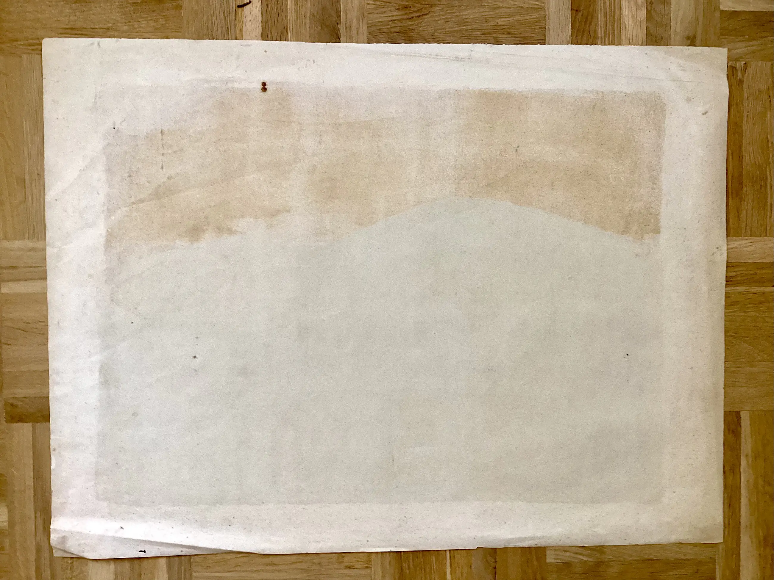 Papier aan twee hoeken licht gekreukt, aan zijkanten licht verkleurd. Afbeelding zelf is in goede staat.