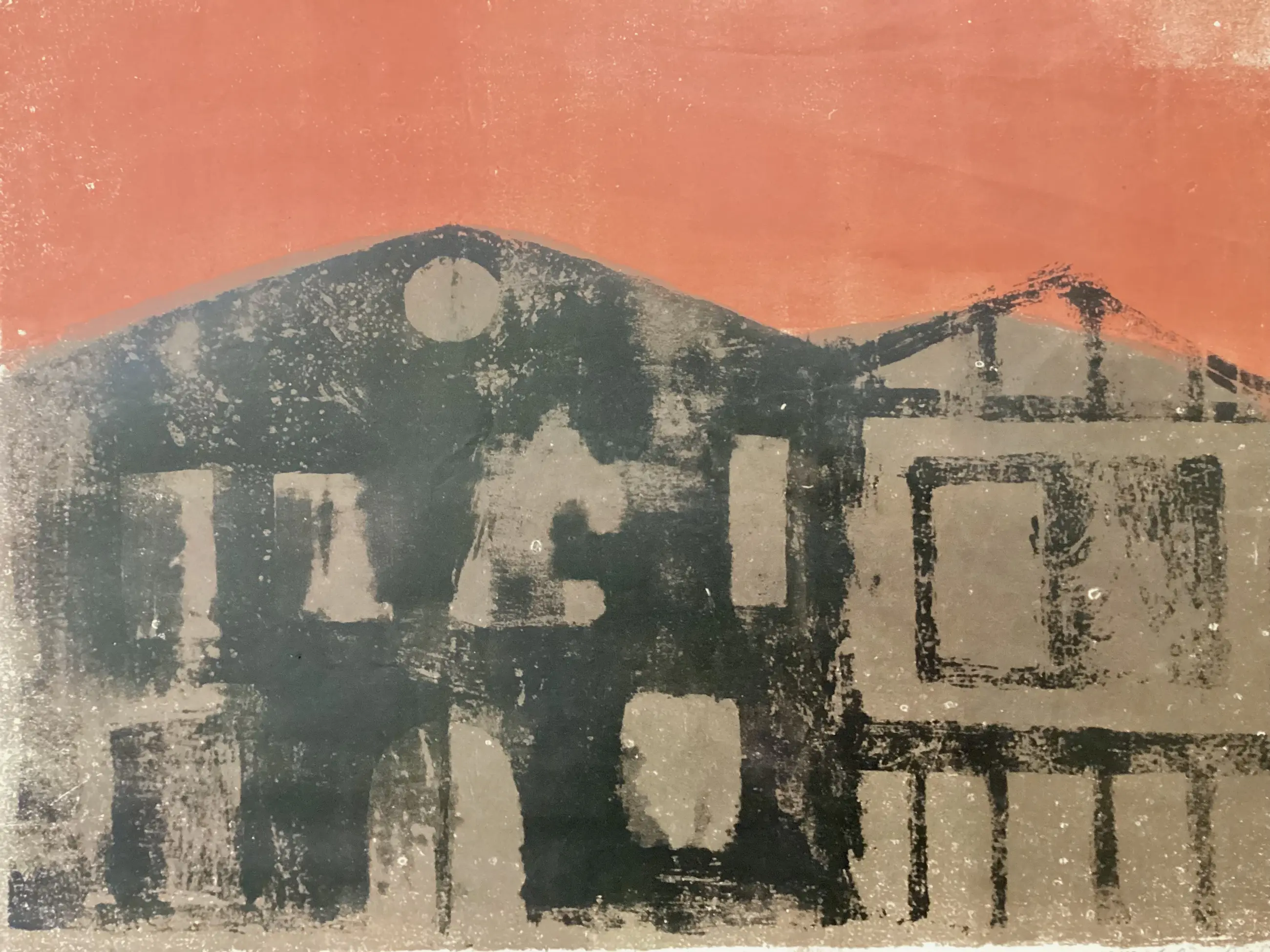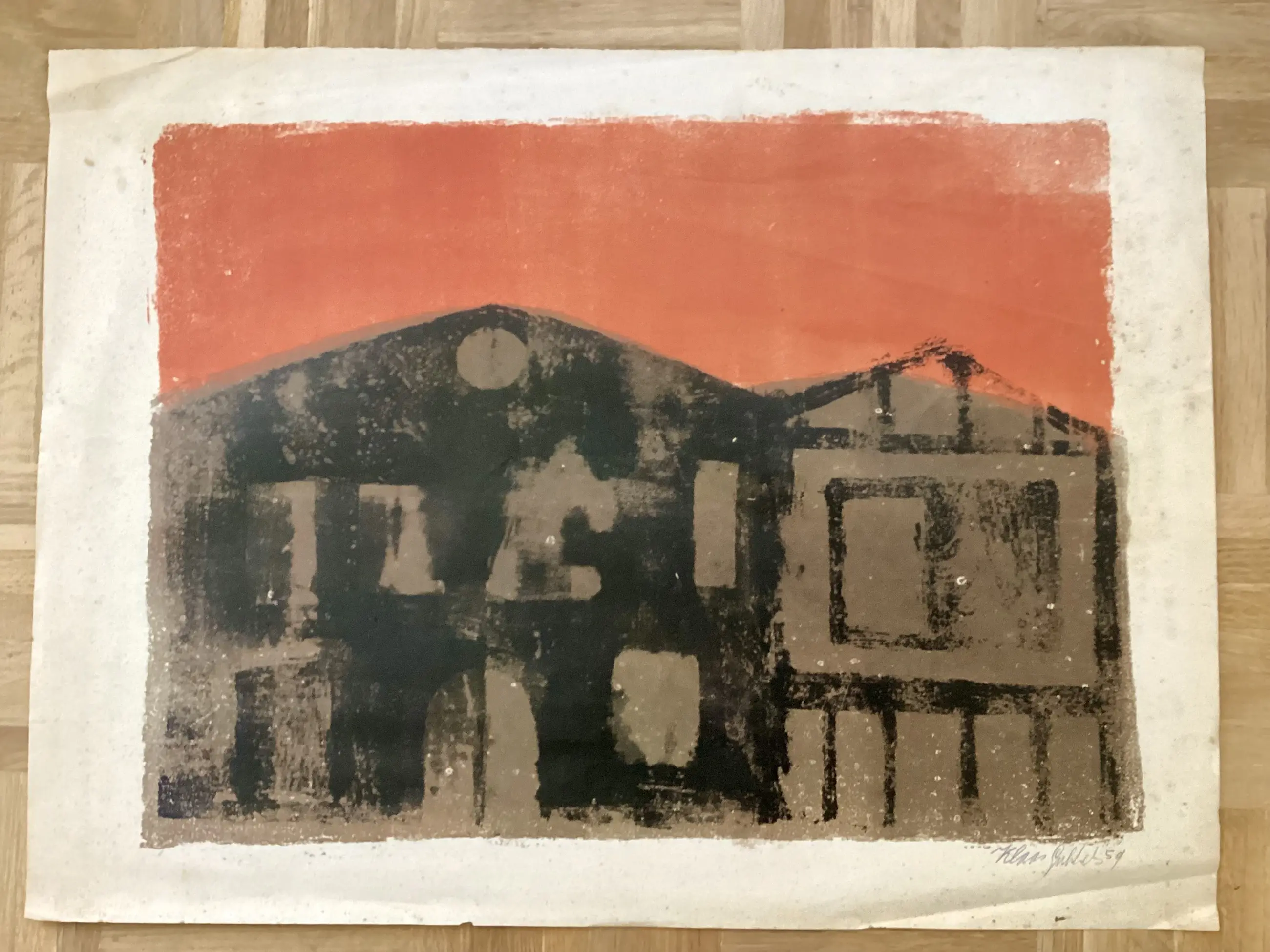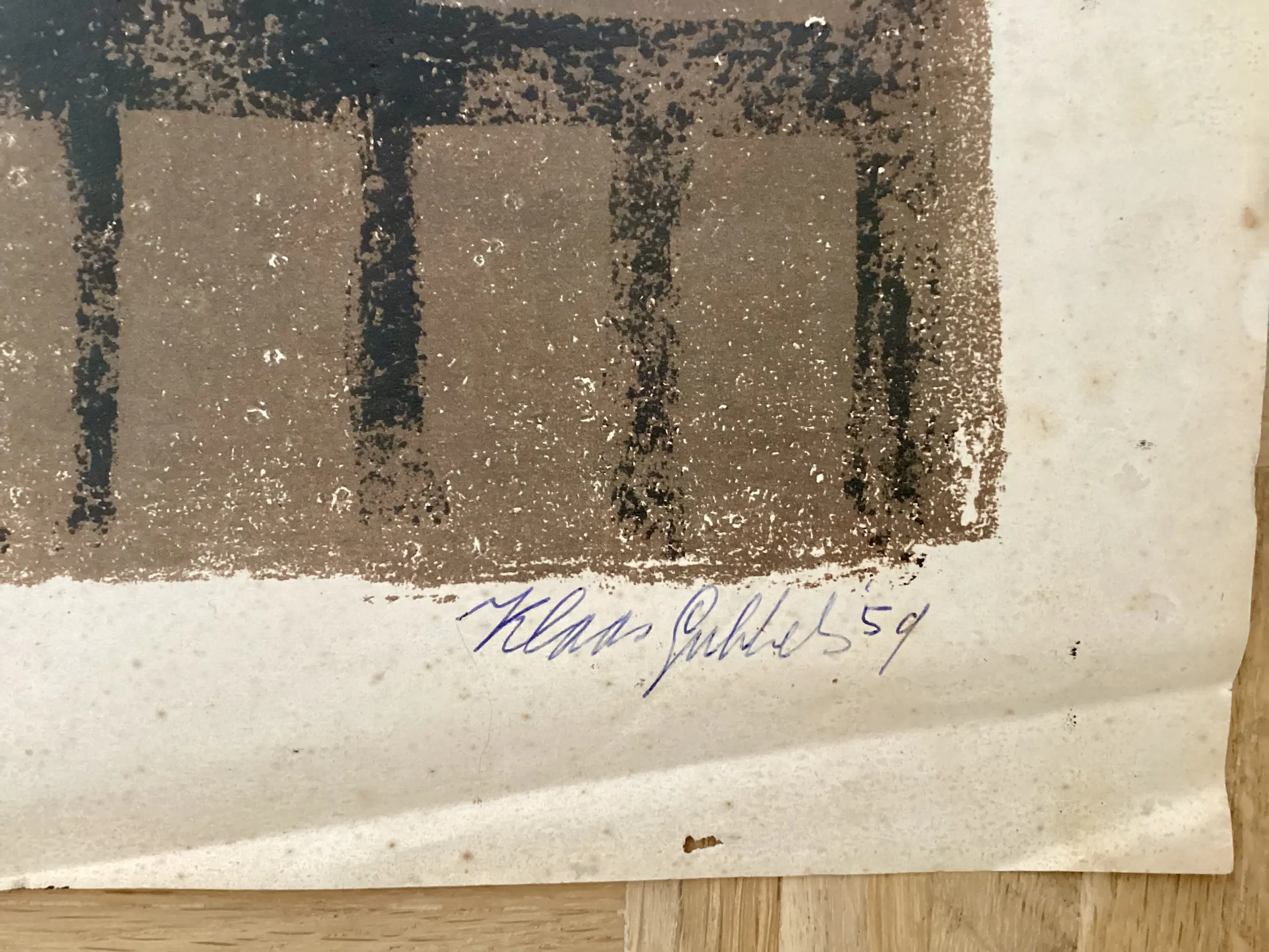 Litho van Klaas Gubbels, in 1959 geschonken aan vriend en collega Paul Schulz. Papier aan twee hoeken licht gekreukt.