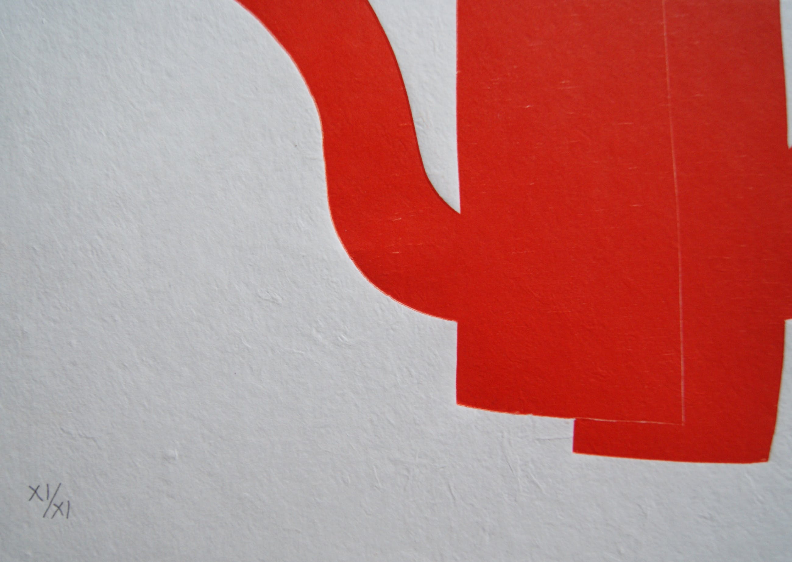 Het werk is uitgevoerd op handgeschept papier, in zijn typerende oranje kleur.