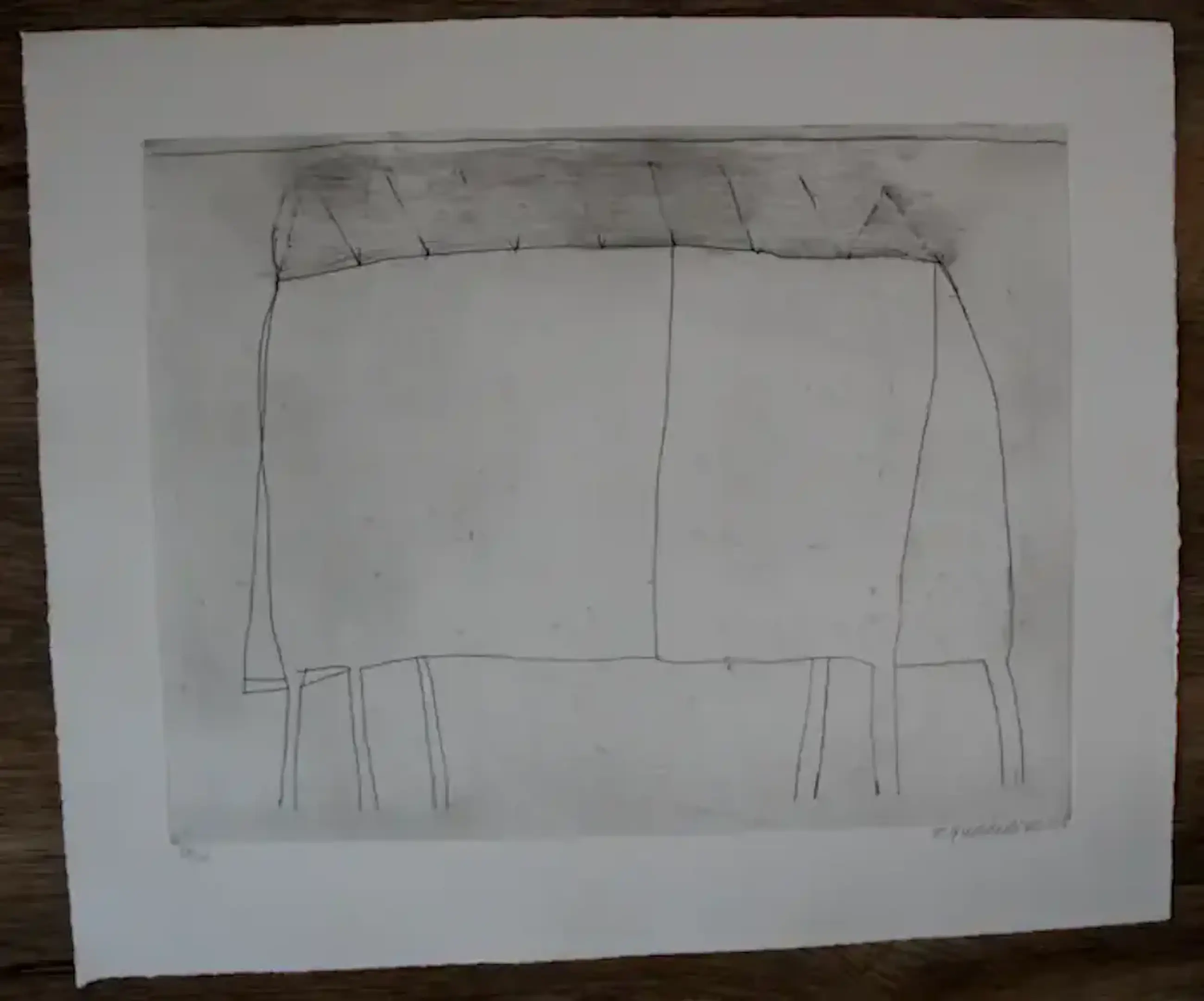 Etsen komt u weinig tegen van deze kunstenaar. Meestal maakt hij houtsnedes en Sjabloondrukken!