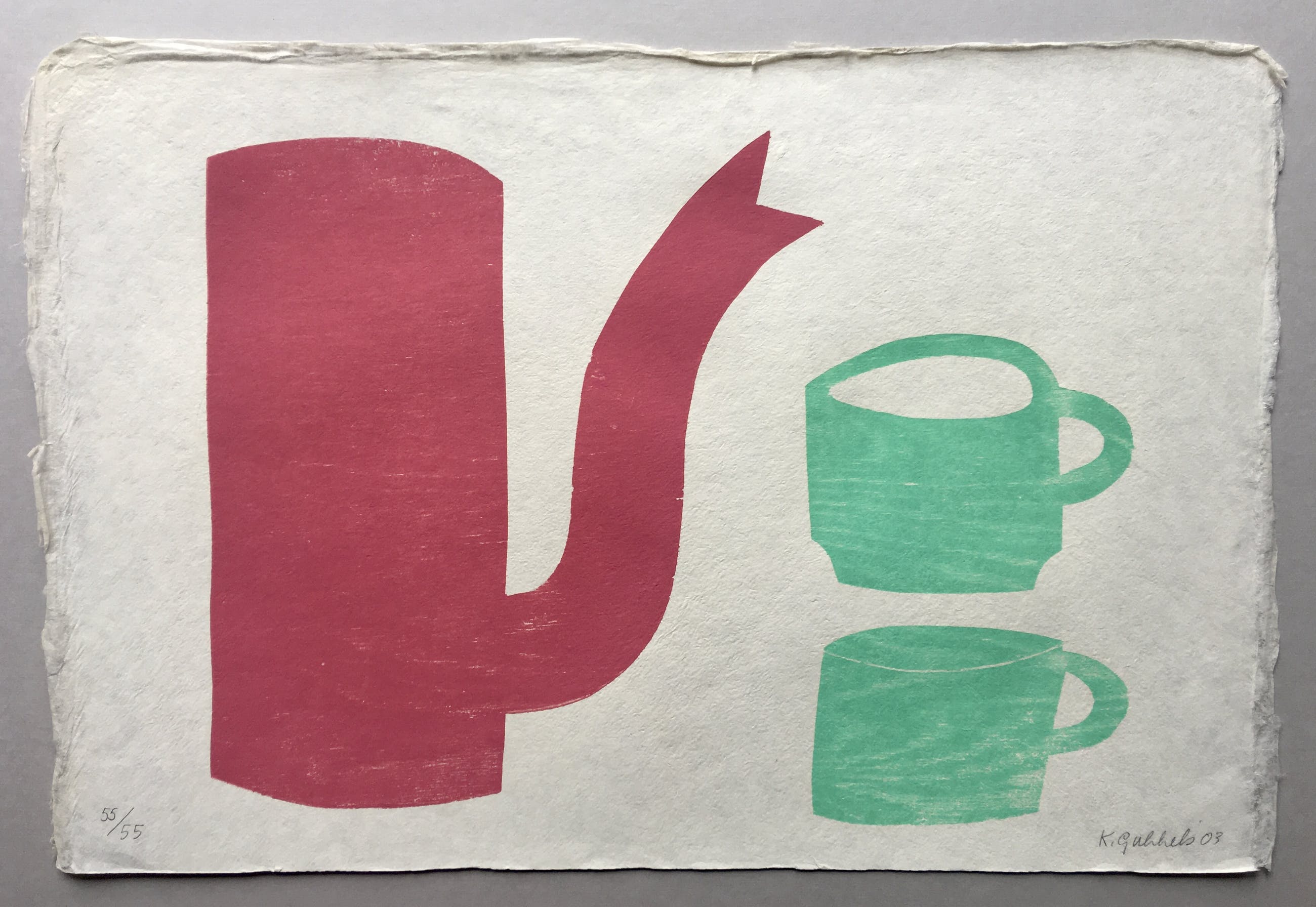 Een zeer fraaie houtdruk van Klaas Gubbels, ‘Rode kan met groene kopjes’ op geschept papier uit 2003, oplage 55.