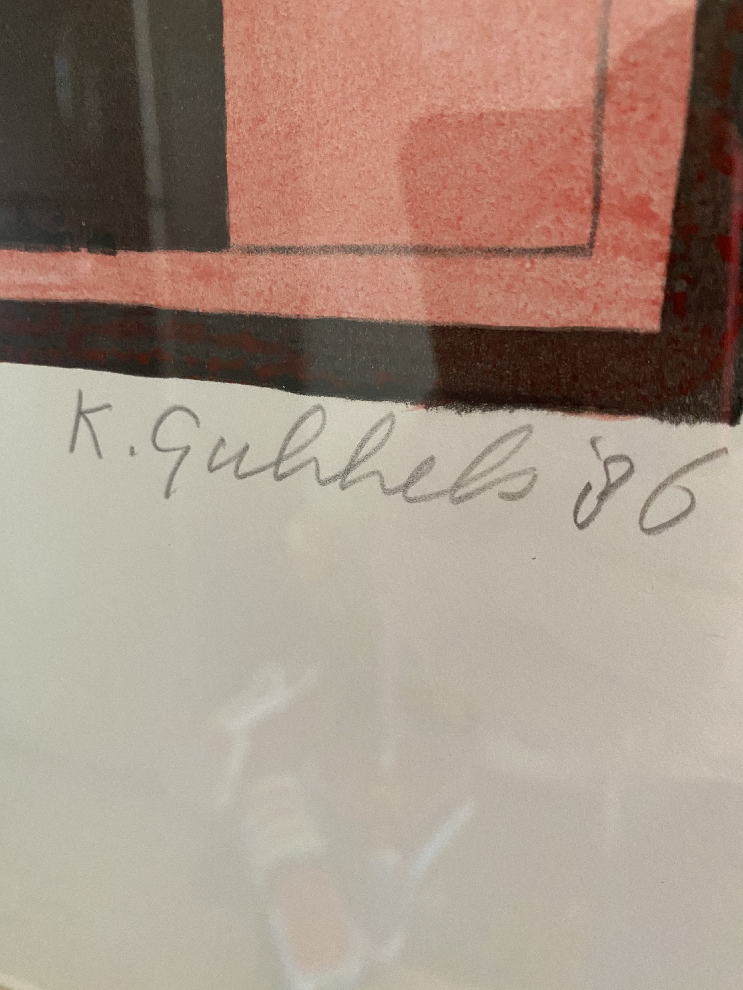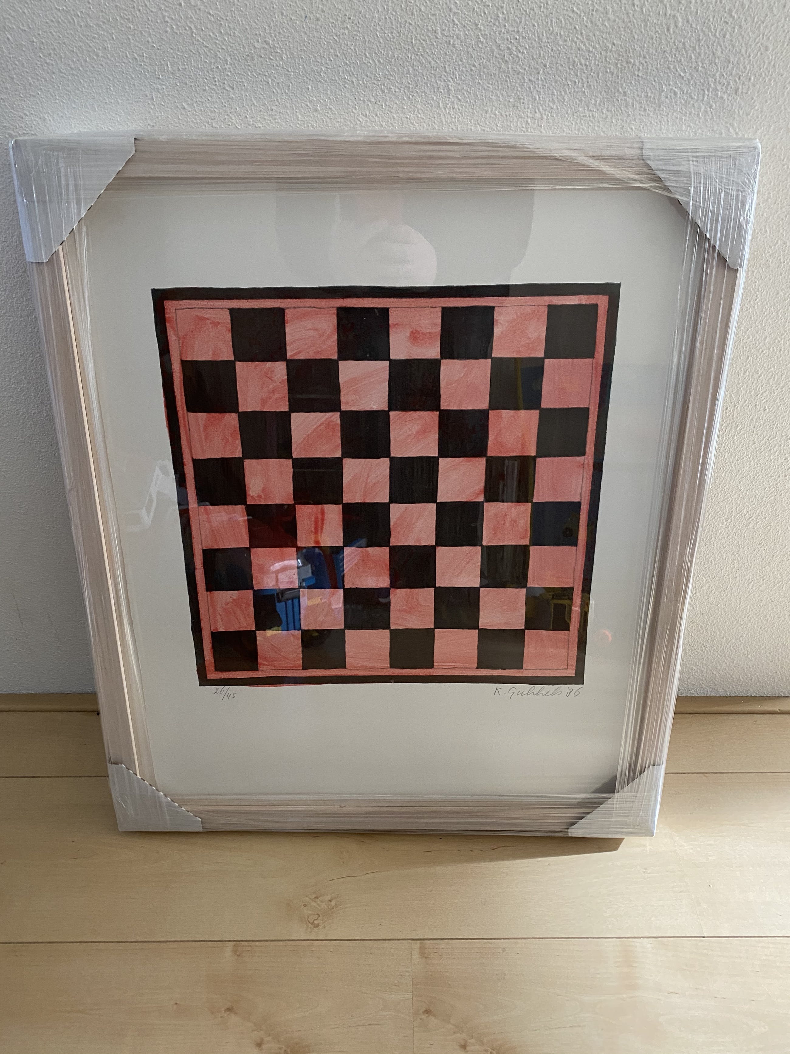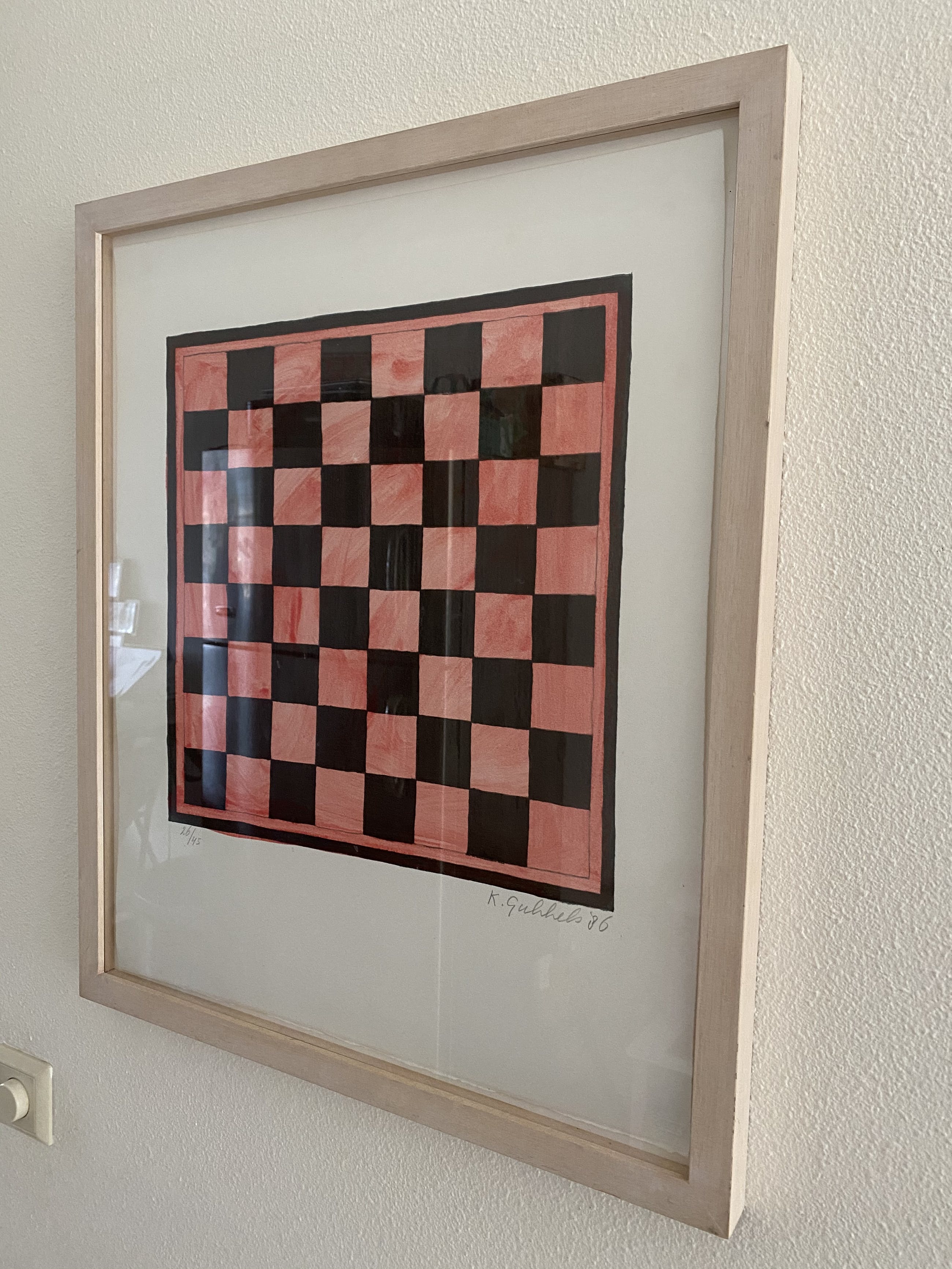 Door Klaas Gubbels met de hand ingekleurde zeefdruk wat het een uniek exemplaar maakt, ingelijst in een typische Klaas Gubbels lijst.