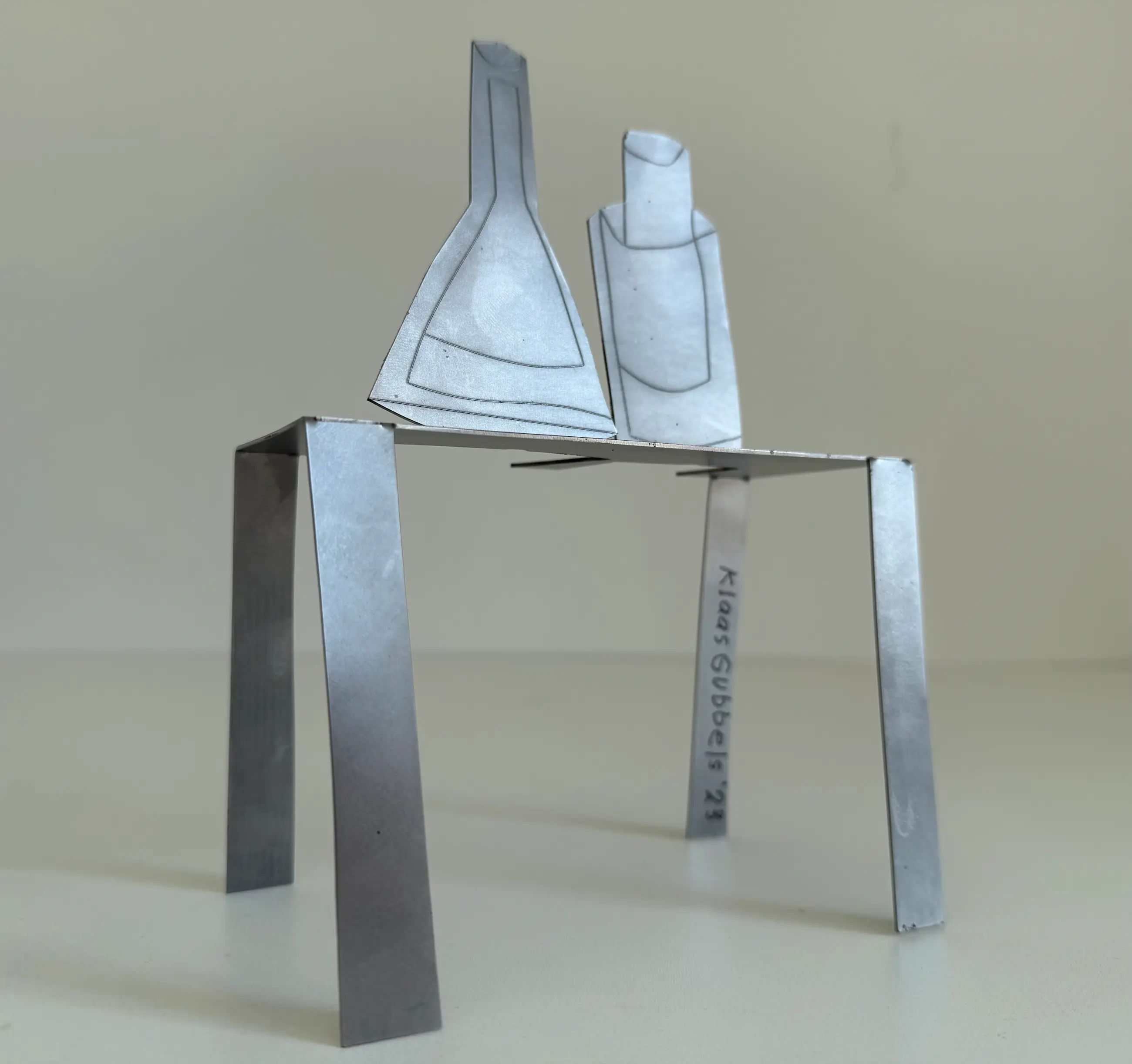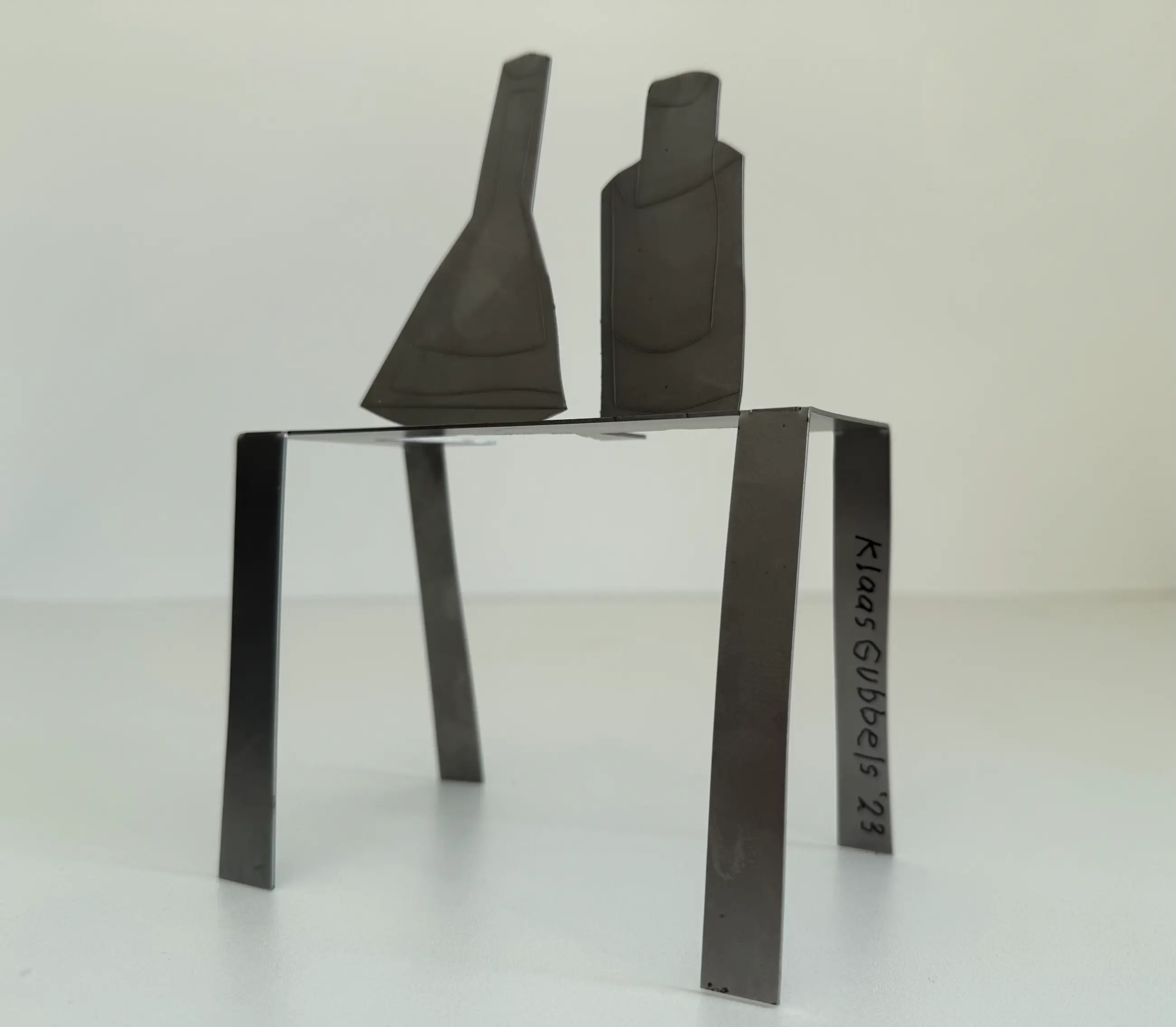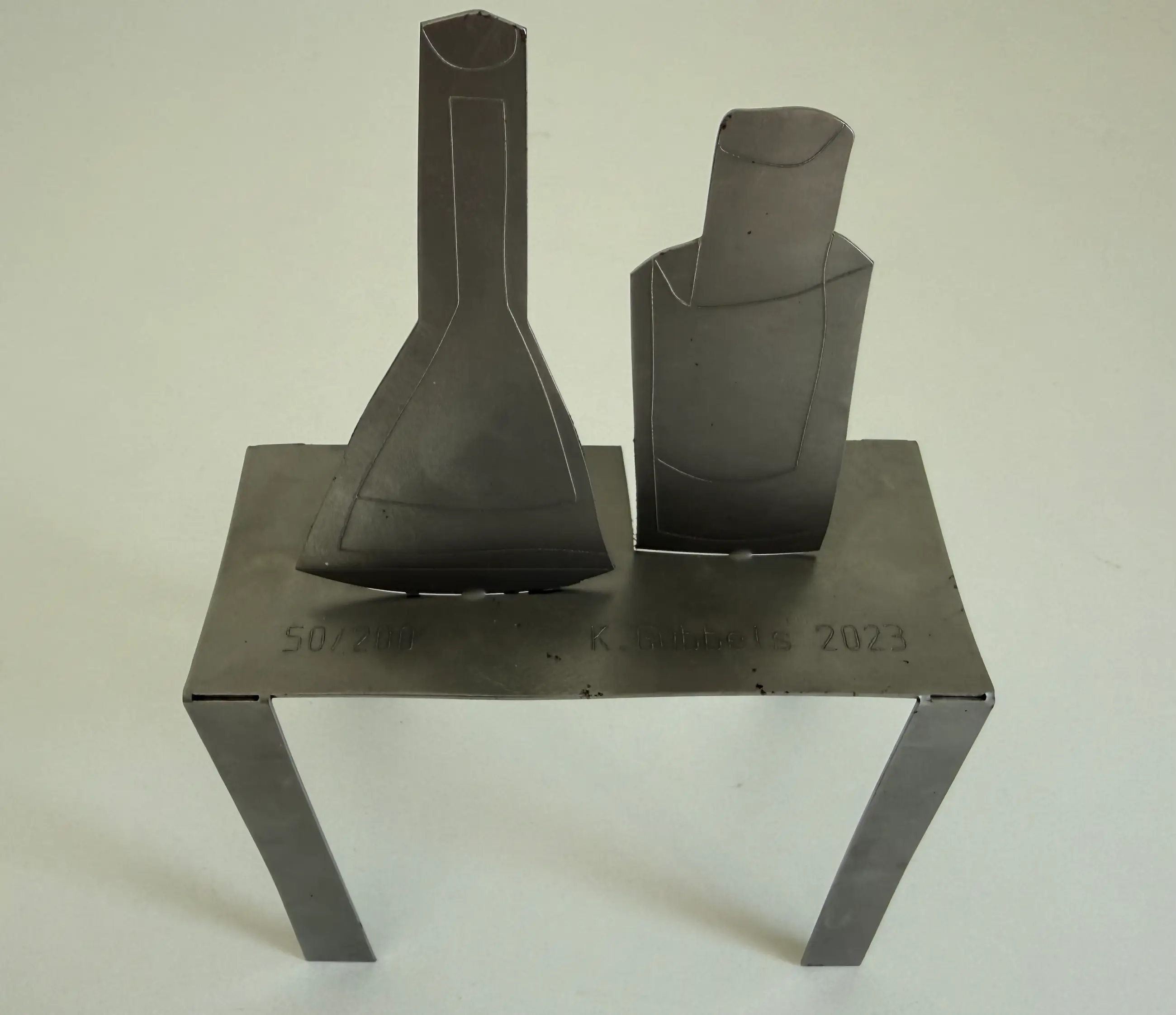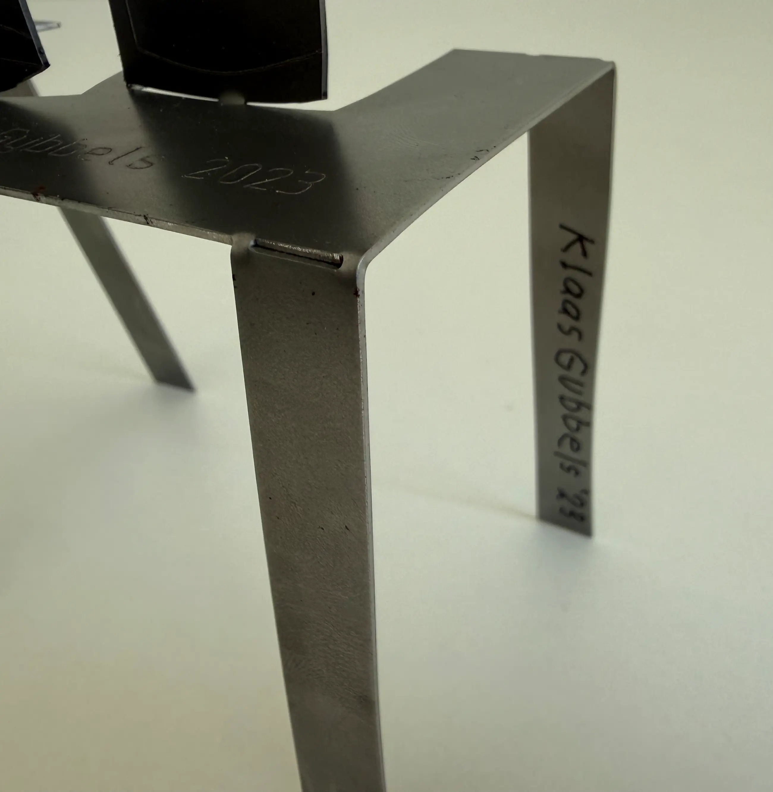 Op de bovenzijde ingestanst met het oplagenummer en K.Gubbels 2023. Op één van de poten van de tafel nogmaals voluit gesigneerd met stift 'Klaas Gubbels 2023'.