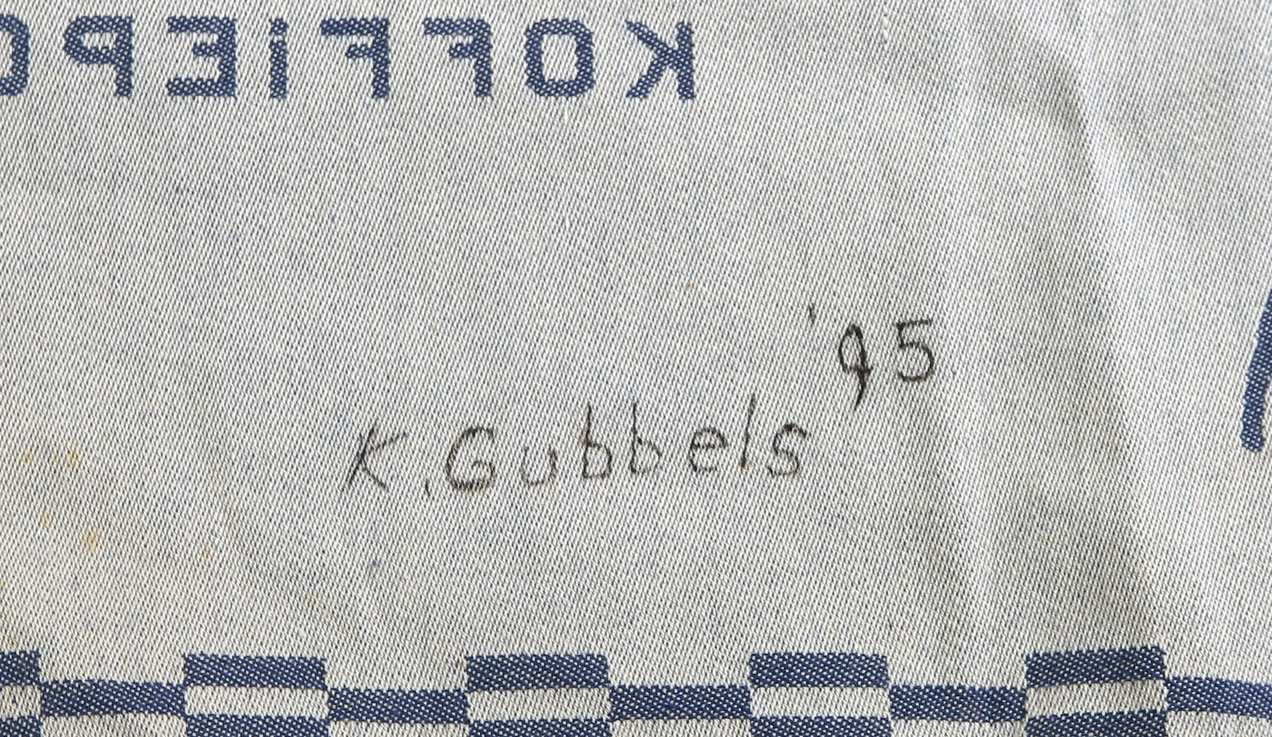 Handgesigneerde theedoek, uitgegeven door SBK Gelderland, in een oplage van 300 exemplaren. Dit is nummer 300/300.