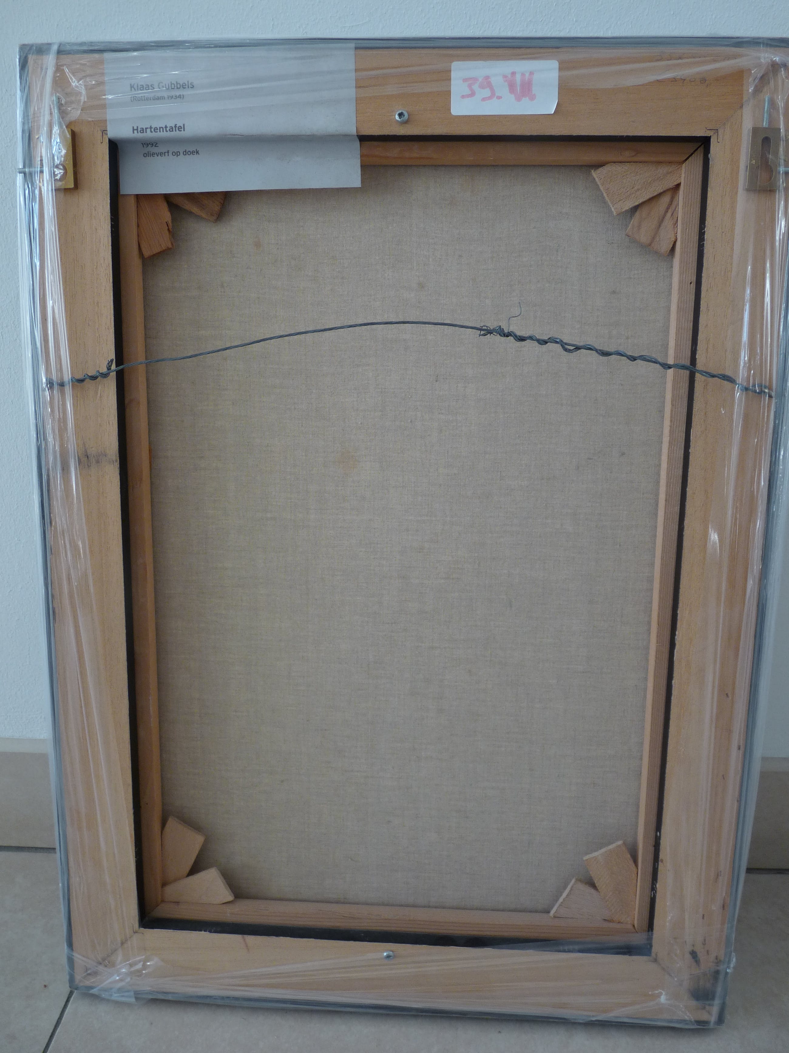 Afmeting doek 50 x 35 cm. Inclusief baklijst 55,5 x 40,5 cm. Titel HARTENTAFEL uit 1992.
