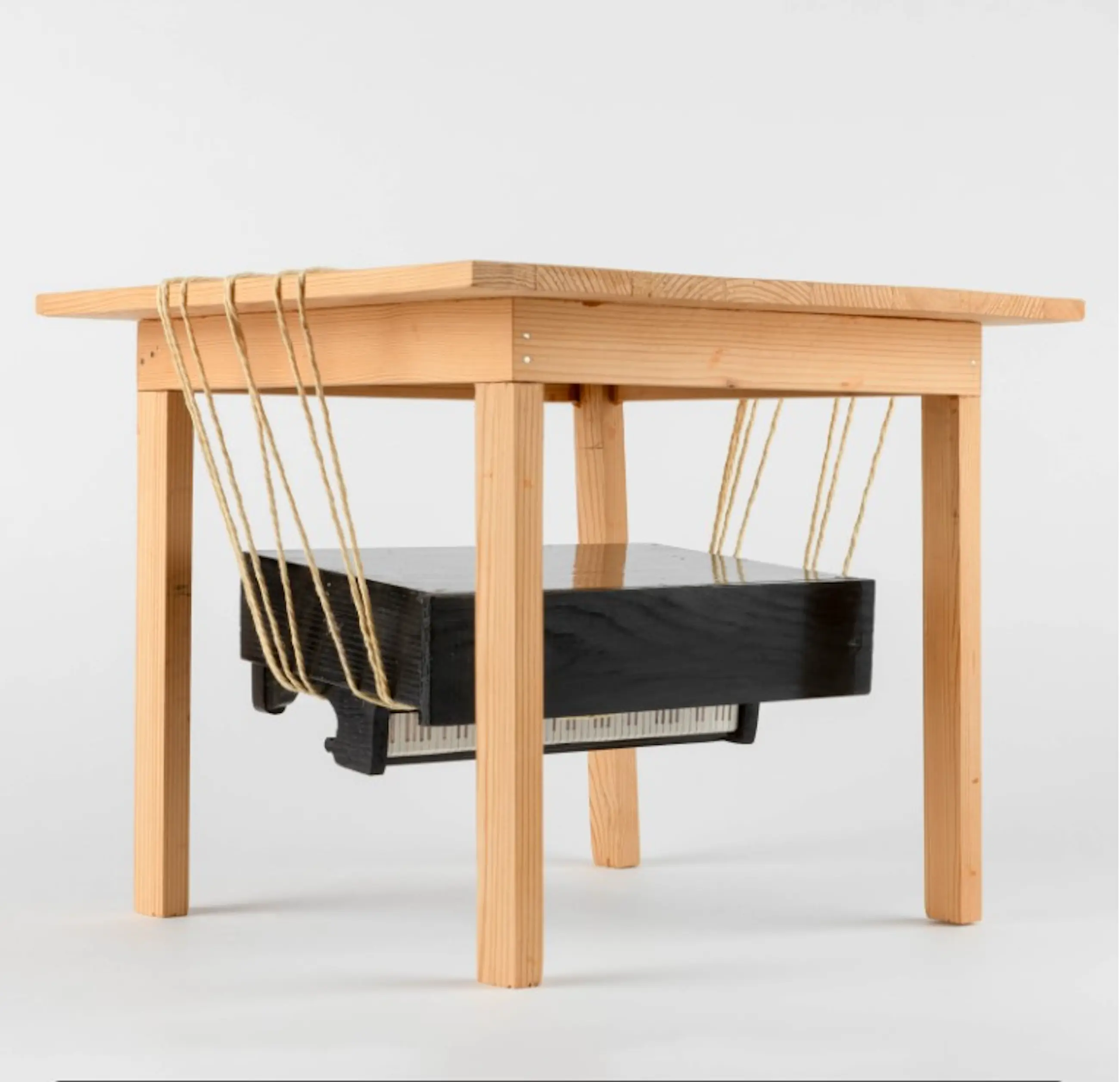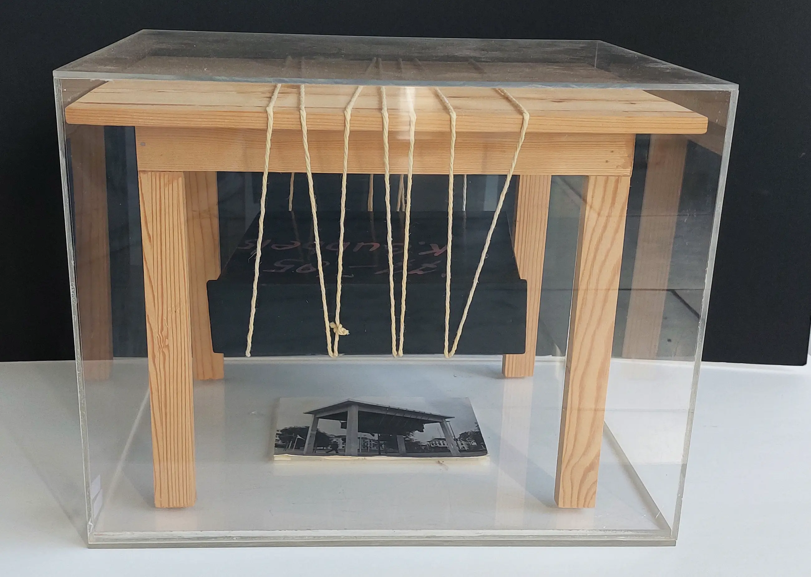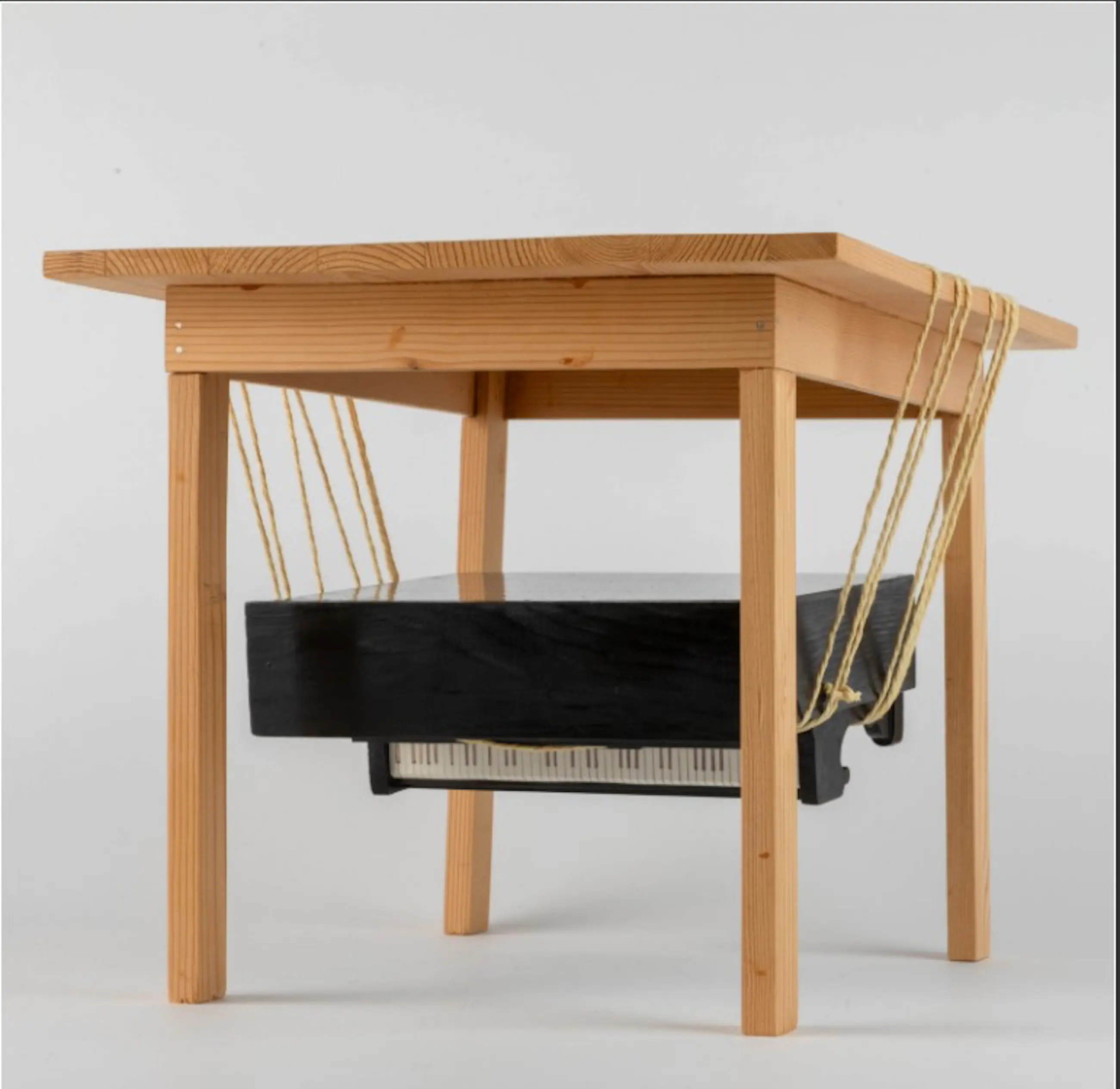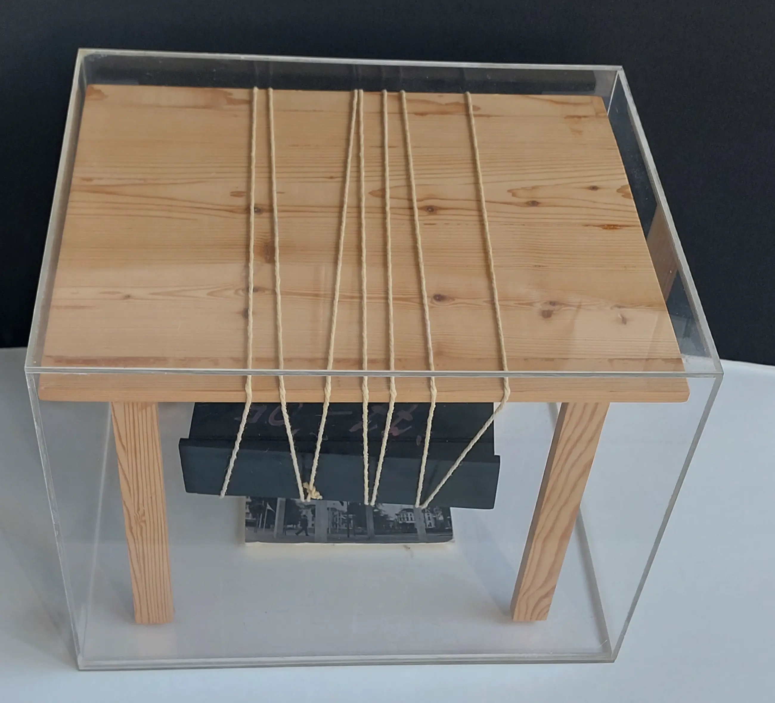 Assemblage van een zwart beschilderde piano met koorden vastgehouden aan Houten tafel met originele zwart wit foto van de originele installation op het Gele Rijderspkein te Arnhem in 1977