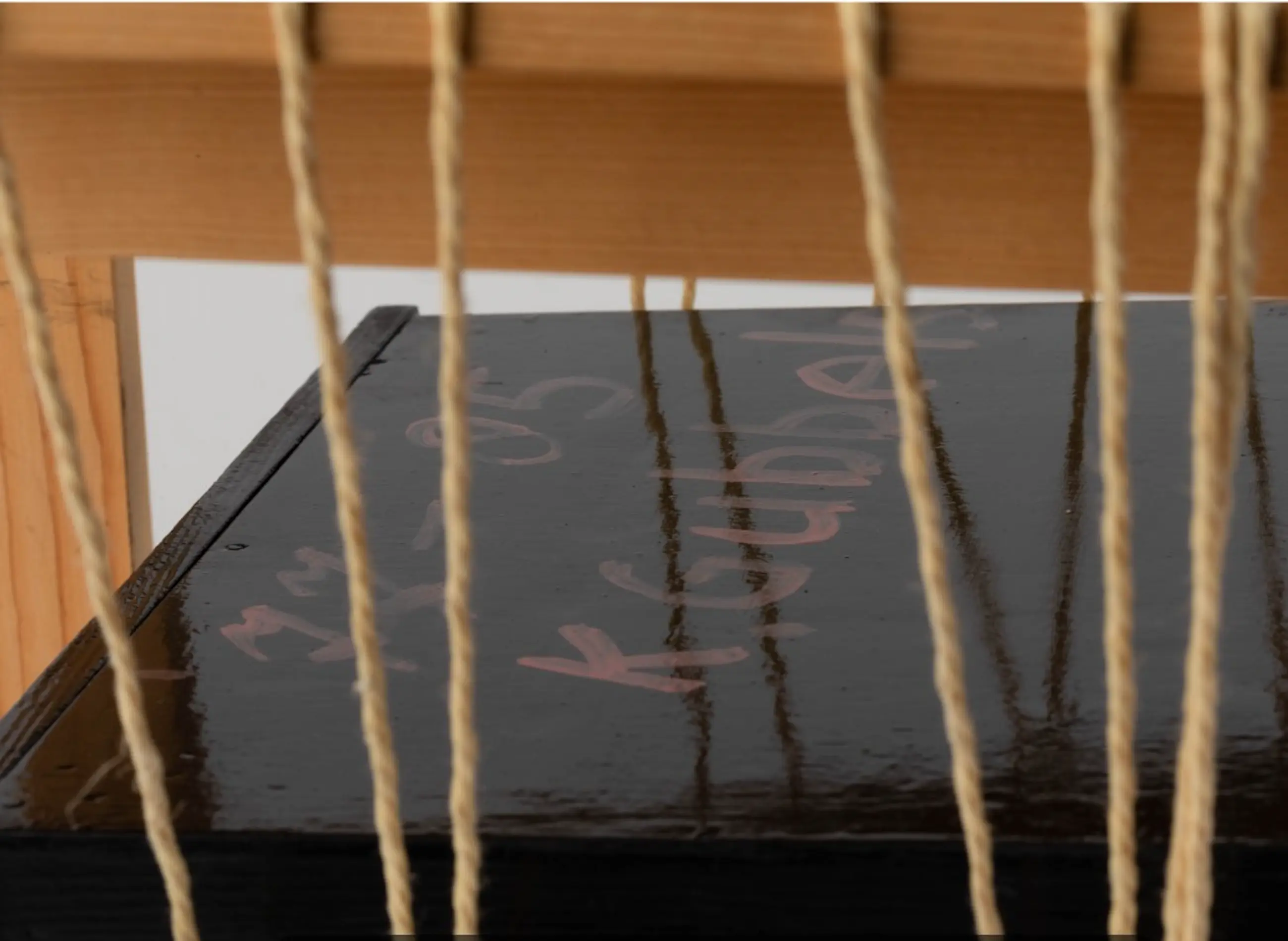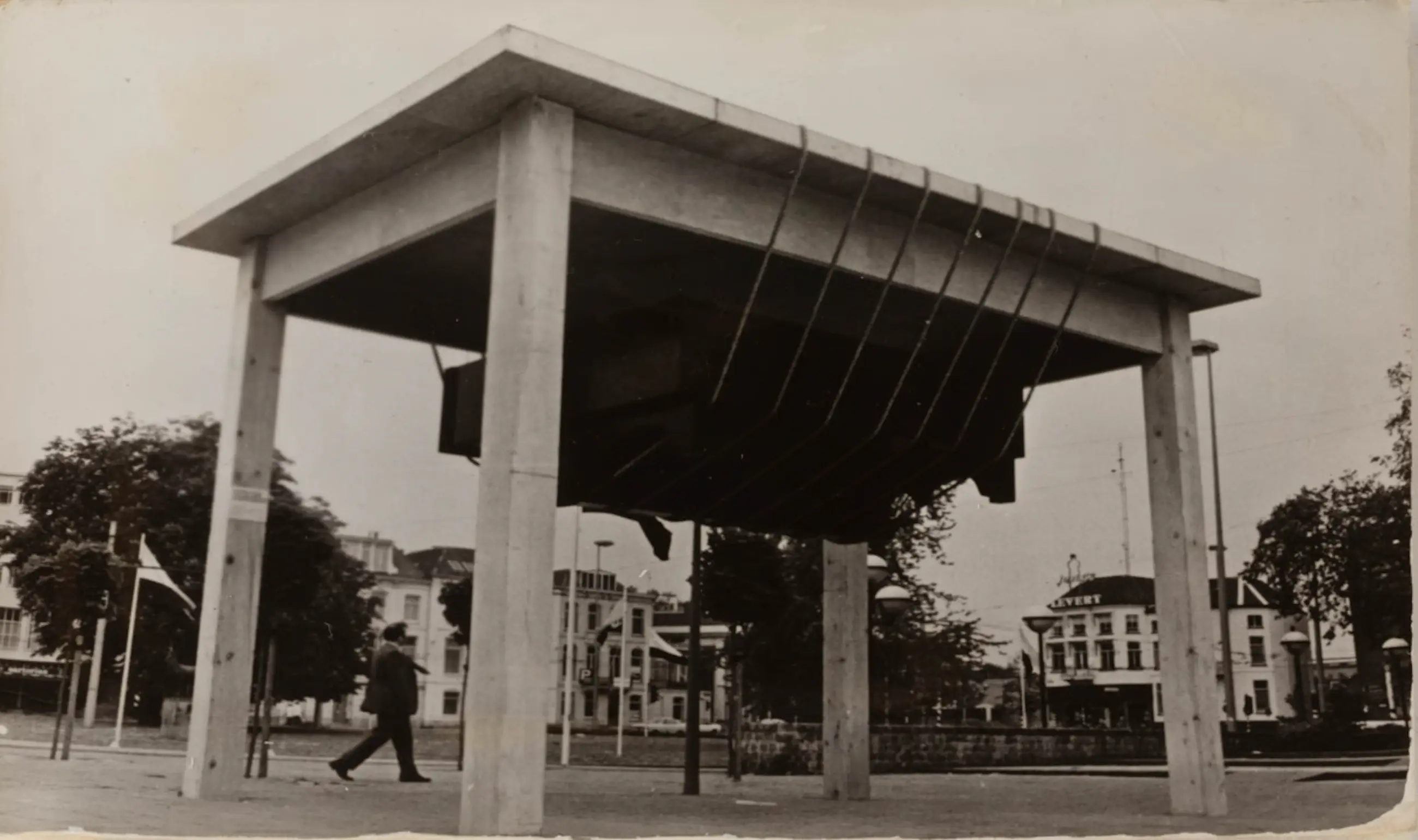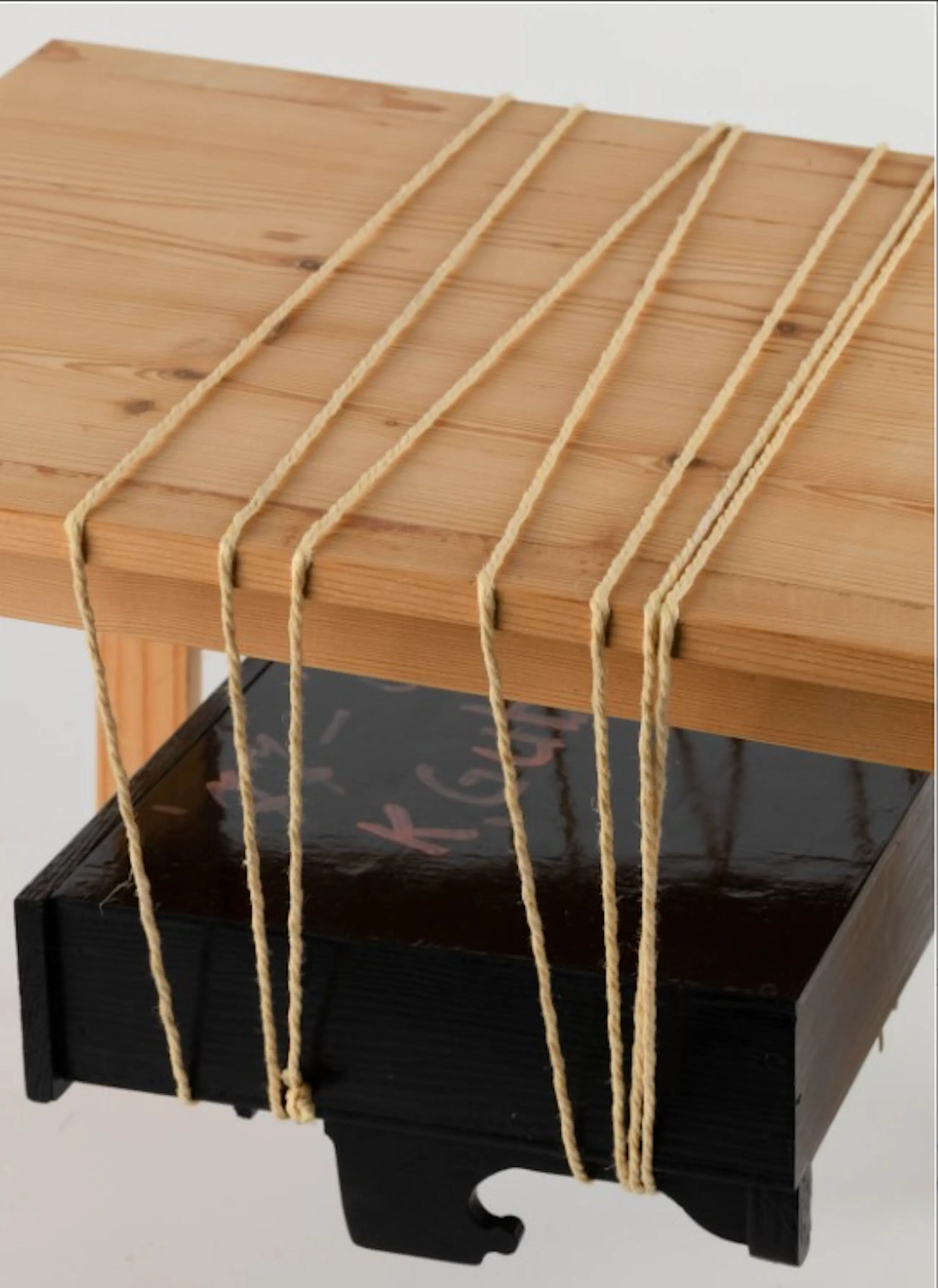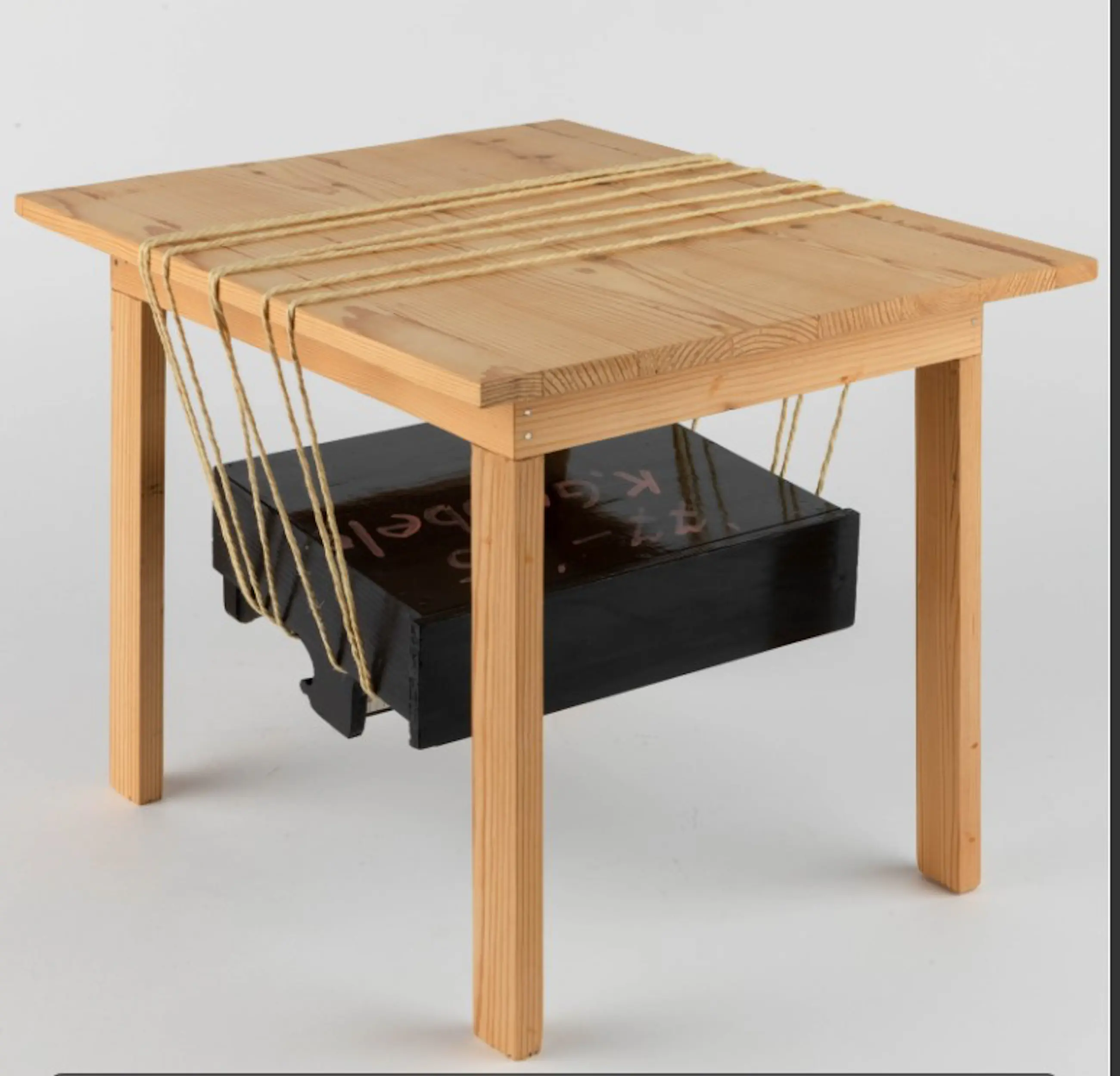 Assemblage van een zwart beschilderde piano met koorden vastgehouden aan Houten tafel met originele zwart wit foto van de originele installation op het Gele Rijderspkein te Arnhem in 1977