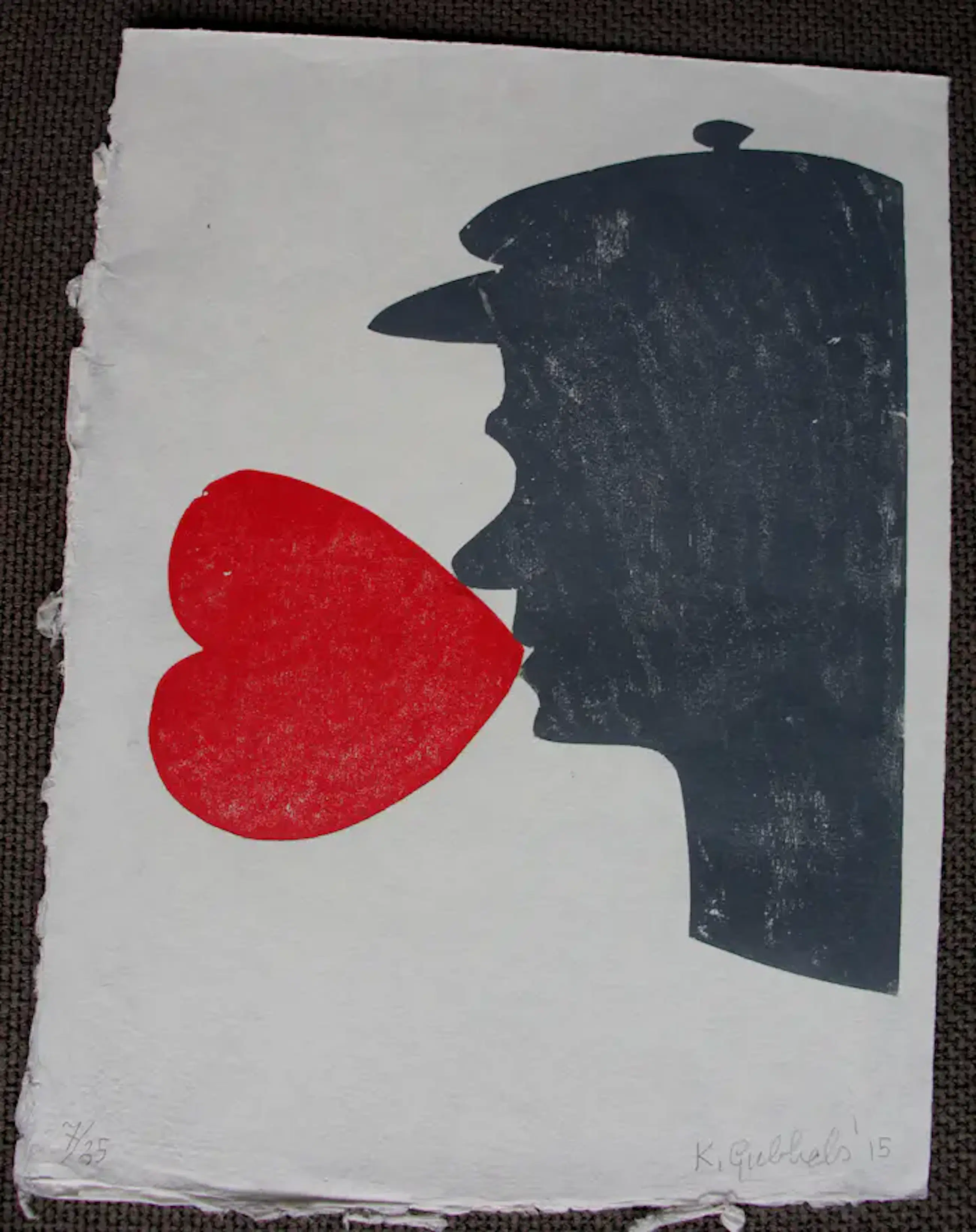 Houtdruk van Klaas Gubbels uit 2015. Titel: Hartenman. Nummer: 7/25. Afmetingen blad: H39.5 x b30.5cm. Afmetingen voorstelling: H30 x b25cm. Het werk is rechtsonder gesigneerd door de kunstenaar. De authenticiteit van dit werk wordt volledig gegarandeerd. Een certificaat van echtheid kan, op aanvraag, worden gemaild.