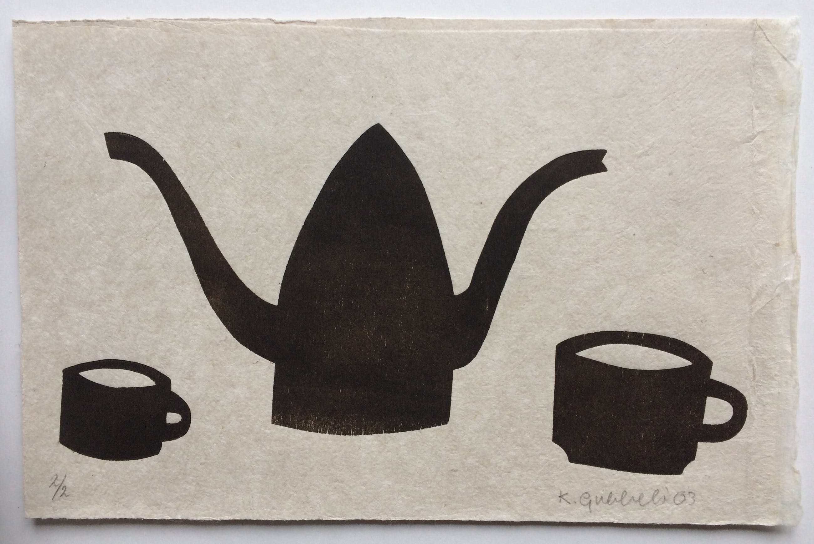 Een zeer fraaie houtdruk van Klaas Gubbels, getiteld 'Kan met twee kopjes' uit 2003.