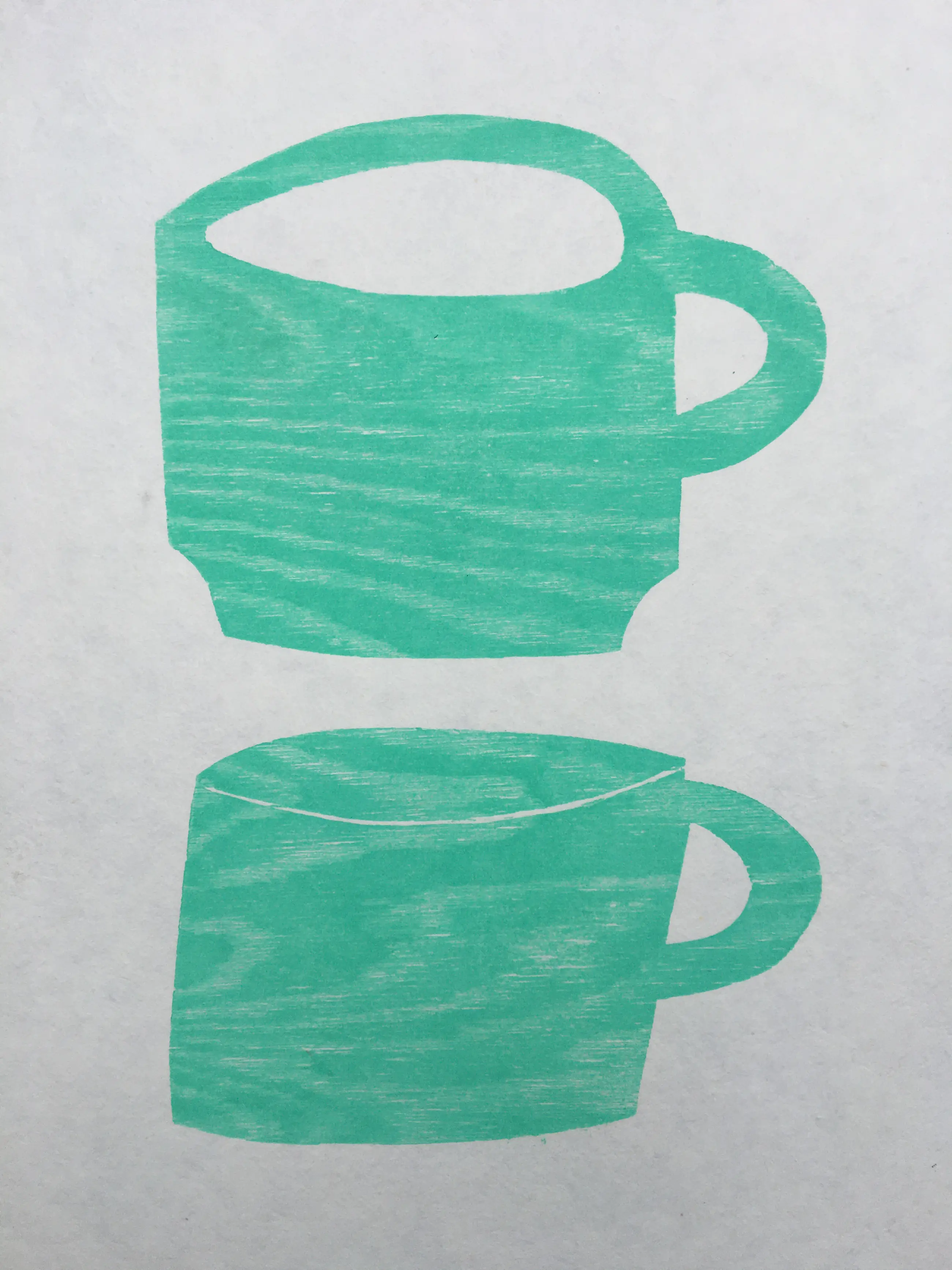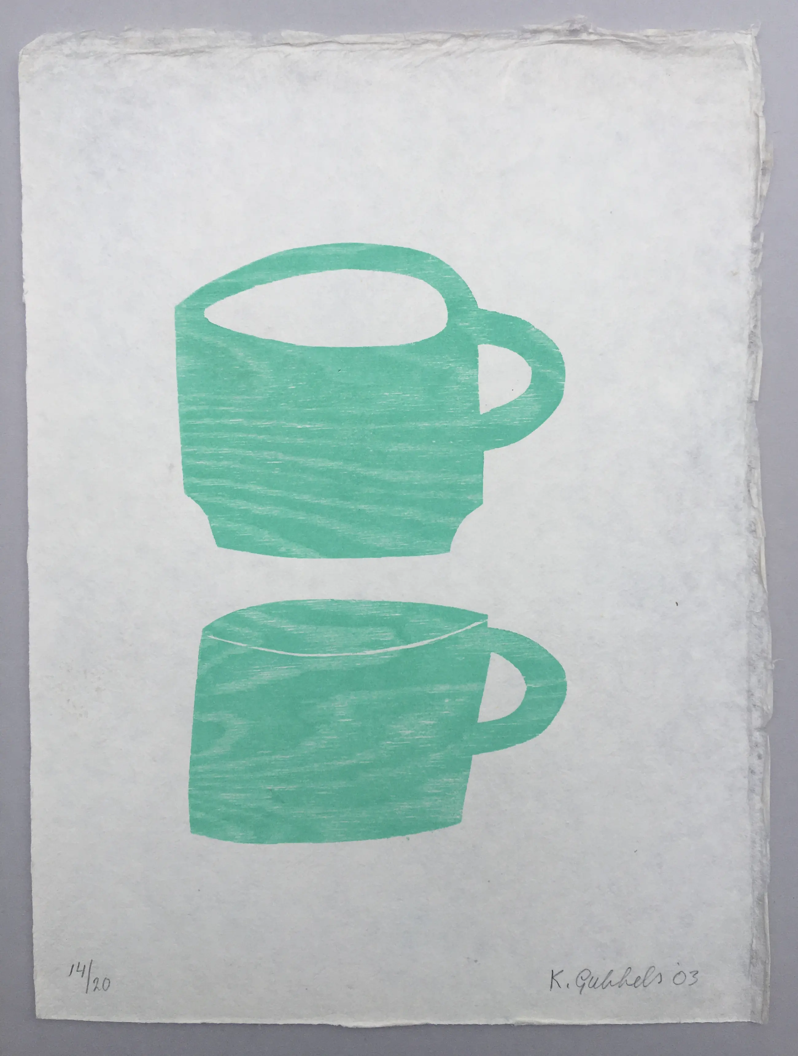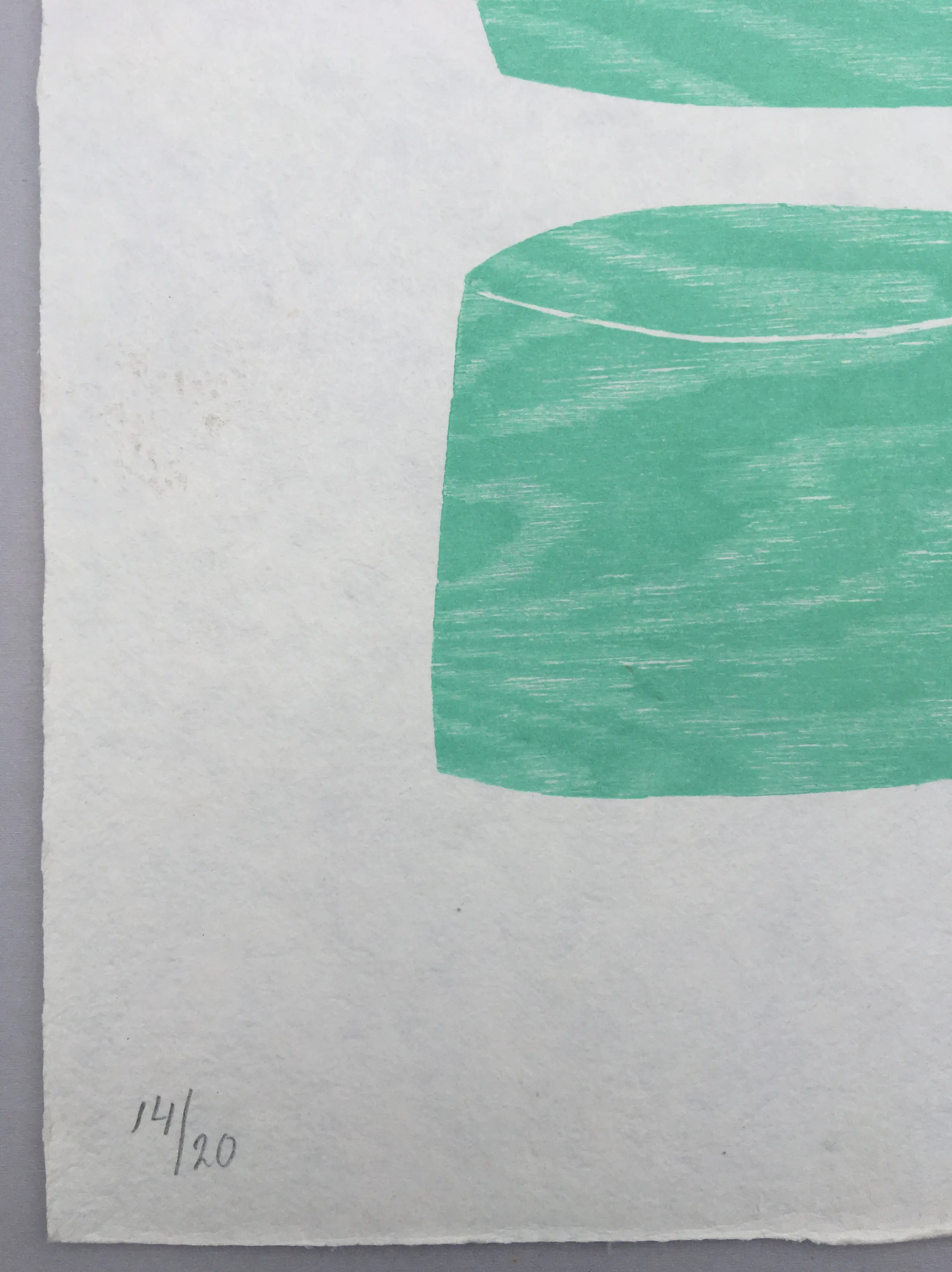 Een zeer fraaie houtdruk op geschept papier, van Klaas Gubbels, ‘Kopjes groen’ uit 2003 oplage 20ex.