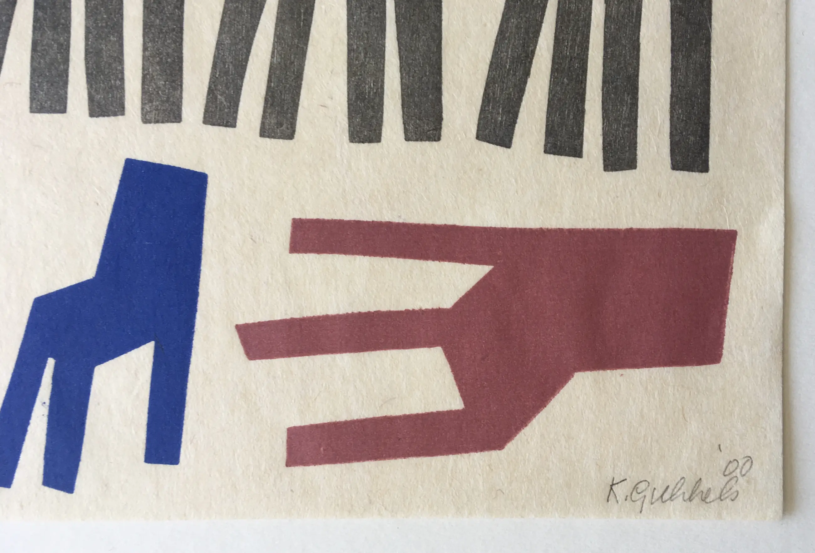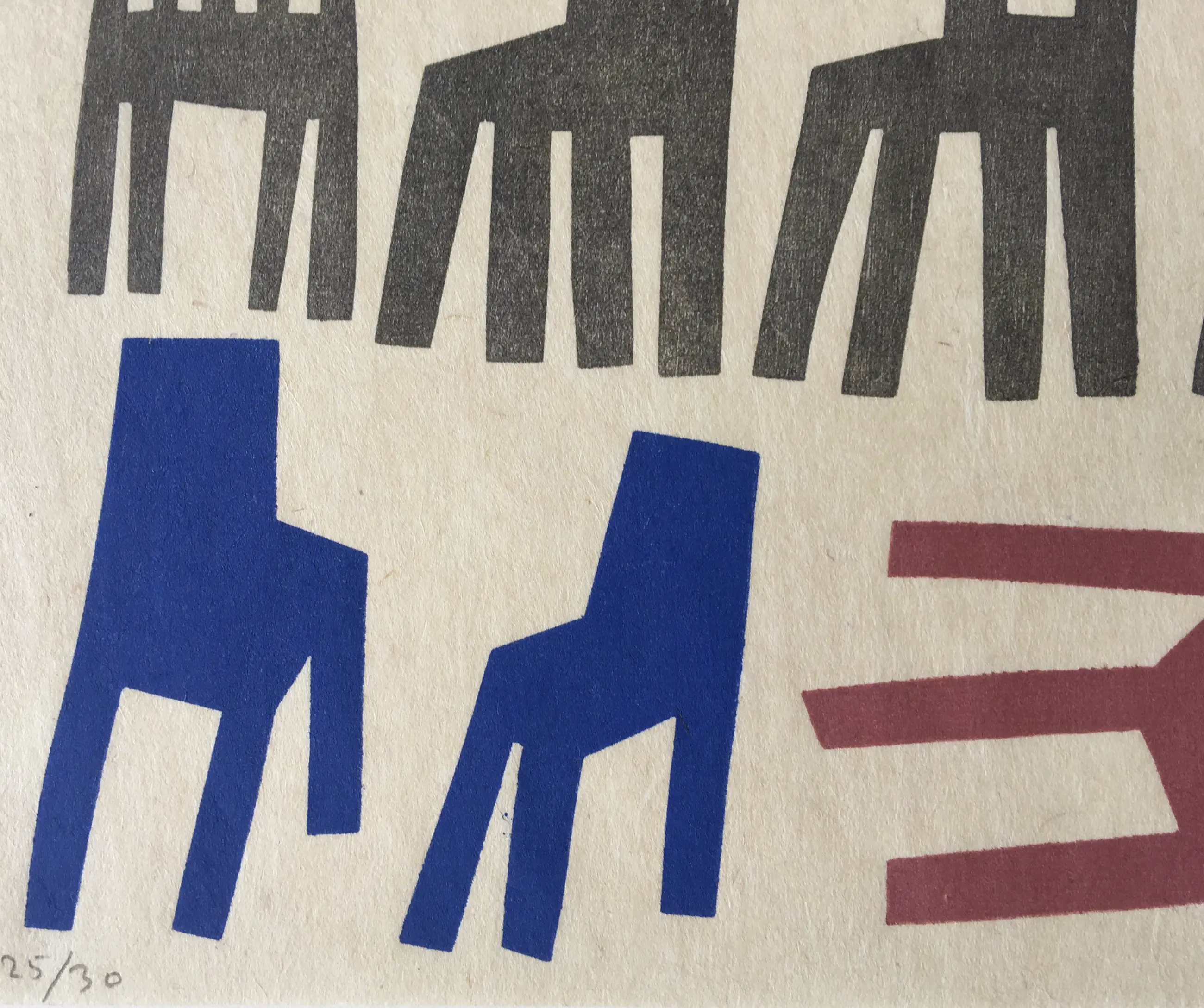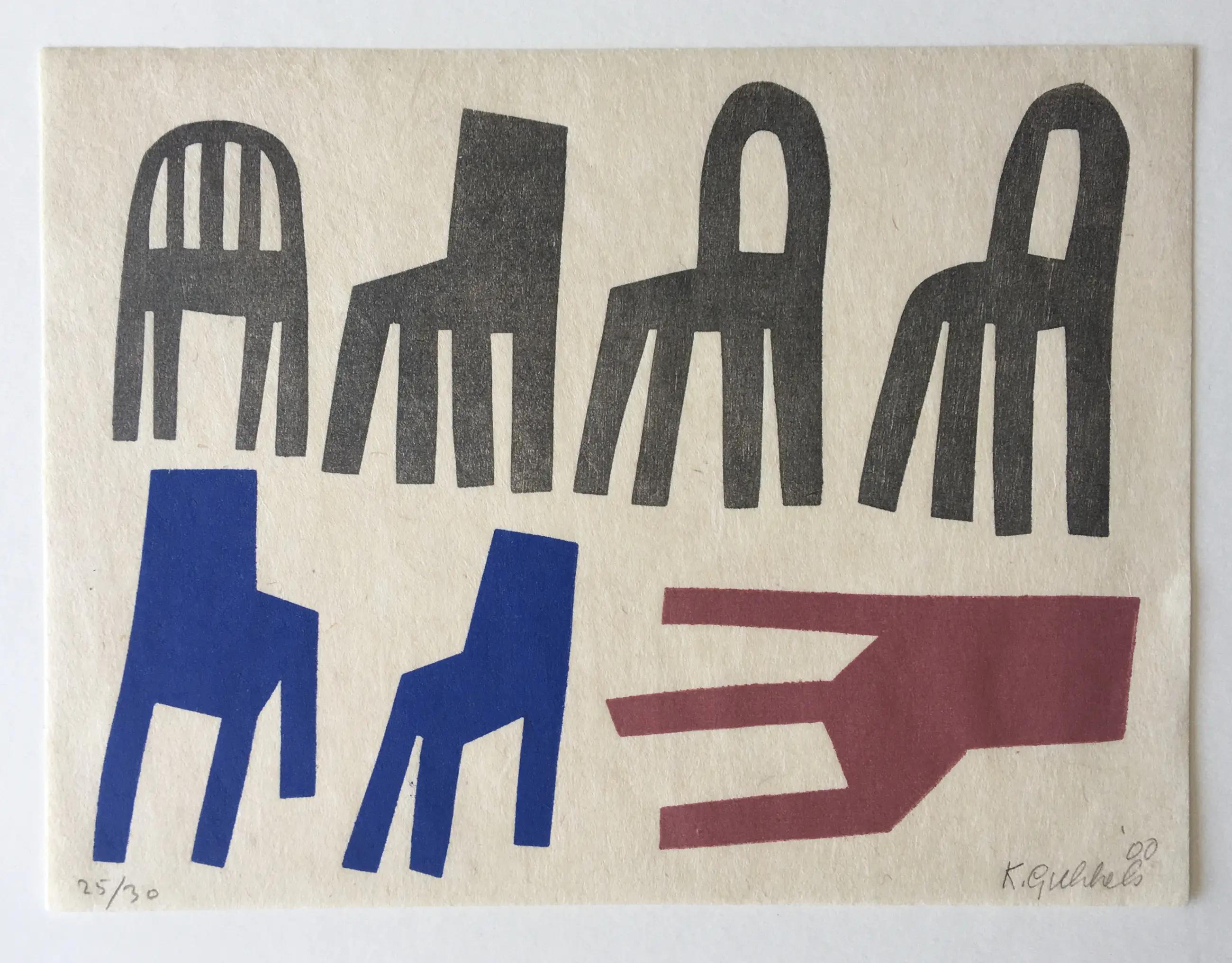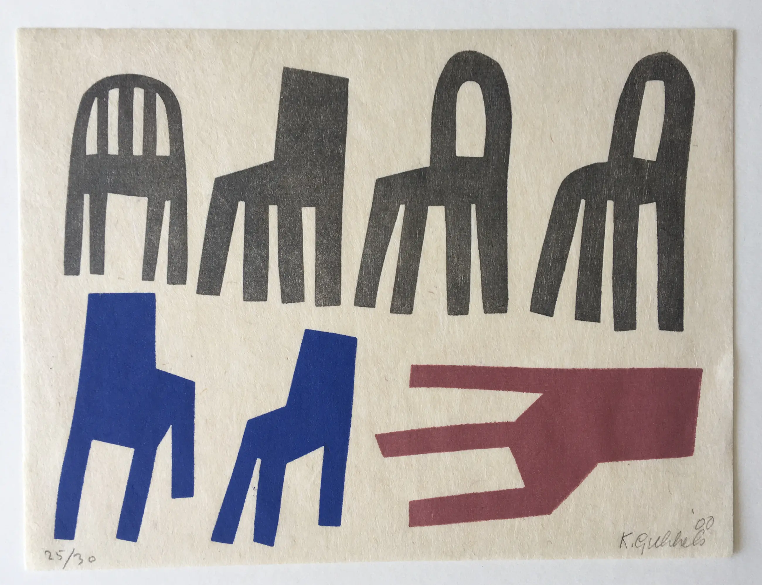 Een fraaie houtdruk van Klaas Gubbels uit 2000 - Stilleven met stoelen. Het werk is gesigneerd en genummerd 25/30.