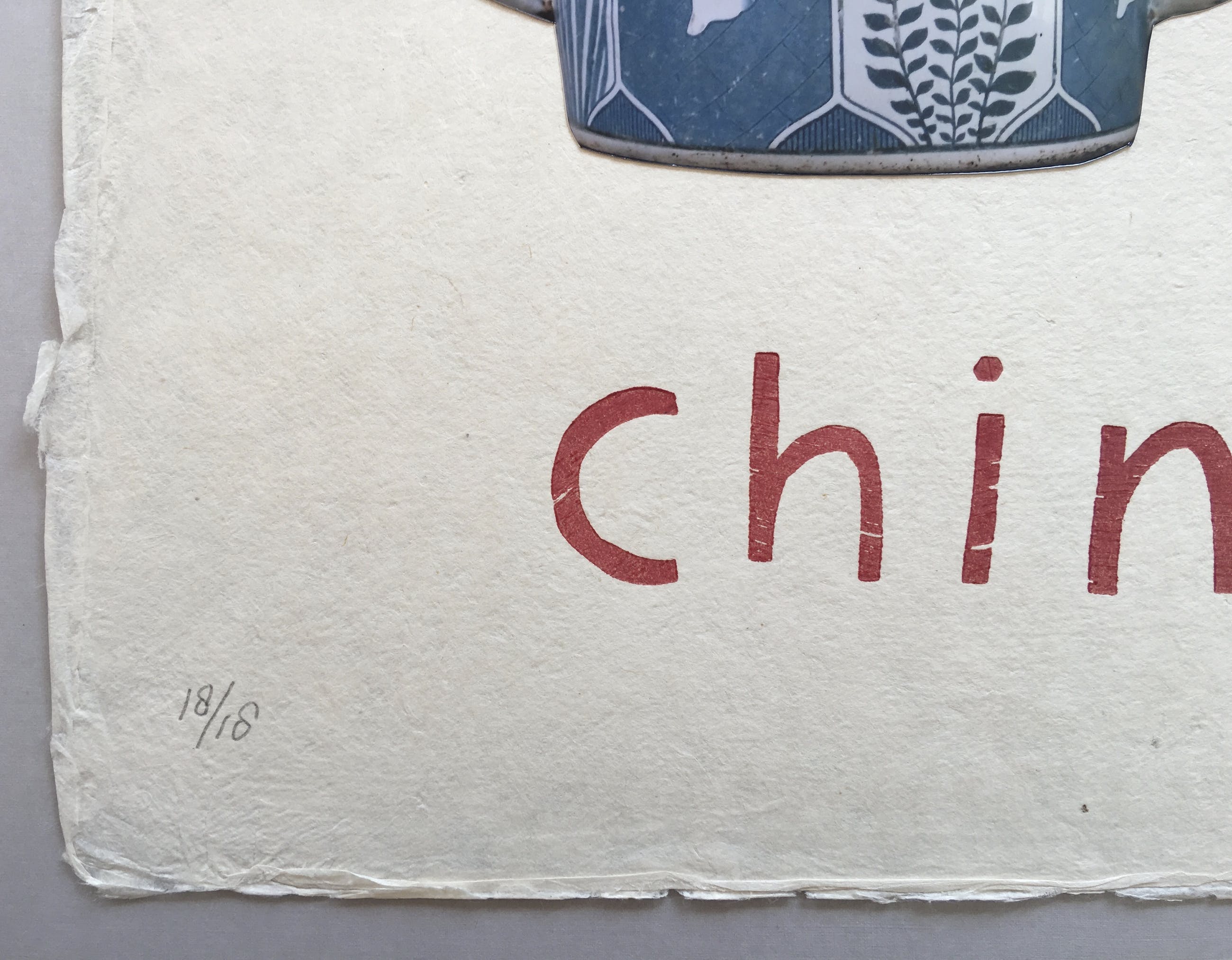 Deze fraaie houtdruk ‘Chinoise’ van Klaas Gubbels is afkomstig uit de serie ‘cijfers en letters ‘. Het werk op geschept papier is gesigneerd en genummerd, oplage 18/18.