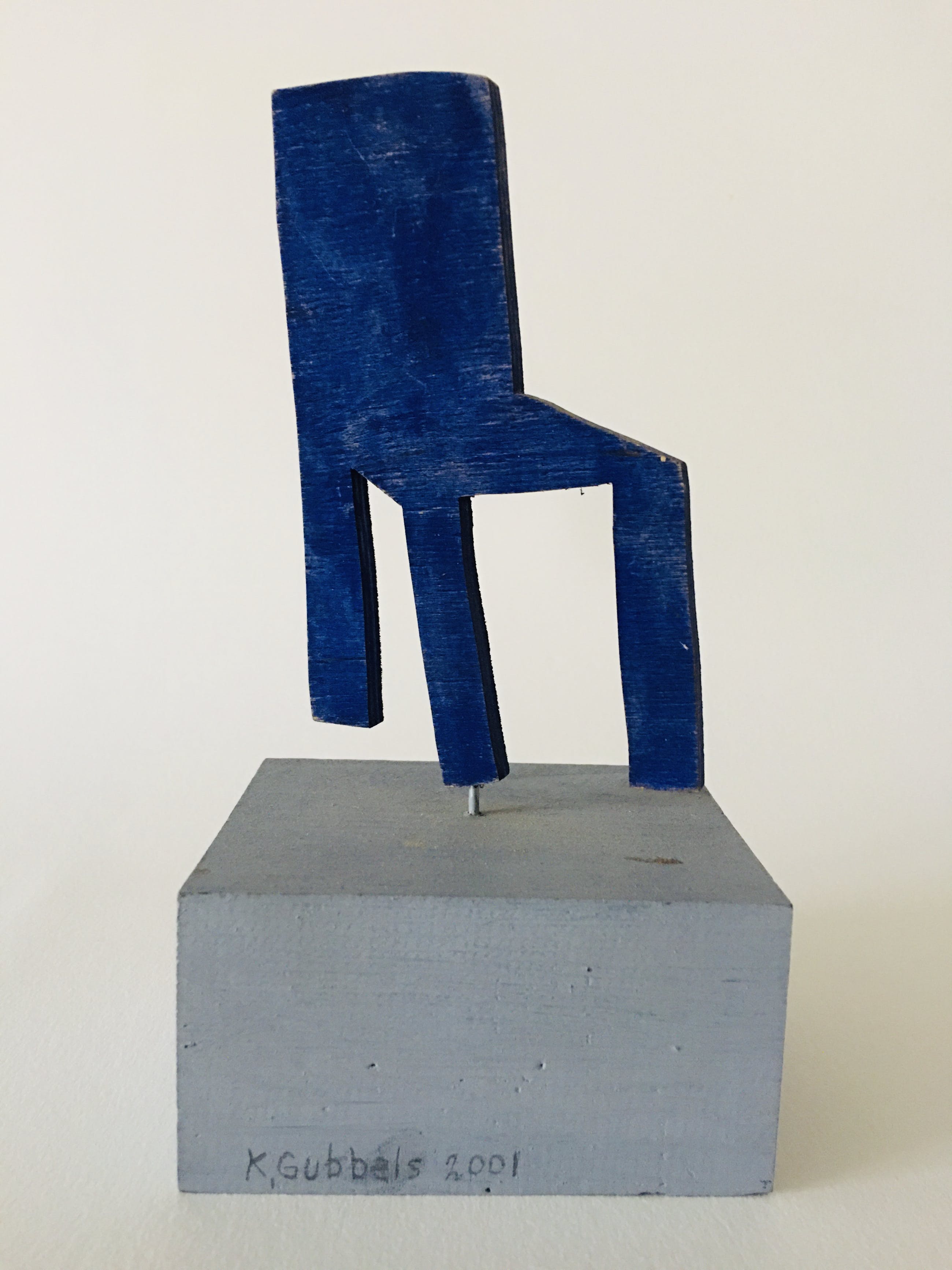 Een zeer fraai houten object van Klaas Gubbels uit 2001. Het werk is gesigneerd links onder. De totale hoogte incl. sokkel is 17 cm; de stoel zelf 12 cm. Uniek werk!