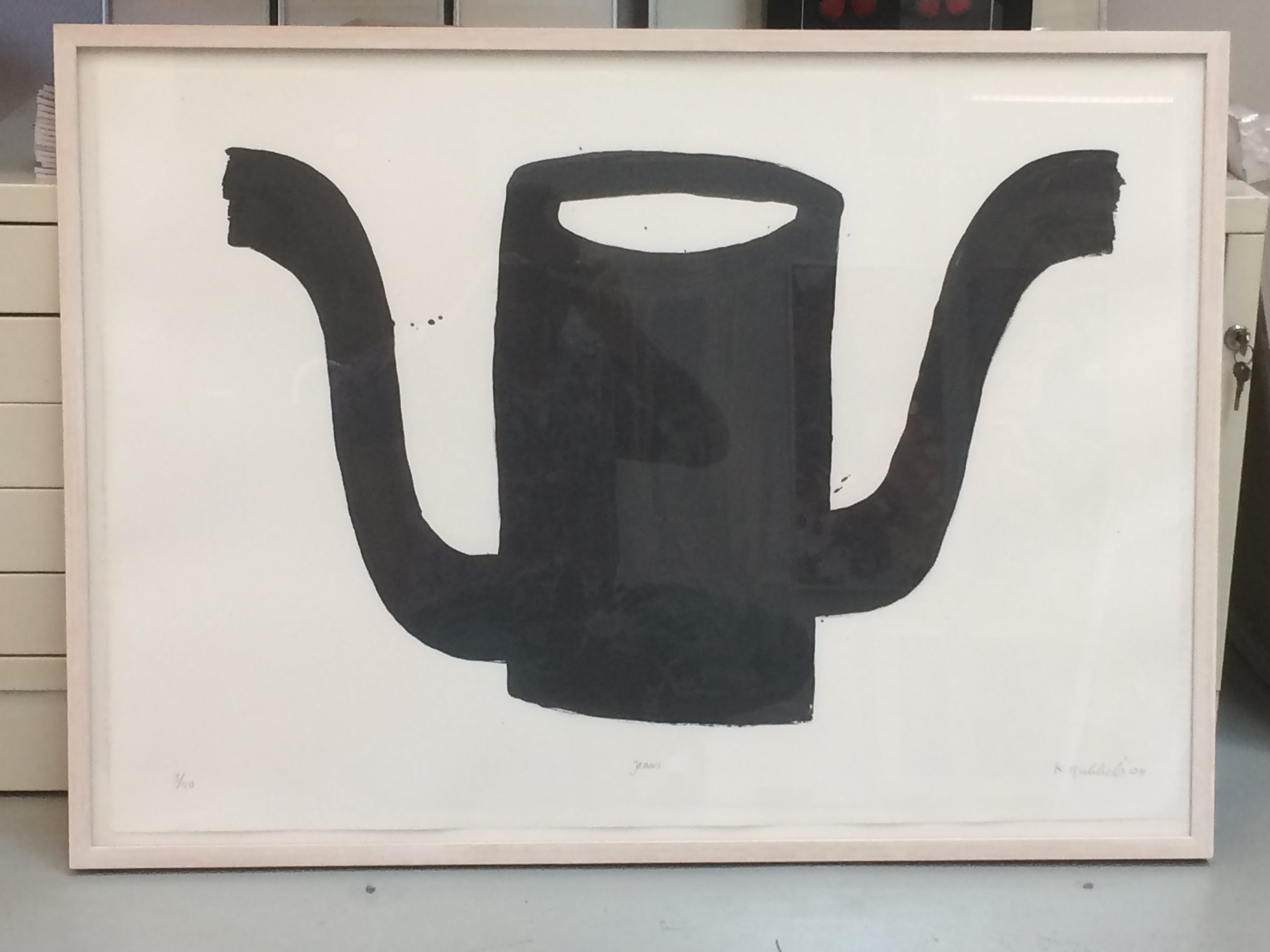 Janus kan van Klaas Gubbels. Litho uit 2004 in prima staat.In een oplage van 40 stuks is dit nummer 3. Het werk komt met een houten white wash lijst 70 x 97 cm. De afbeelding is ca 63 x 90 cm. Gesigneerd en genummerd.Het werk kan worden opgehaald en/of vooraf in worden bekeken bij galerie Rotor in Arkel of per koerier worden toegezonden, deze extra kosten zijn voor de koper.Door de glasplaat voor het kunstwerk is er enige reflectie te zien op de foto.
