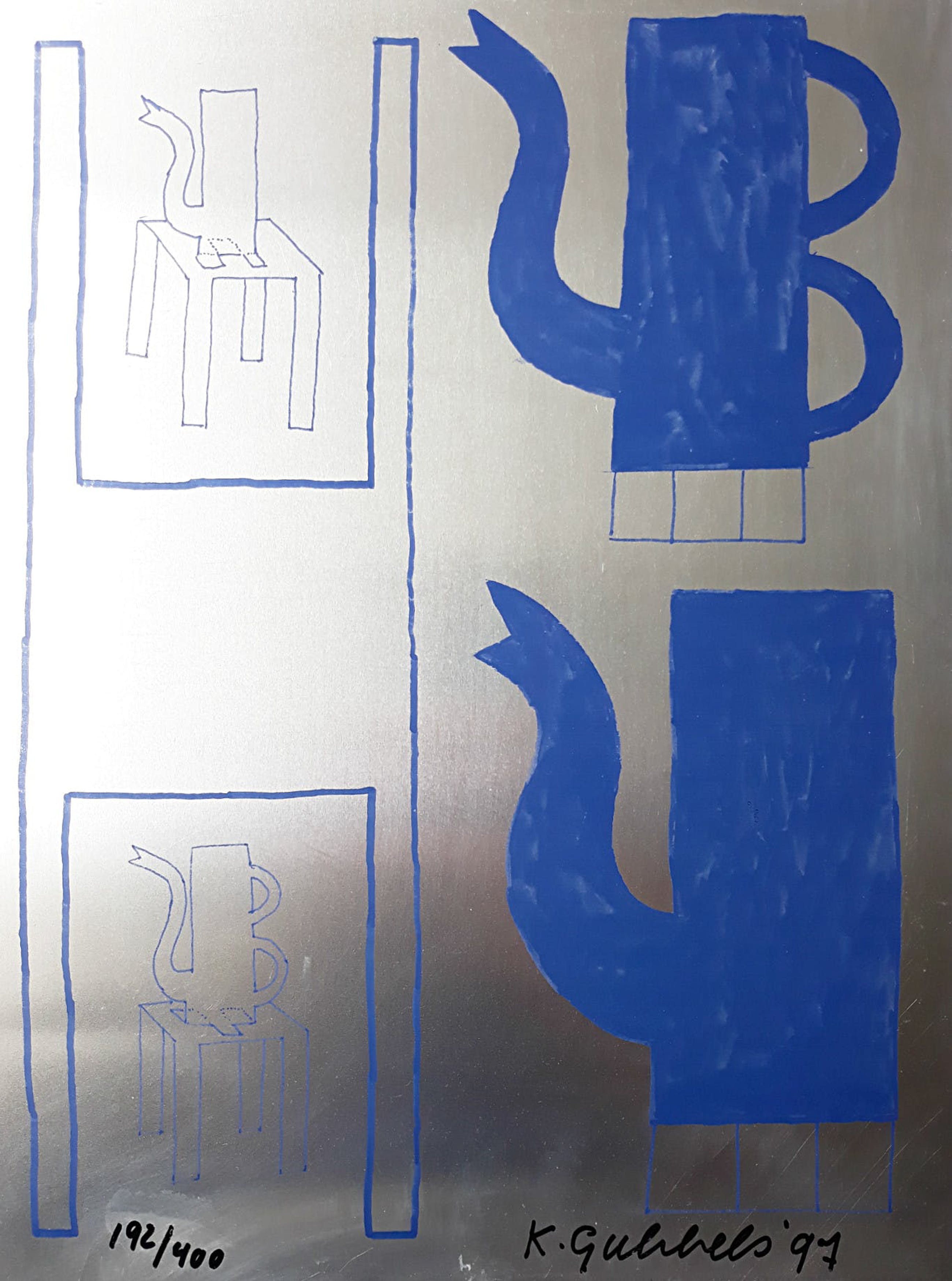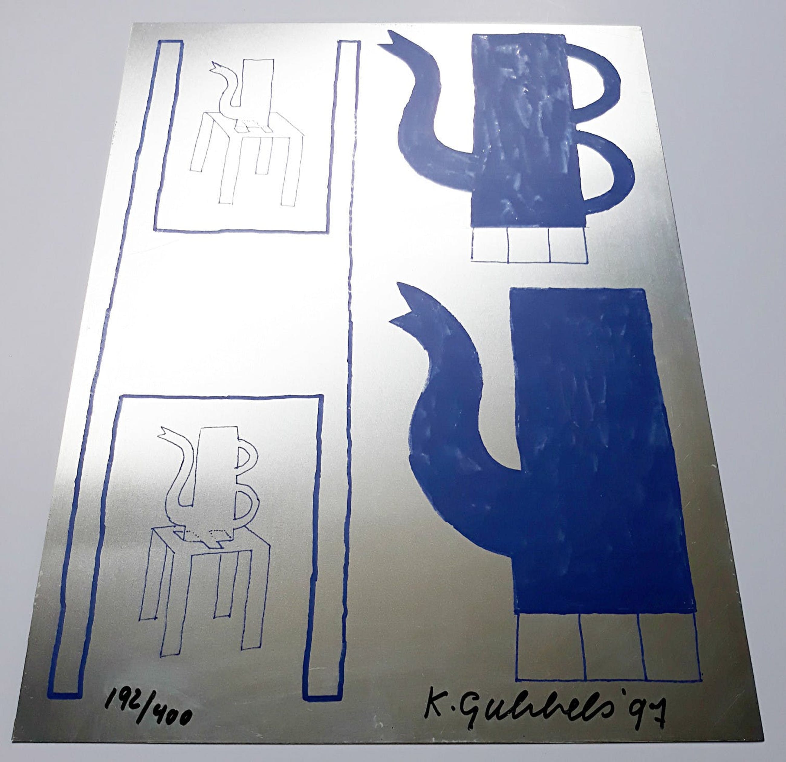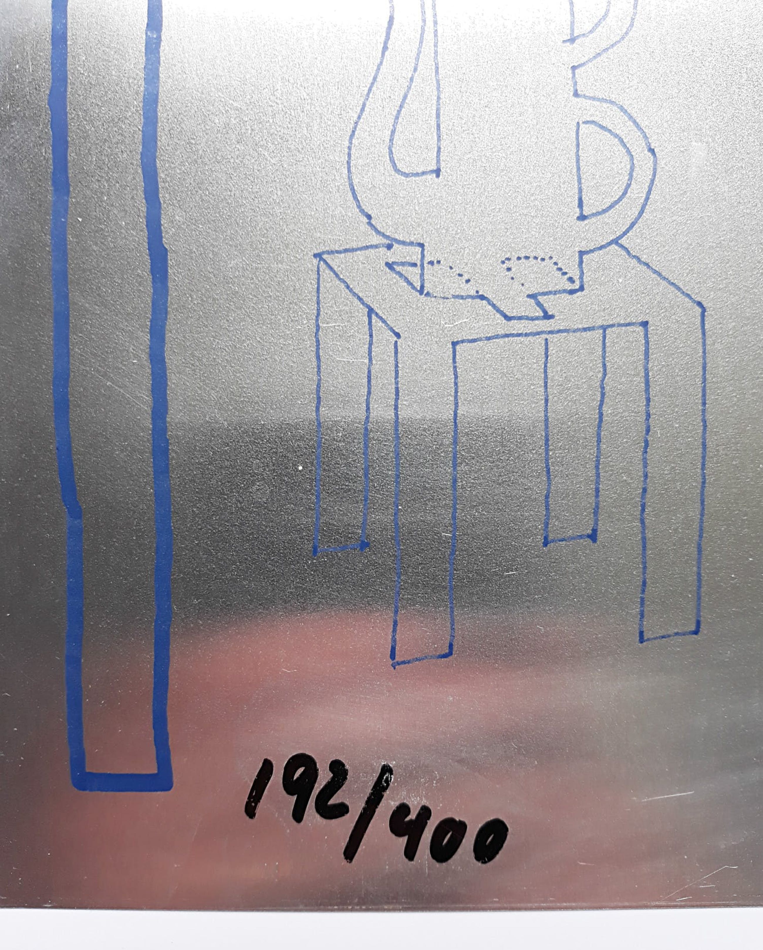 Uiterst herkenbaar werk van Klaas Gubbels. Zeefdruk op aluminium, met stift gesigneerd, gedateerd (’97) en genummerd (192/400). In goede conditie, enkel wat kleine krasjes en veegjes op het aluminium (relatief zacht metaal). Hoewel gedrukt in een relatief hoge oplage wordt deze zeefdruk toch weinig aangeboden.