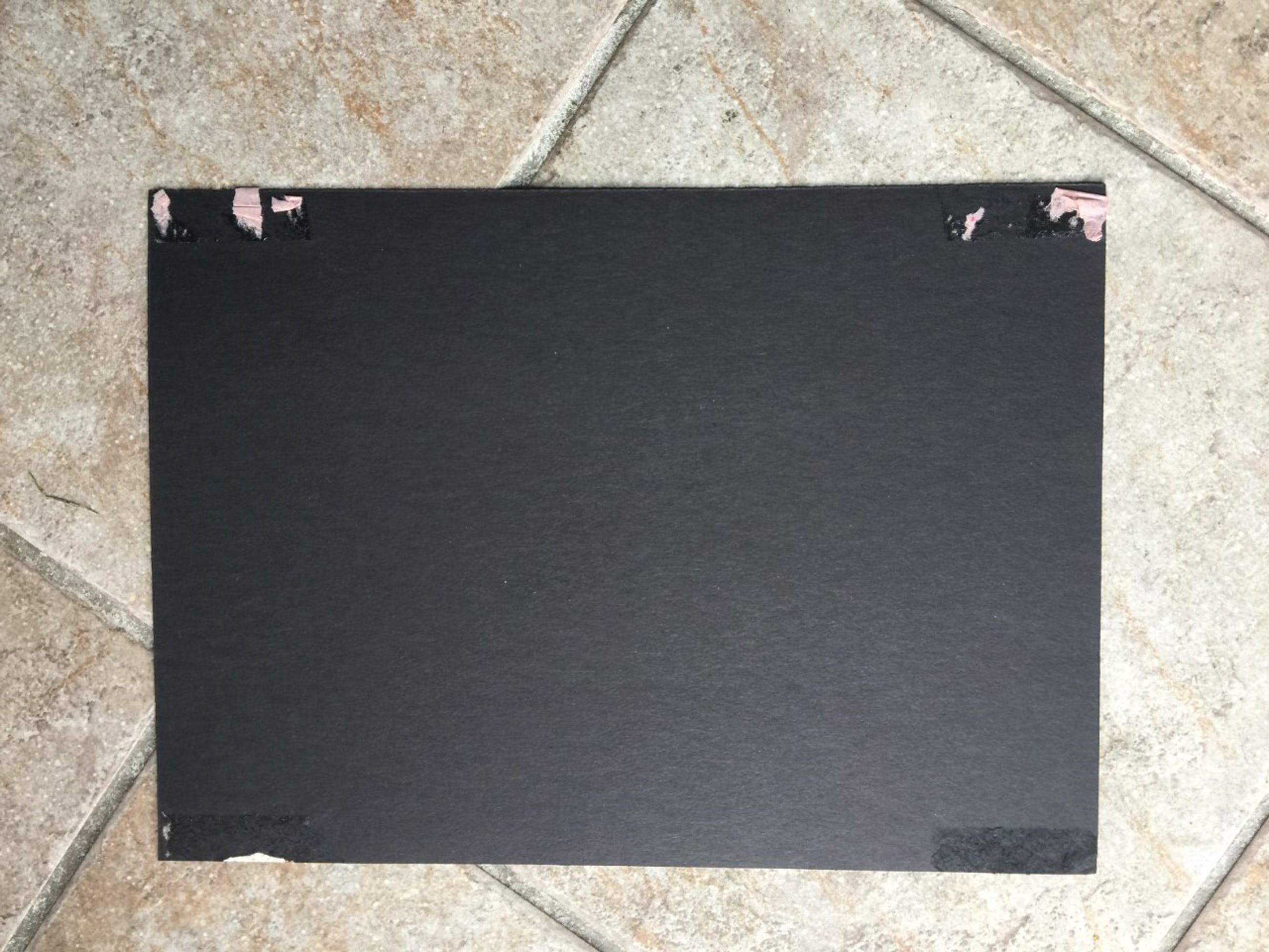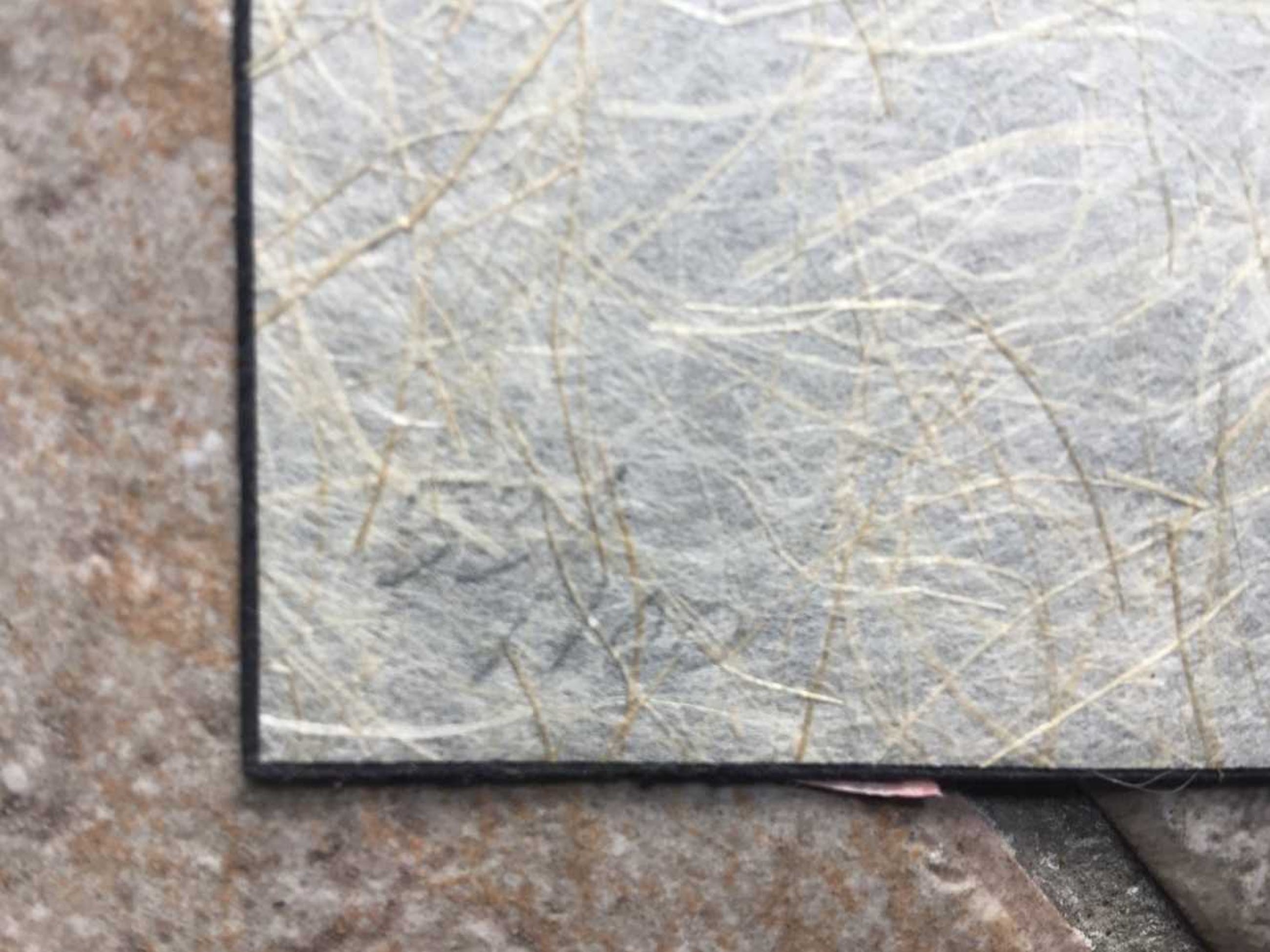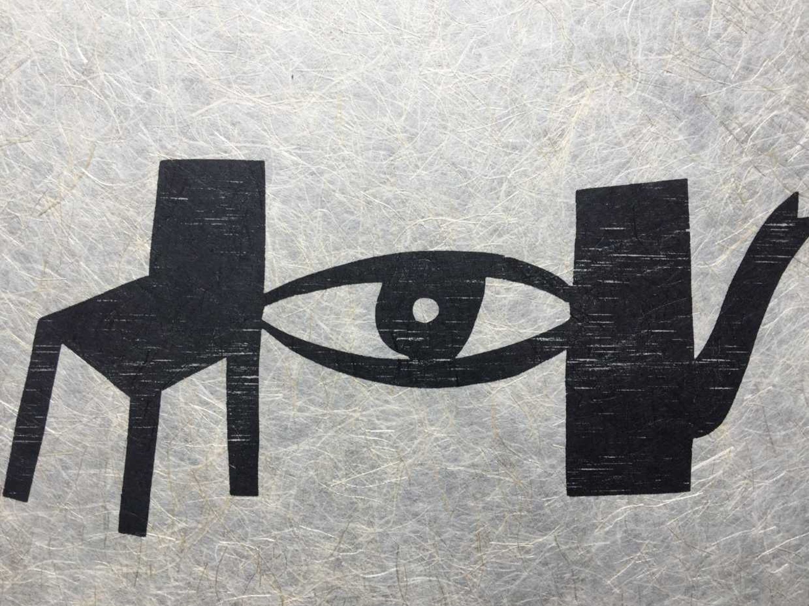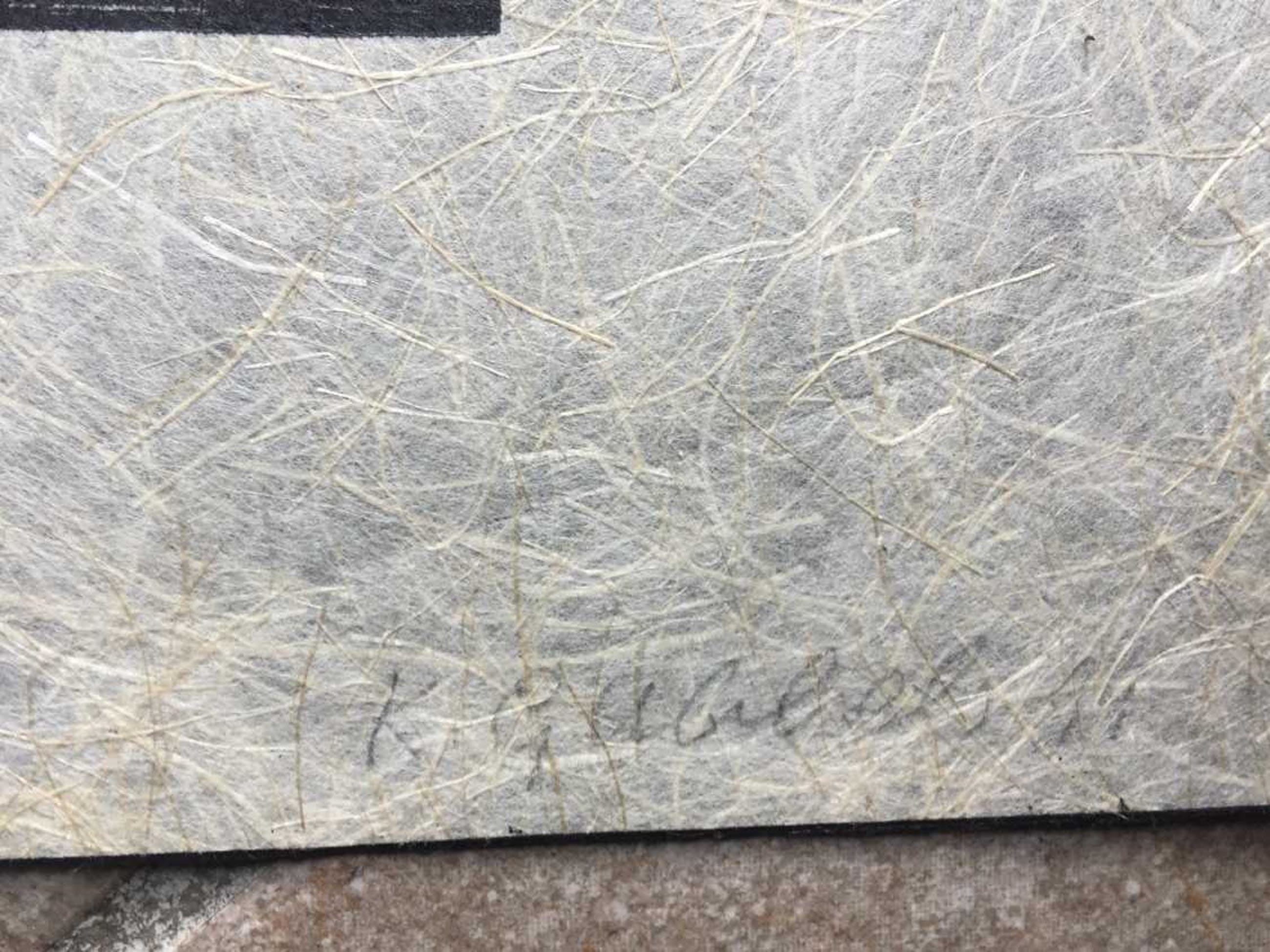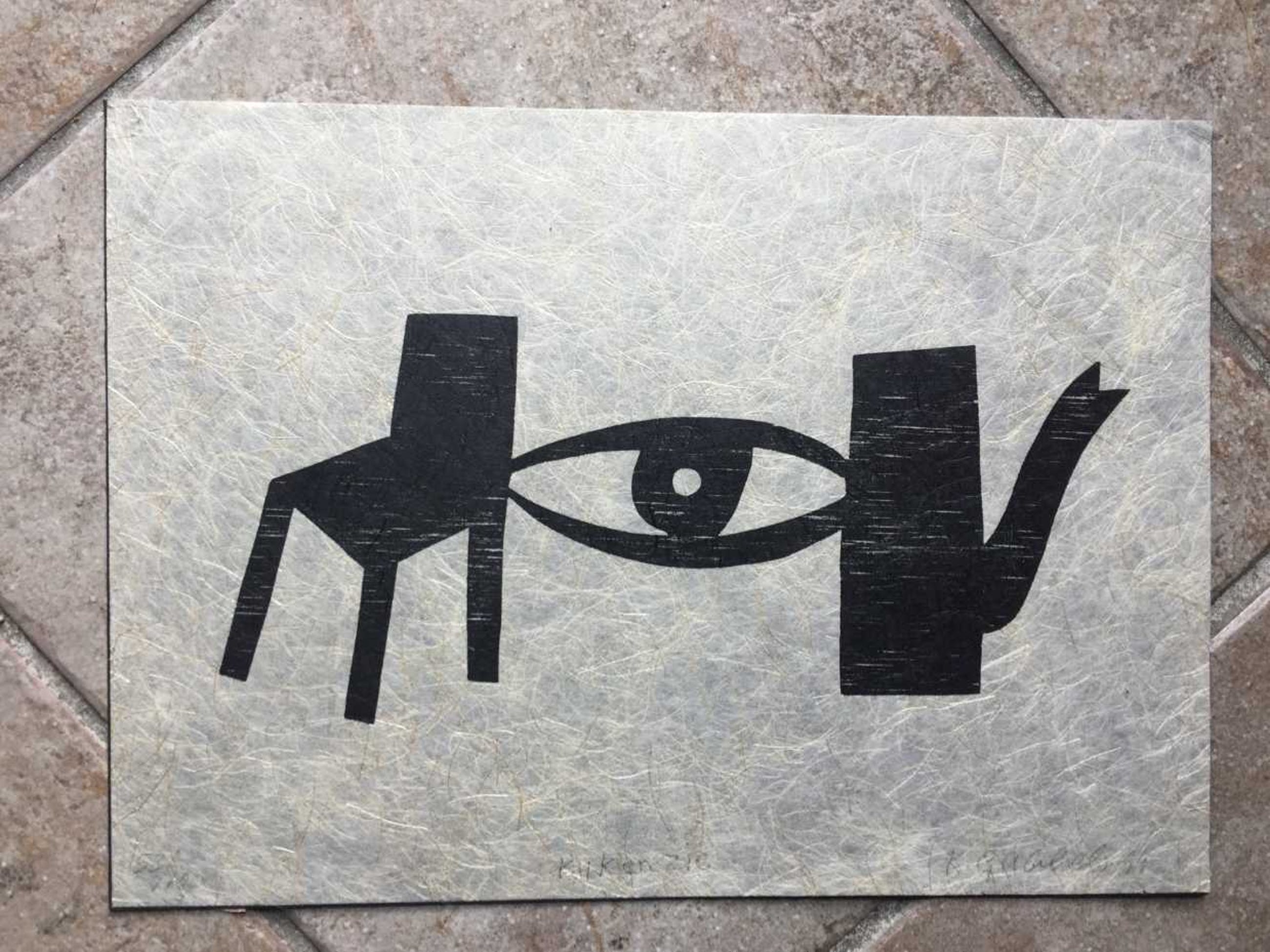 houtsnede op hand geschept (zeer fijn en dun) vezelpapier (papier gemaroufleerd op dikker zwart papier)