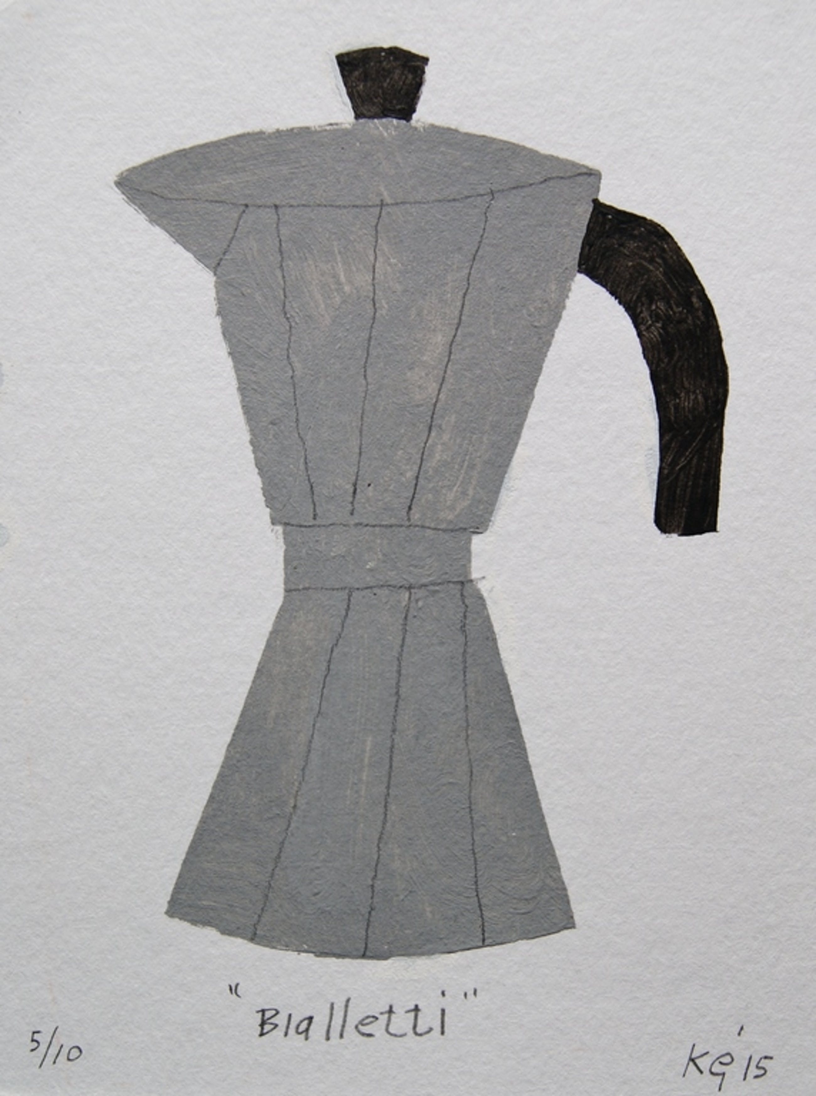 Een zeer fraaie, geschilderde sjabloondruk 'Bialetti' op papier van Klaas Gubbels uit 2015.
