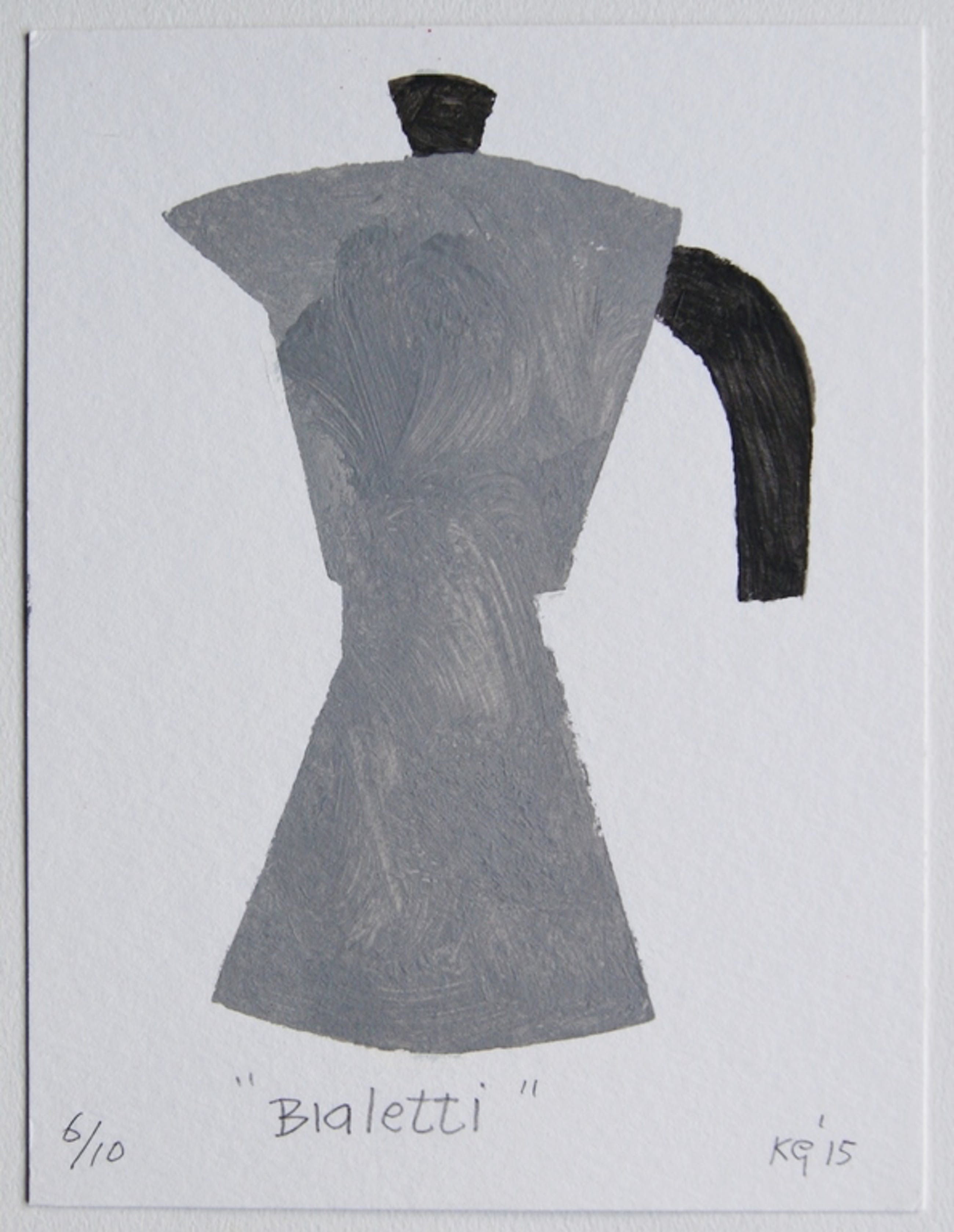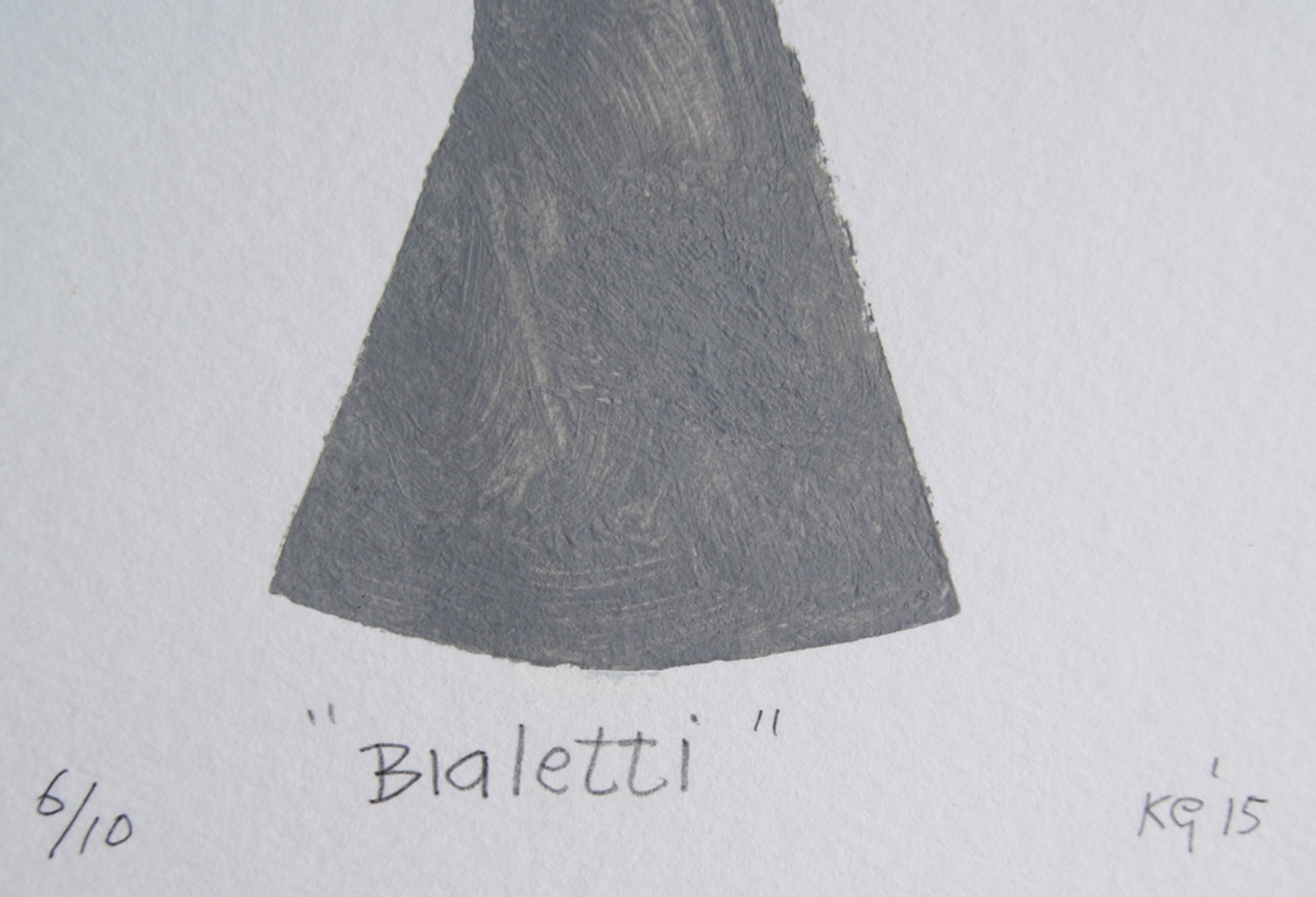 Een zeer fraaie, geschilderde sjabloondruk 'Bialetti' op papier van Klaas Gubbels uit 2015.
