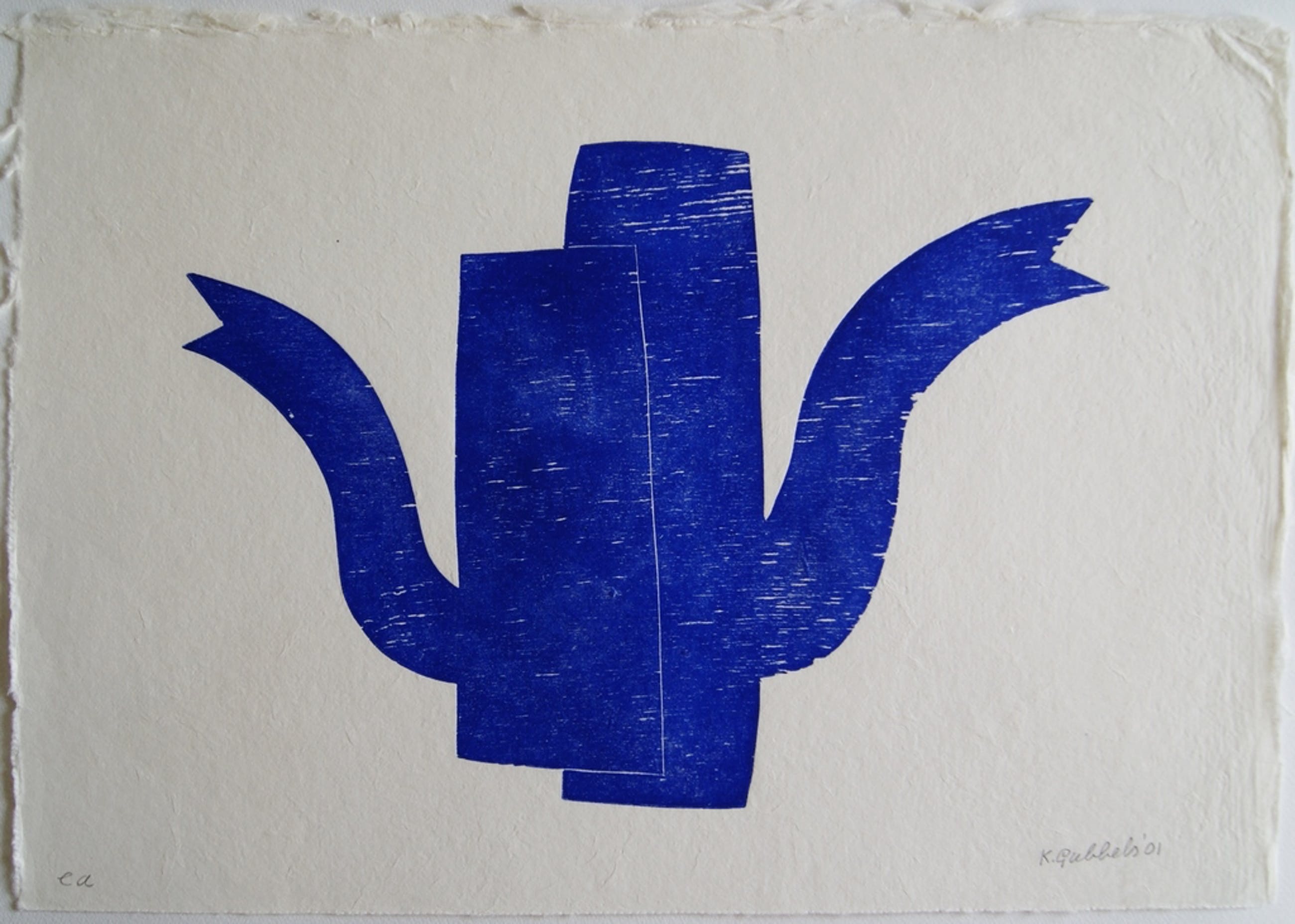 Het werk is uitgevoerd op handgeschept papier, in zijn typerende blauwe kleur.