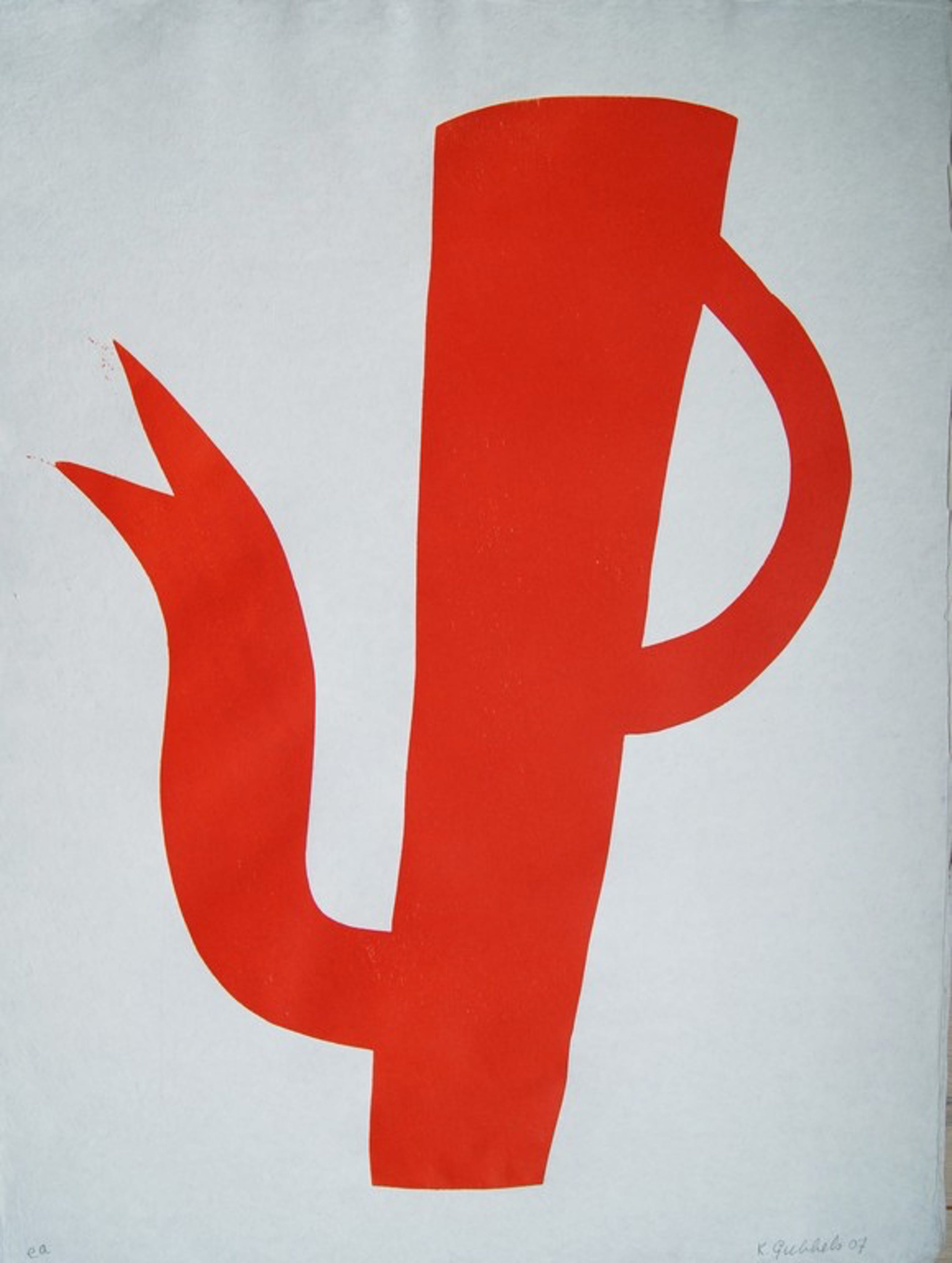 Een grote houtdruk van Klaas Gubbels, met een typerende "Gubbels"-oranje kleur. Het werk is gesigneerd en genummerd (oplage E/A).