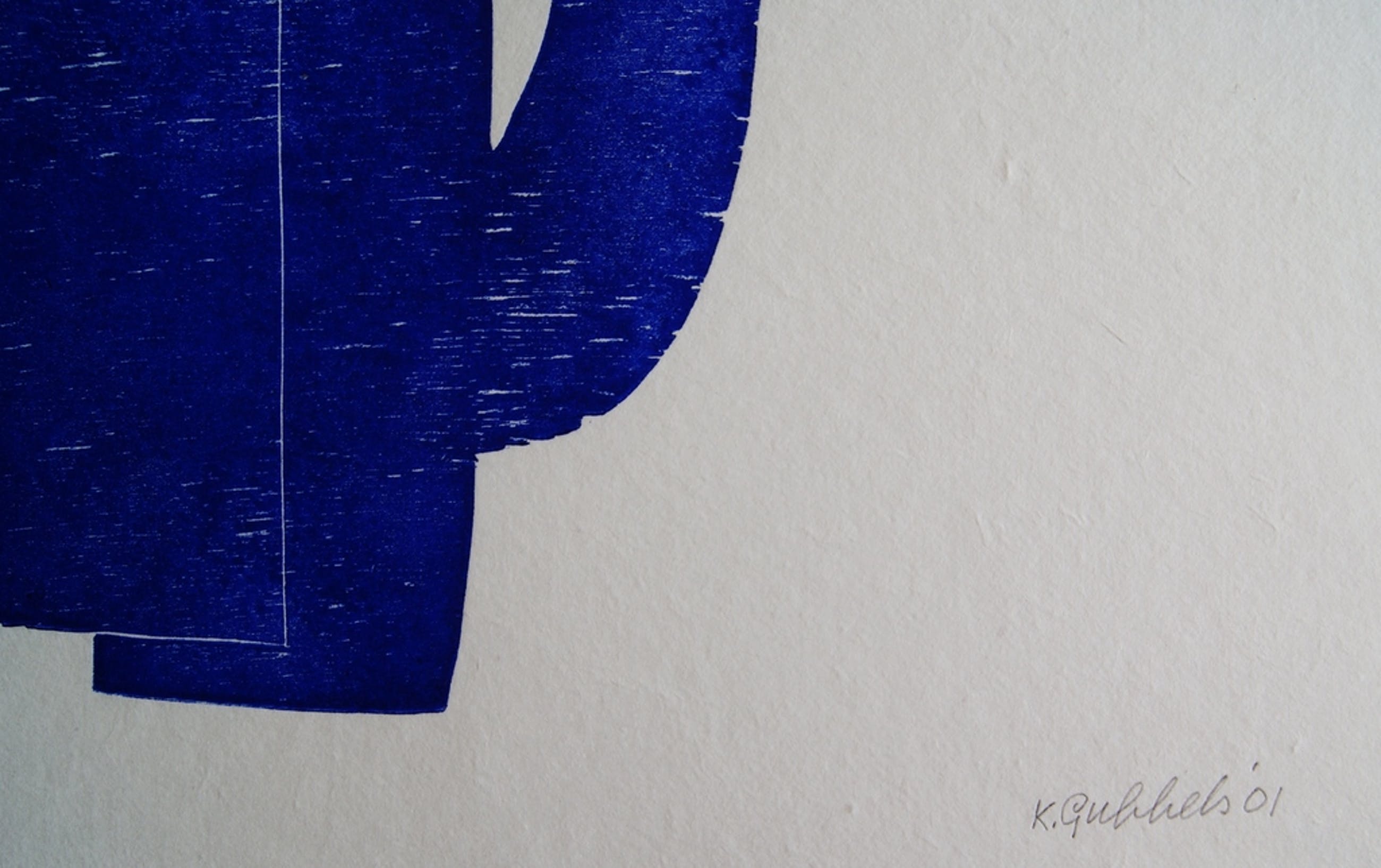 Het werk is uitgevoerd op handgeschept papier, in zijn typerende blauwe kleur.