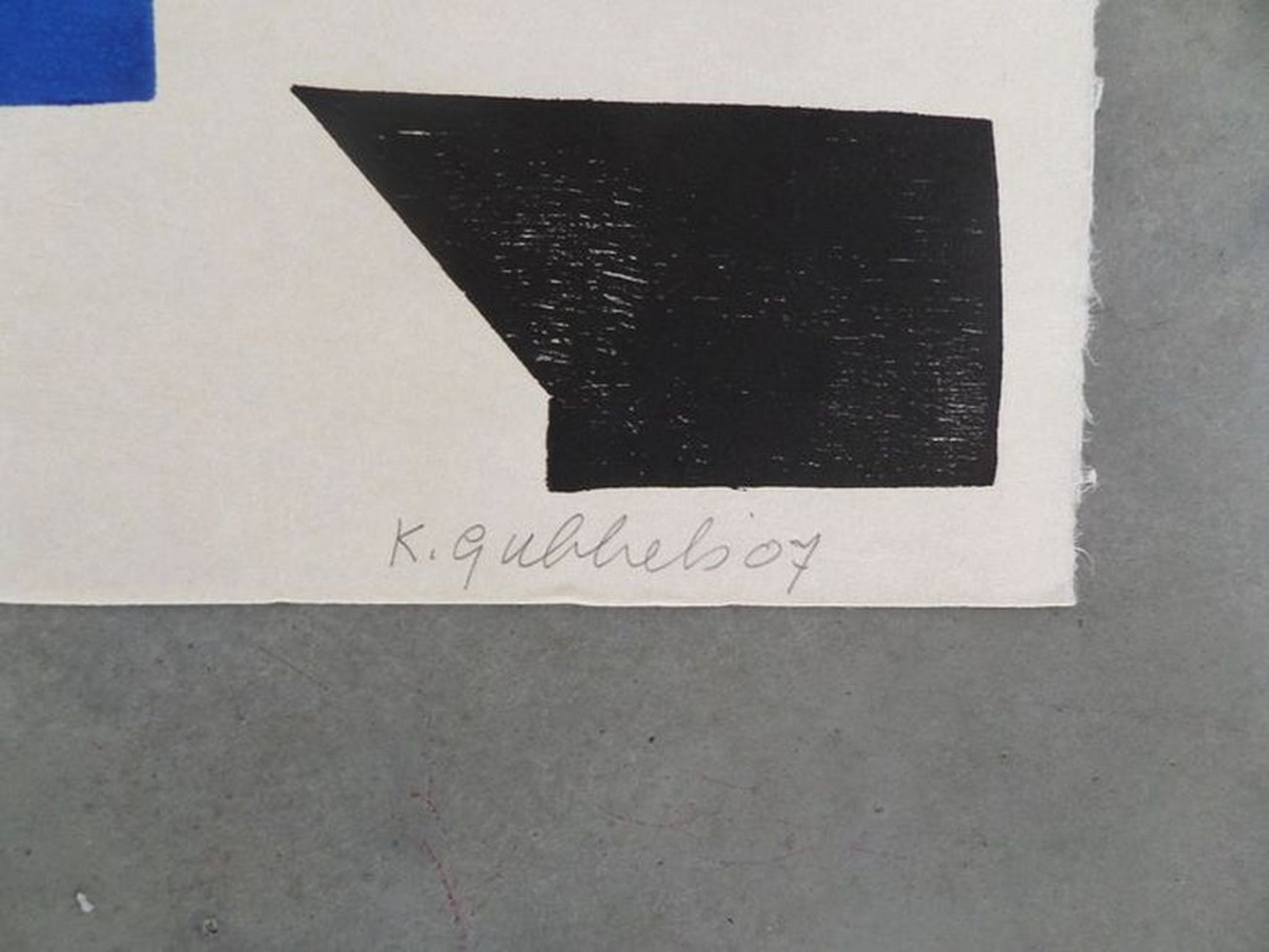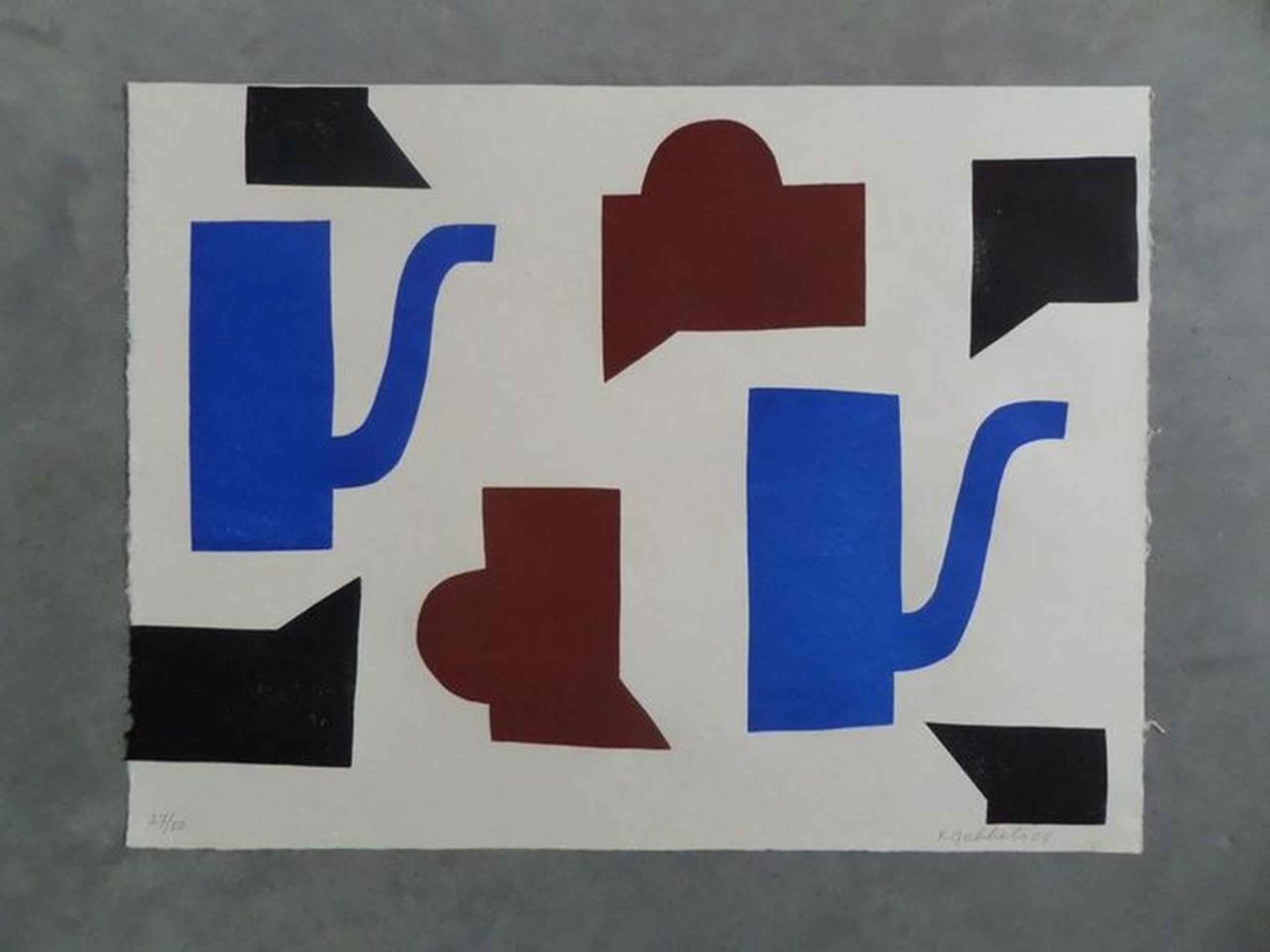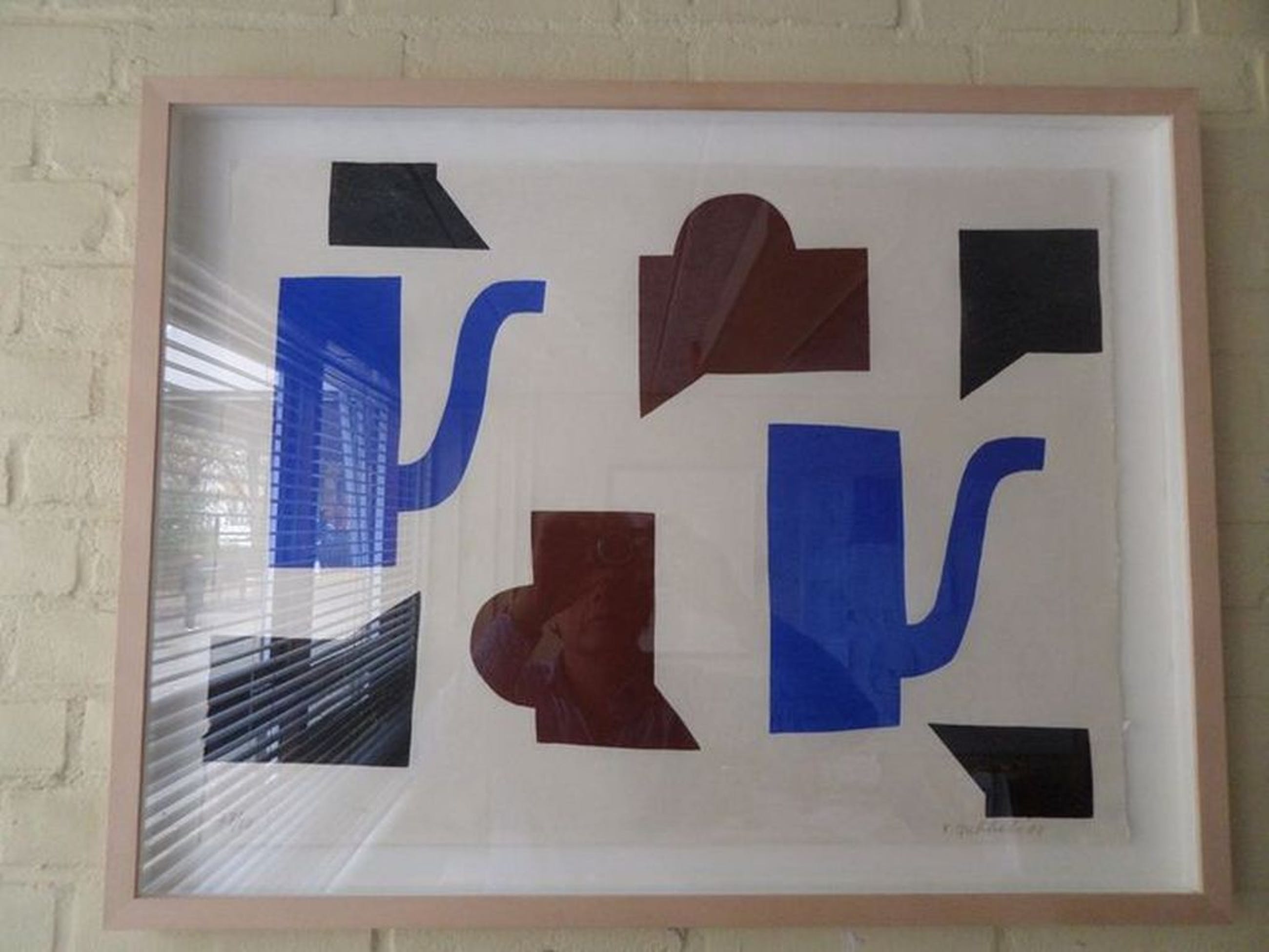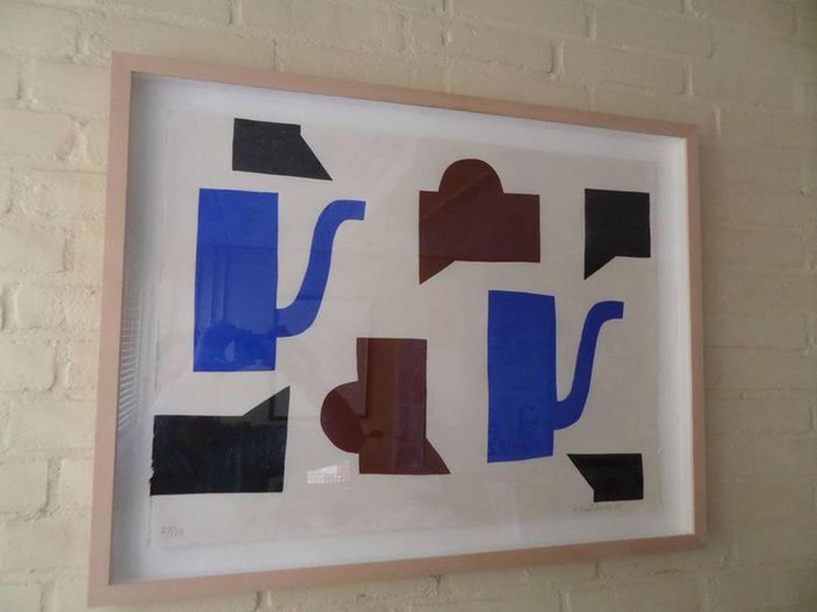 Van de Nederlandse kunstenaar Klaas Gubbels, deze fraaie houtdruk inclusief mooie baklijst. Het werk is op handgeschept papier gedrukt. Het is gemaakt in een zeer beperkte editie van 50 waarvan dit nummer 27 is. Op het werk zijn blauwe potten, roodbruine kannen en zwarte koppen te zien. Het liefst ophalen in verband met kwetsbare inlijsting. Formaat ongeveer 60 x 80 cm, inclusief lijst. (Tip; Zie ook werk van Klaas Gubbels bij Art Zuid te Amsterdam)