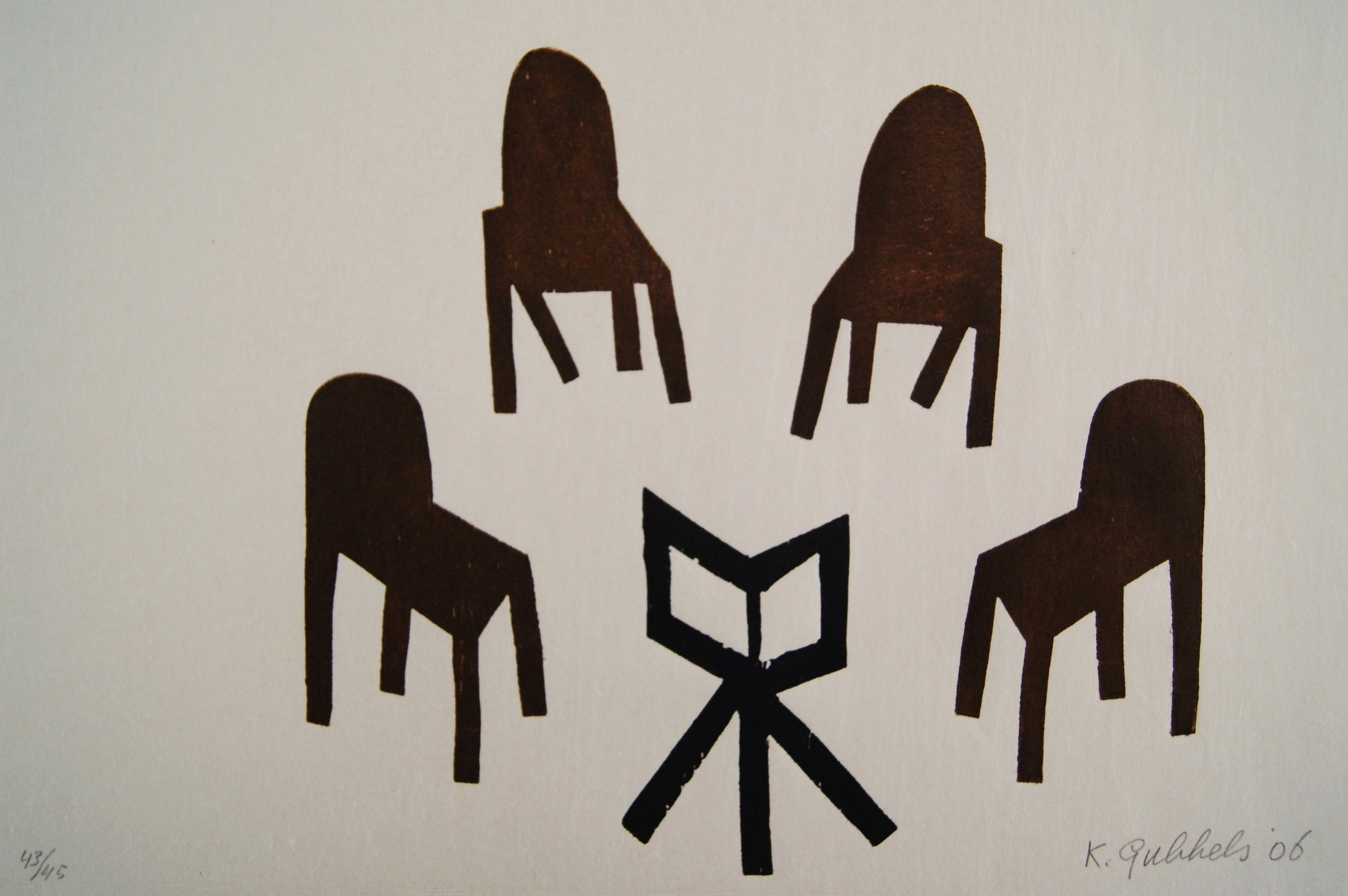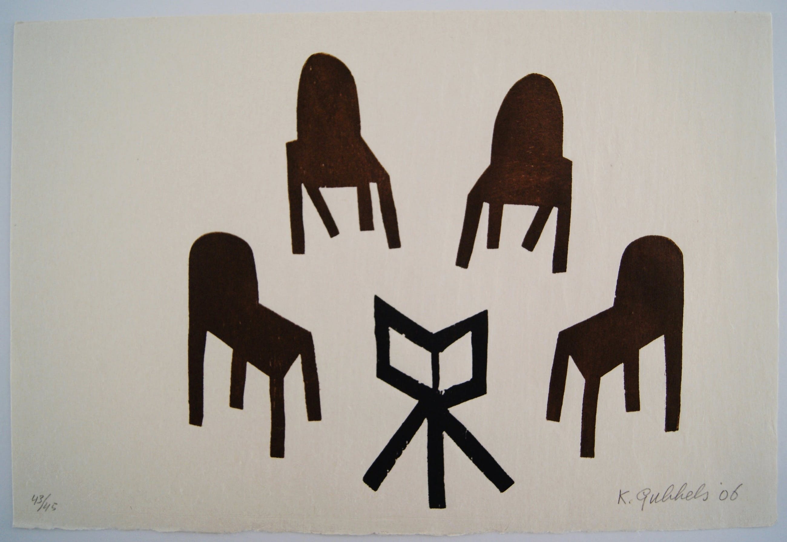 Een fraaie houtdruk op handgeschept papier van Klaas Gubbels uit 2006Het werk is getiteld 'Hongaars Kwartet' en heeft de afmetingen 32.5 cm x 48 cm.De houtdruk is gesigneerd en genummerd - oplage 43/45 en is in zeer goede conditie.