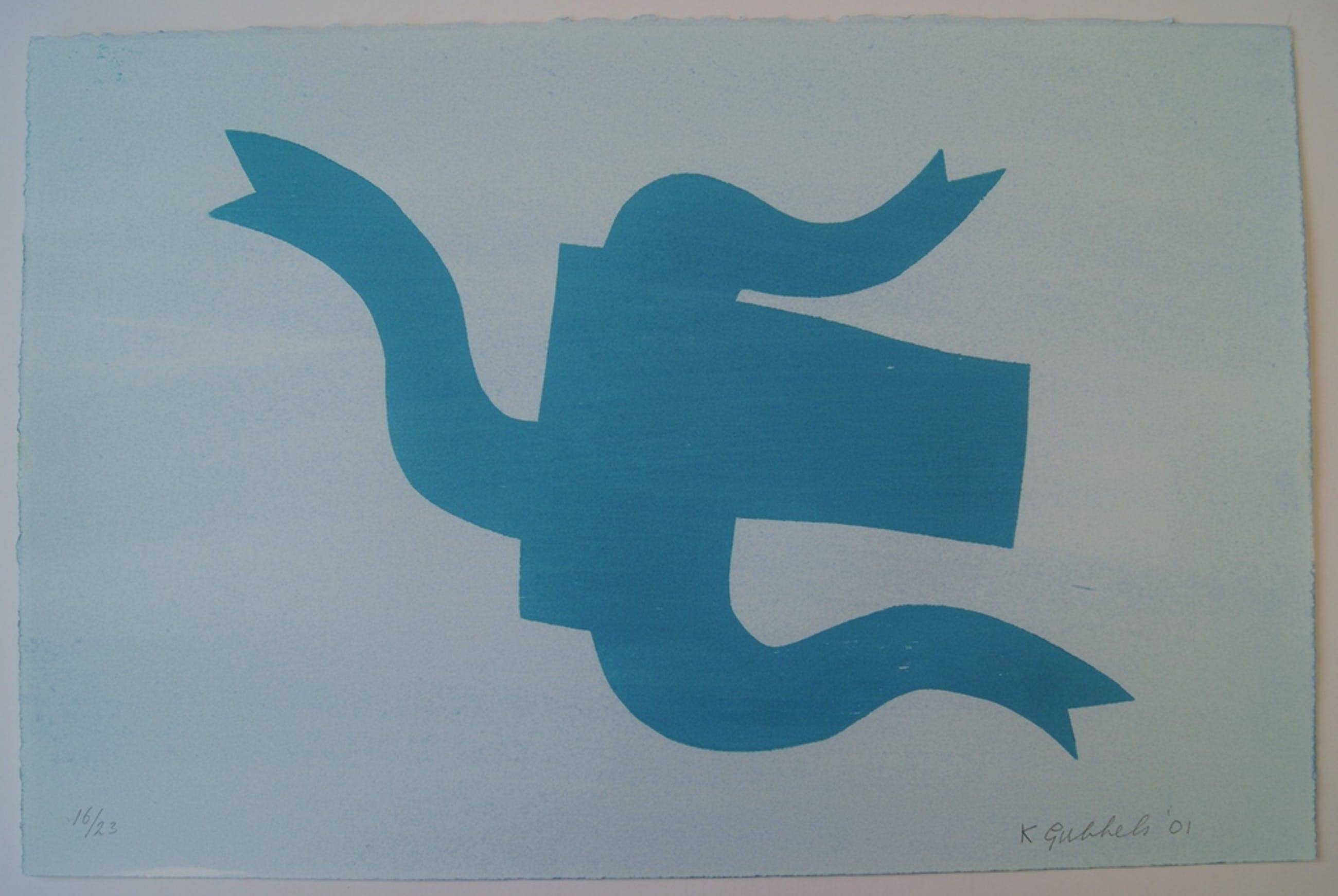 Klaas Gubbels houtdruk met aquarel ondergrond uit 2001.