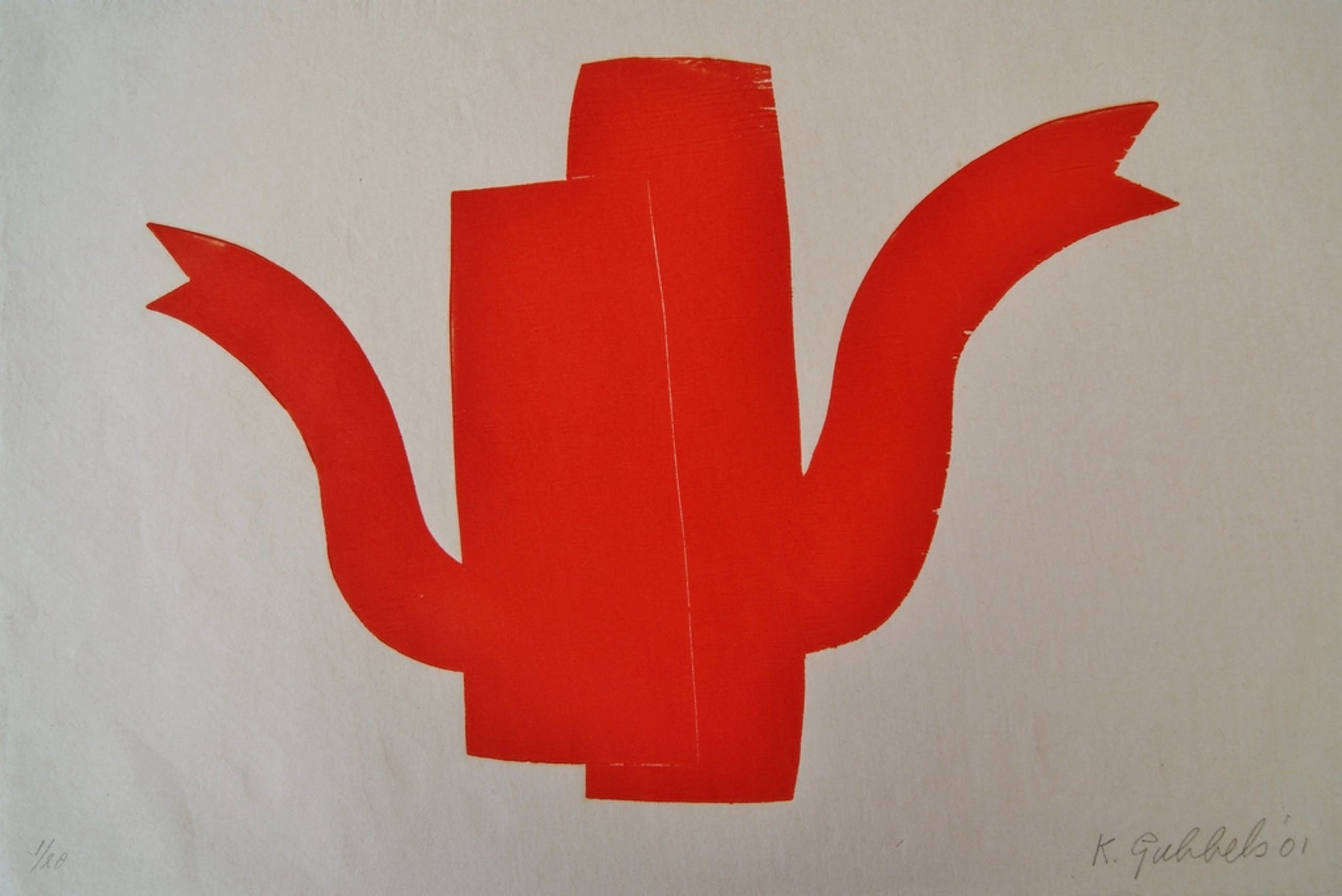 Een typerende houtdruk van Klaas Gubbels, getiteld 'A&M' uit 2001. Het werk is gesigneerd en genummerd (oplage 28 stuks).