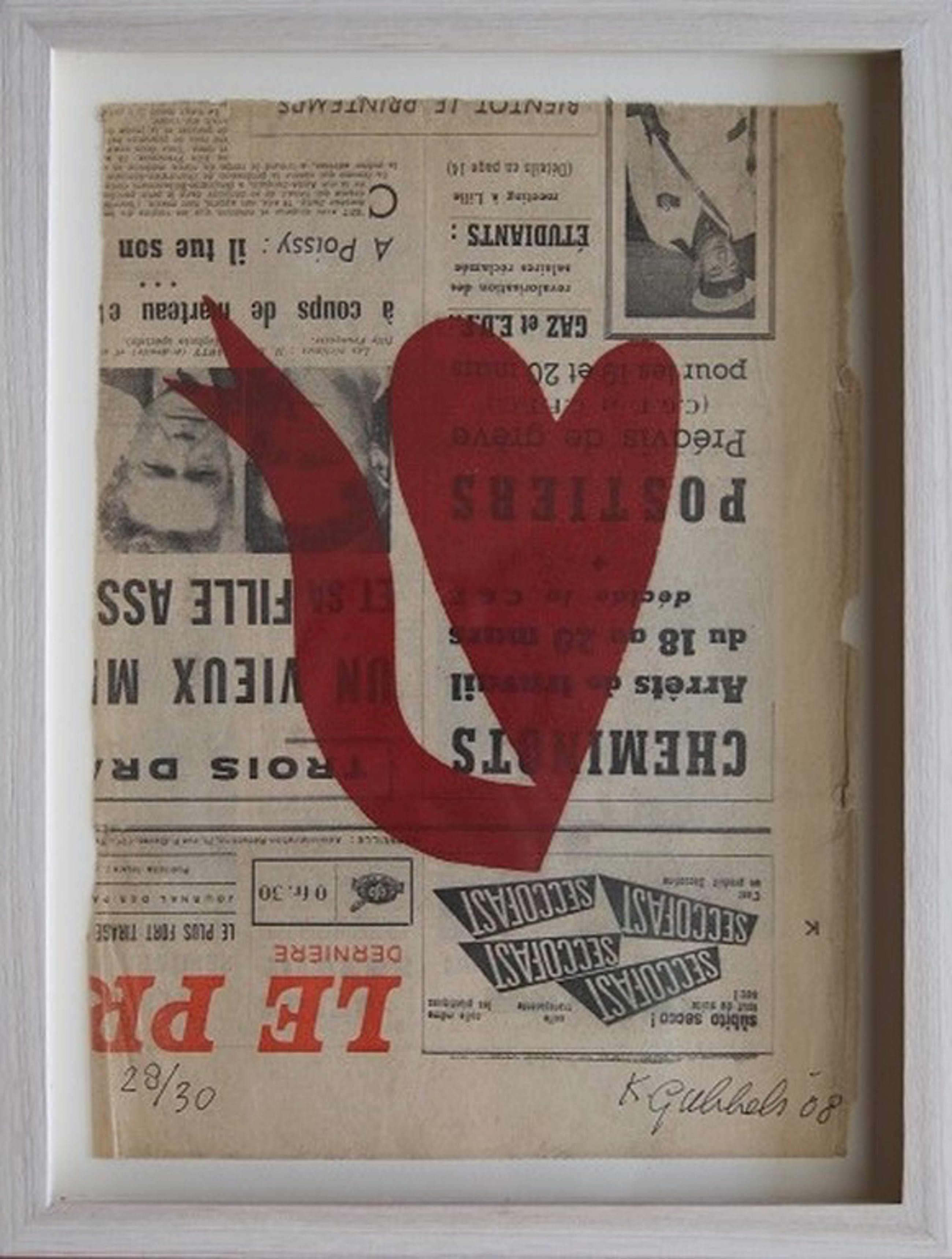 Als ondergrond is deze keer een oude Franse krant uit de 50-er jaren gebruikt, waardoor ieder werk uniek is geworden.