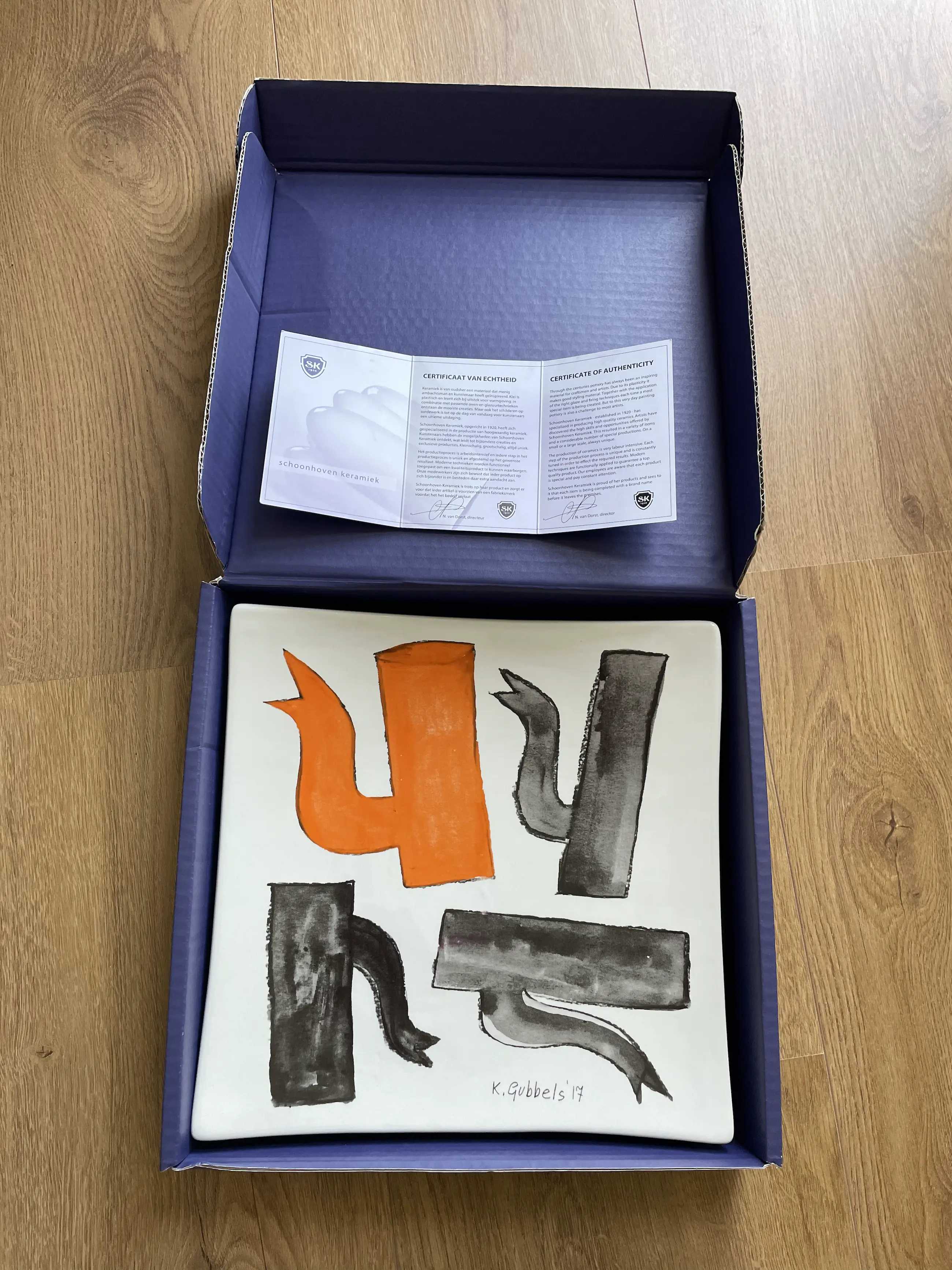 Prachtige schaal van pasteelbakkerij Schoonhoven welke in 2017 versierd is door typisch werk van Klaas Gubbels, zwarten en een oranje kan.
