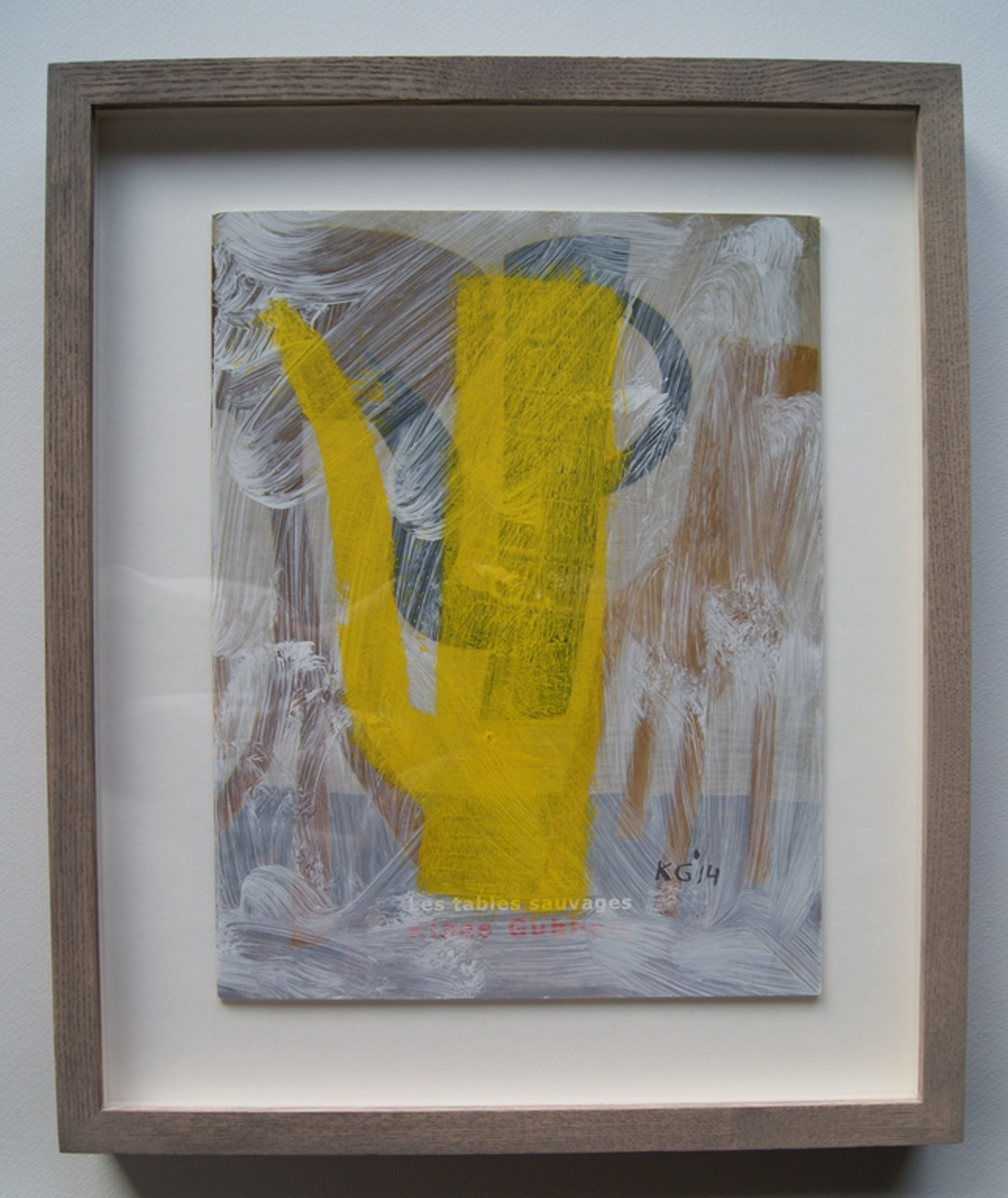 Als ondergrond is een expositiecatalogus gebruikt wat een fraai contrast geeft aan het werk.