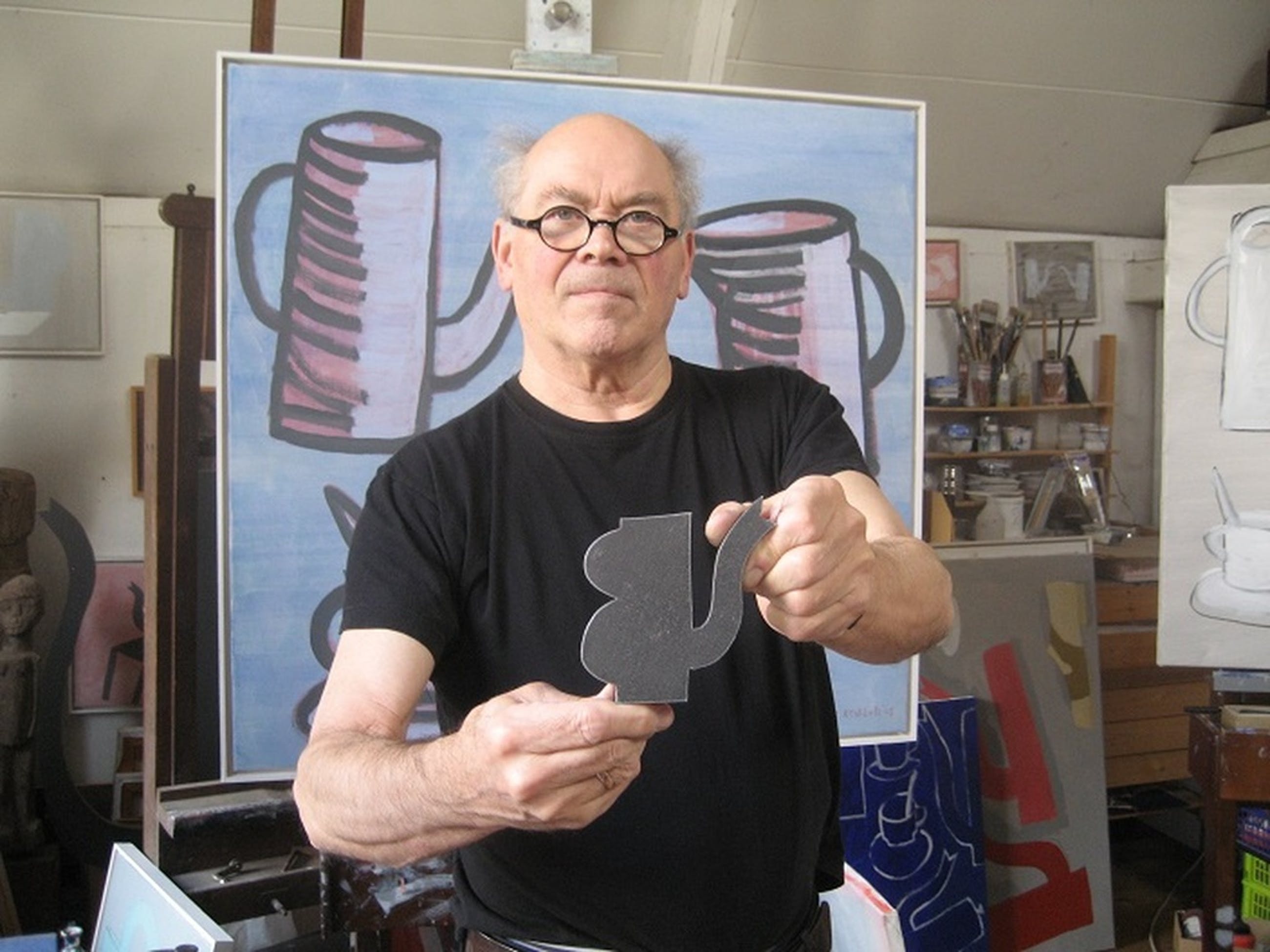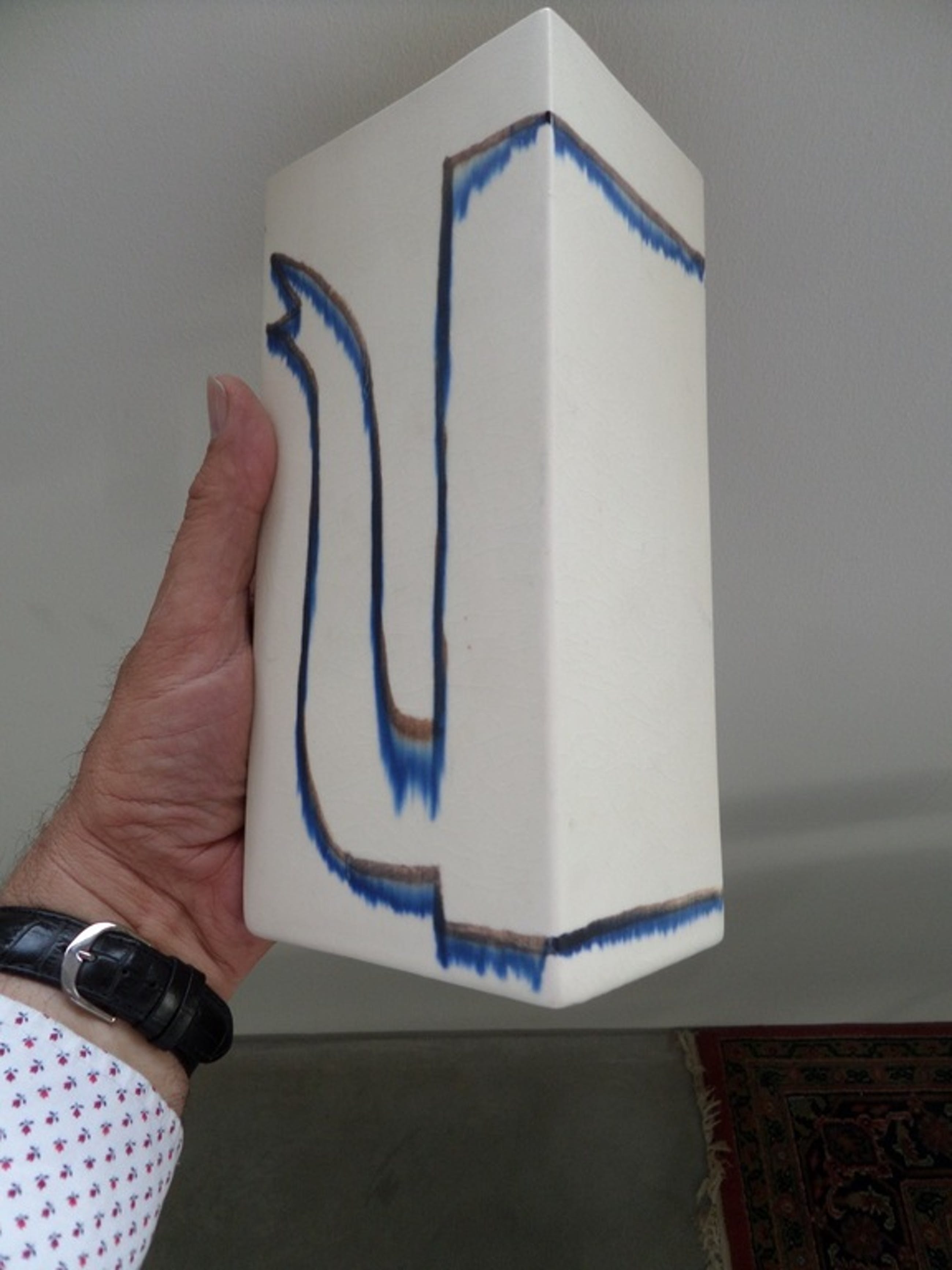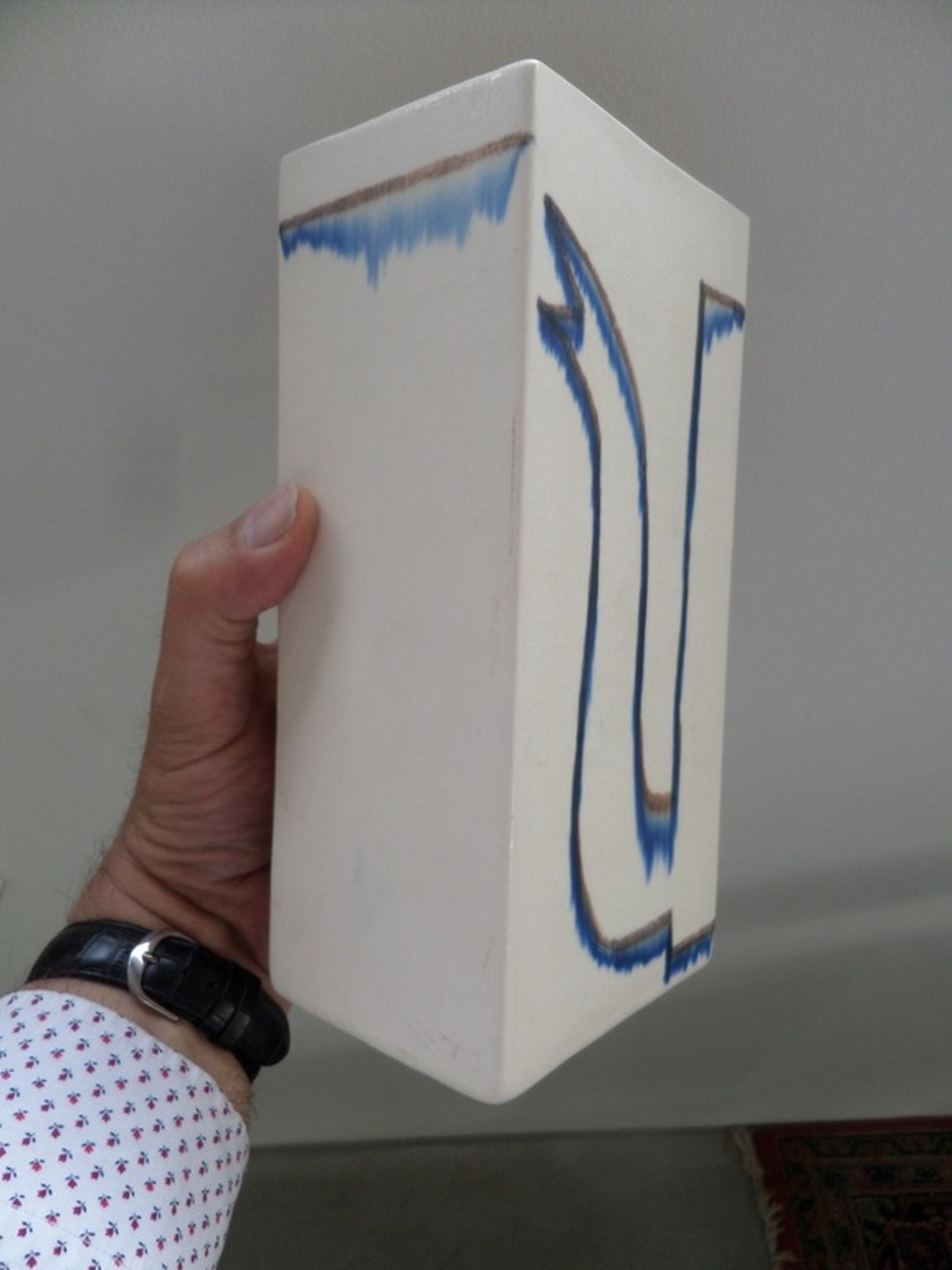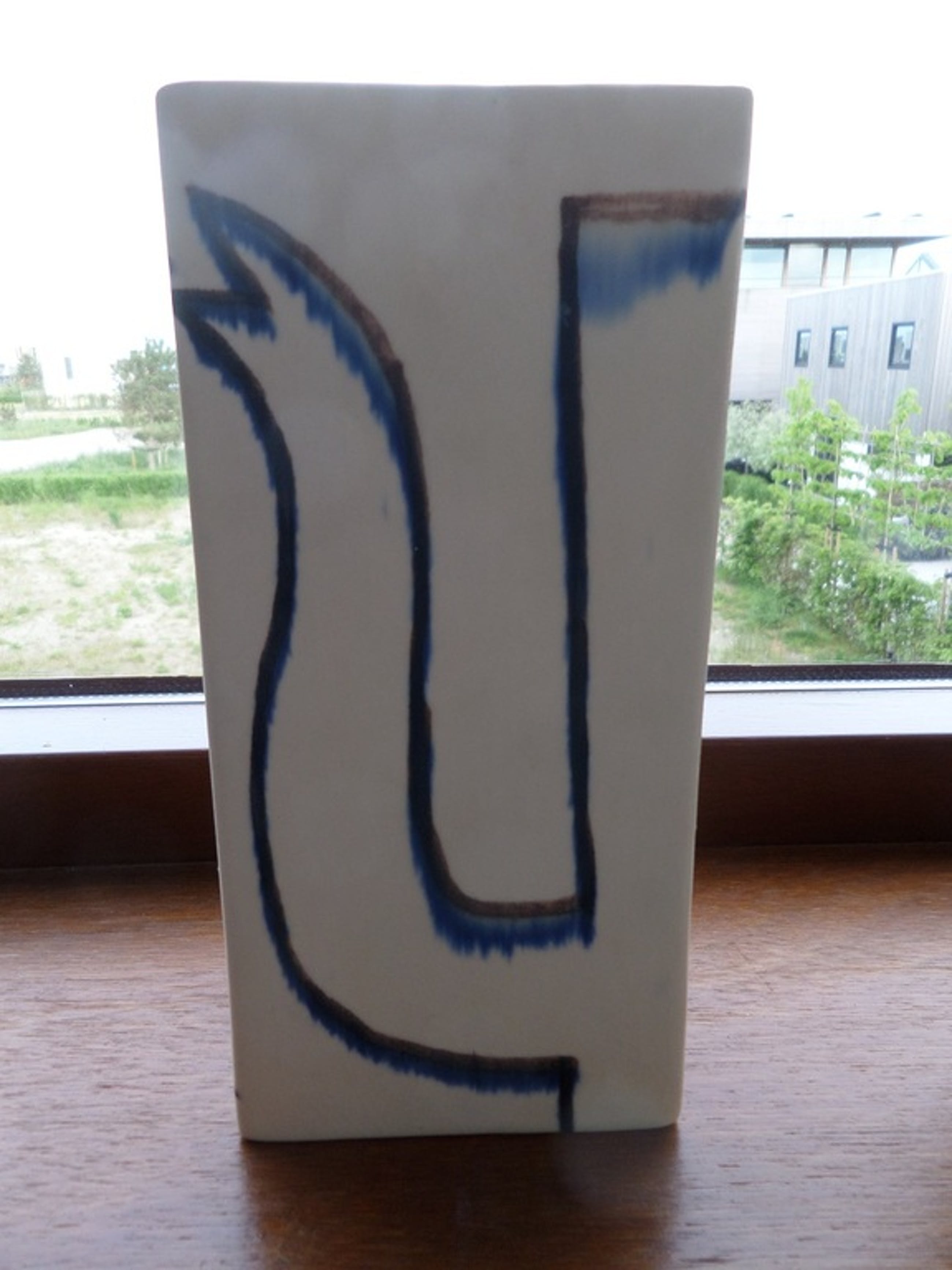 Van Klaas Gubbels deze mooie unieke keramische vaas met rondom twee koffiepotten geschilderd. Het werk is 21 cm hoog, 10 cm breed en 7,5 cm diep. Het originele unieke werk is onderop gesigneerd met "KG '90". De creme glazuurlaag heeft craquelures. De potten rondom lijken met een soort krijt te zijn getekend en met glazuurverf bewerkt. Het werk wordt goed verpakt (bubbelplastic) aangetekend verzonden.
