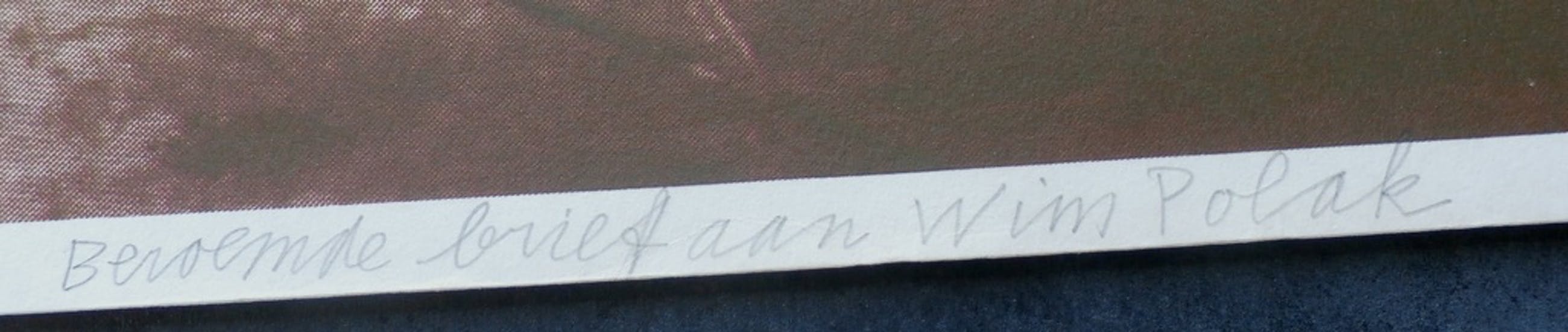 Zeefdruk van Klaas Gubbels uit 1983. "Beroemde brief aan Wim Polak. Nummer: 15/50. Het werk is rechtsonder gesigneerd. Afmetingen blad H50 x b70 cm. Afmetingen voorstelling: H47.5 x b57.5 cm. Conditie: in goede staat. Er zitten wat kreukjes aan de rechterzijde op de witte rand. Aan de linkerzijde zitten wat vlekjes. Goed ingelijst met nieuw passepartout valt dit niet meer op. De authenciteit van dit werk wordt volledig gegarandeerd. Een certificaat van echtheid kan, op verzoek, worden meegeleverd.