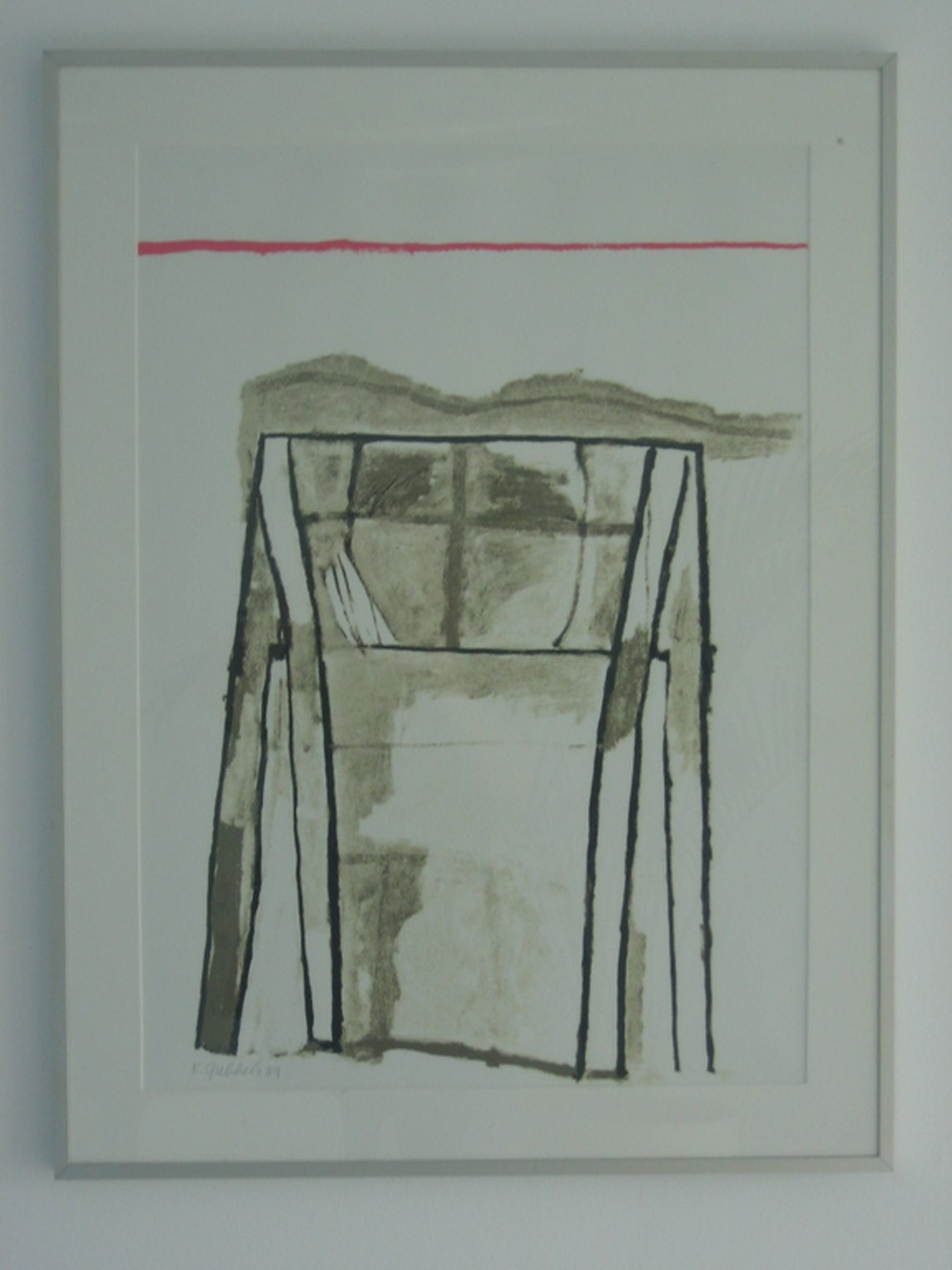 Zeefdruk in grijs/zilver en rood. Ca. 50x70. Linksonder in potlood gesigneerd " K. Gubbels 1989 "