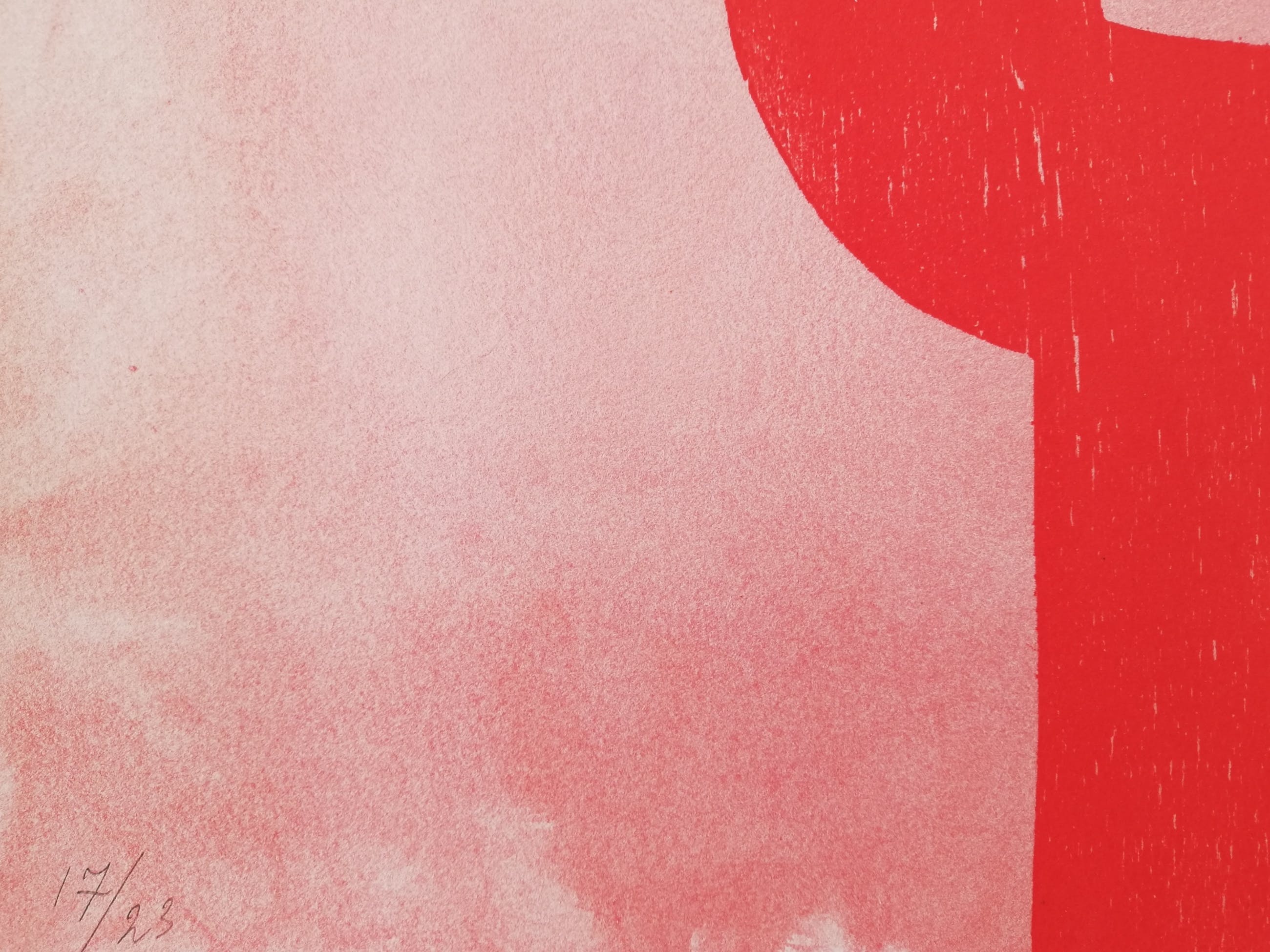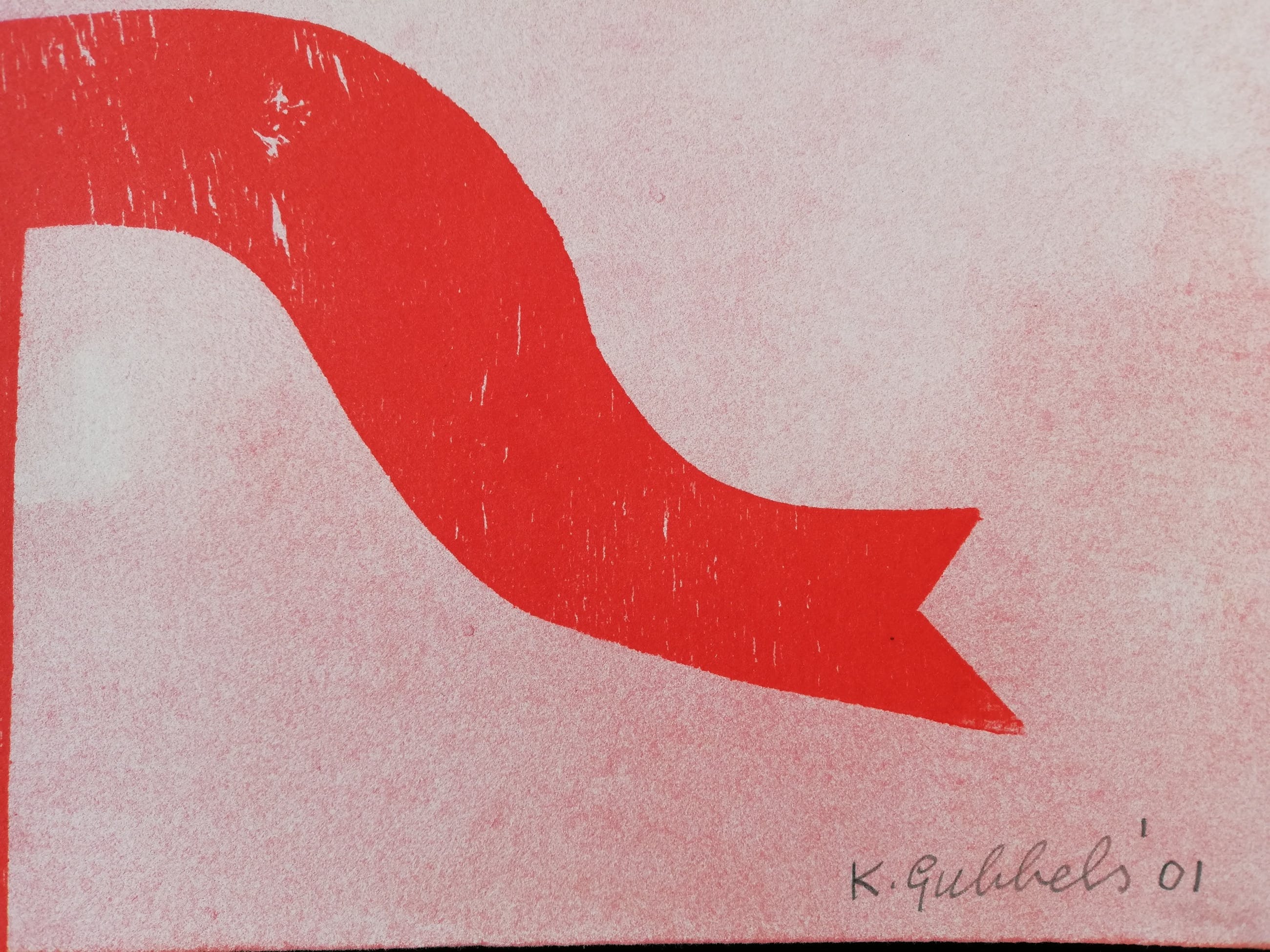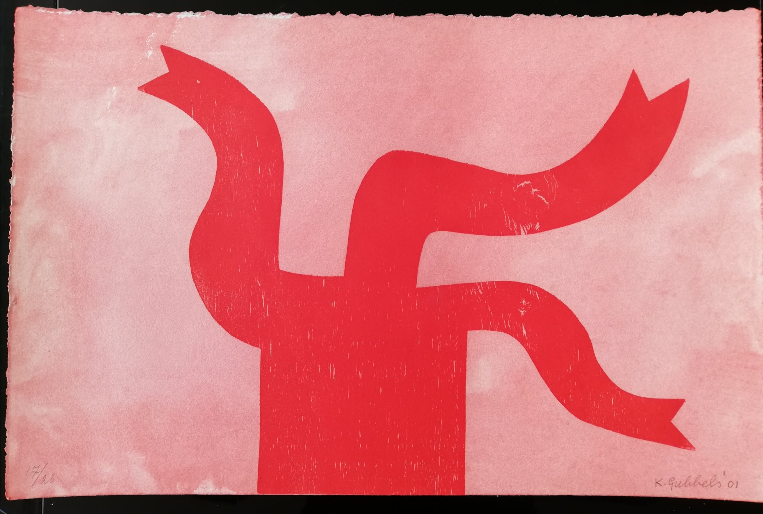 Fraaie houtdruk van geabstraheerde koffiepot op aquarel. Stevig papier. Met potlood gesigneerd en genummerd door Klaas Gubbels. Nummer 17 uit een zeer kleine oplage van 23. Door de aquarel ondergrond zijn alle werken bovendien iets verschillend.
