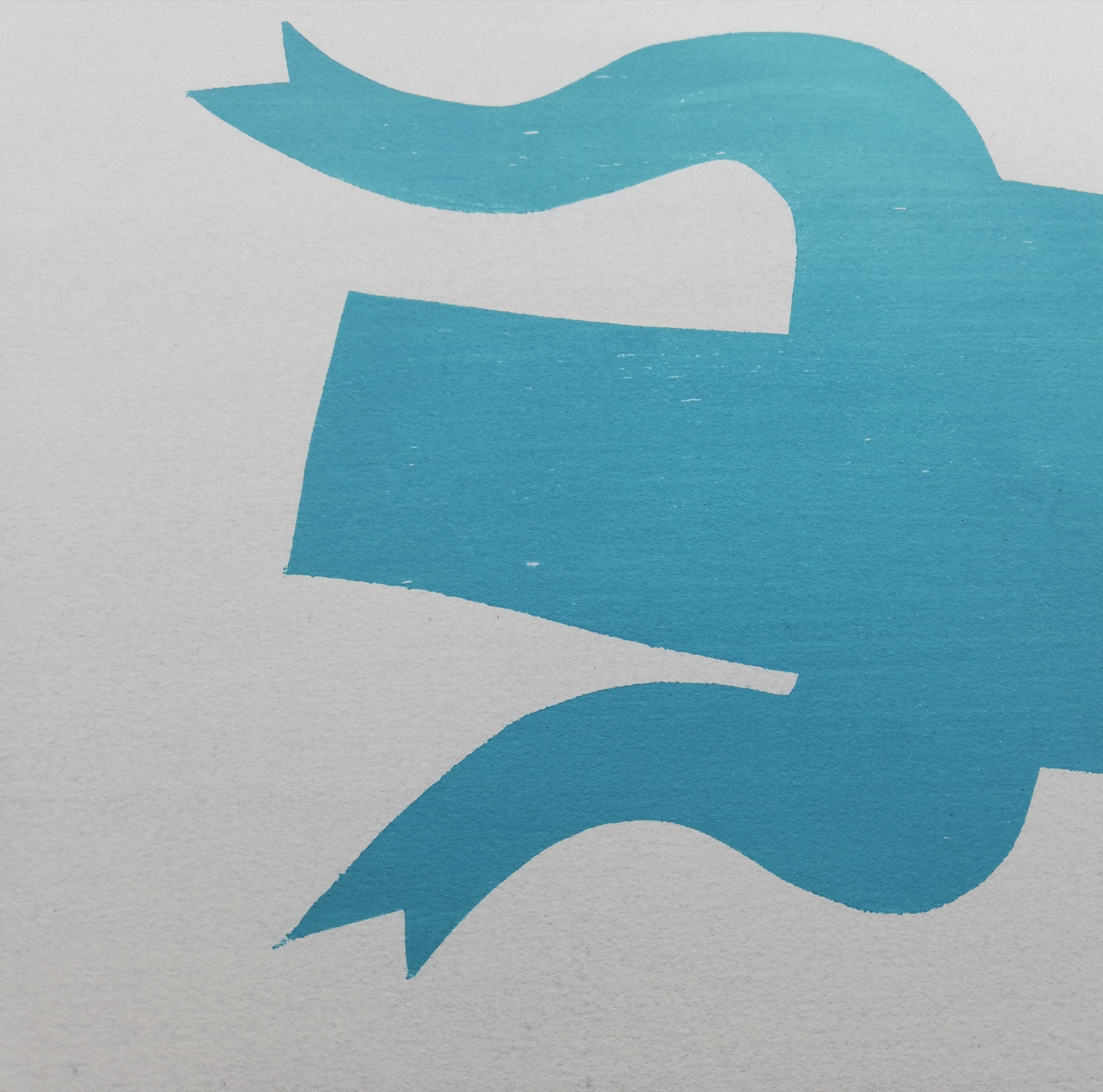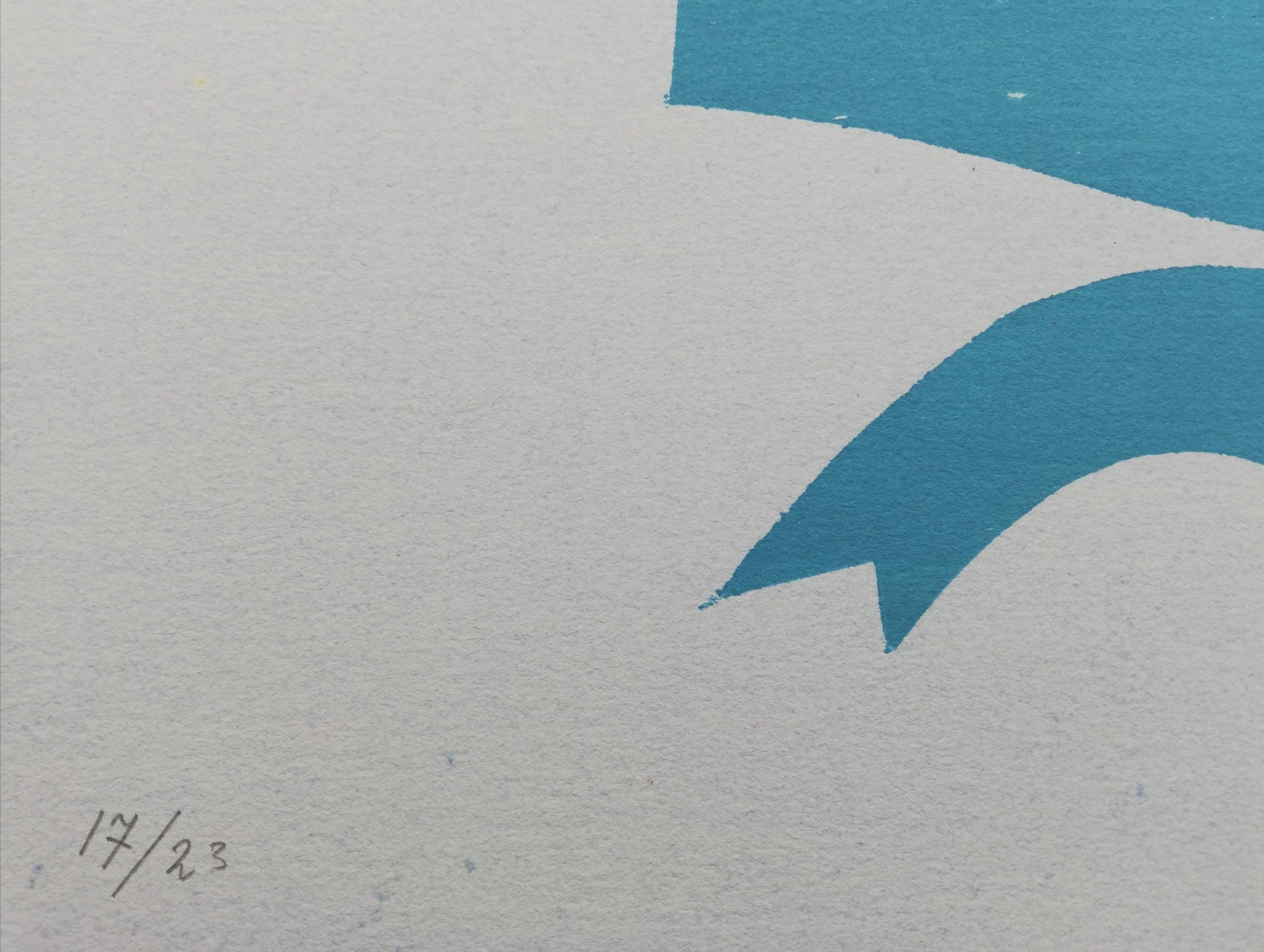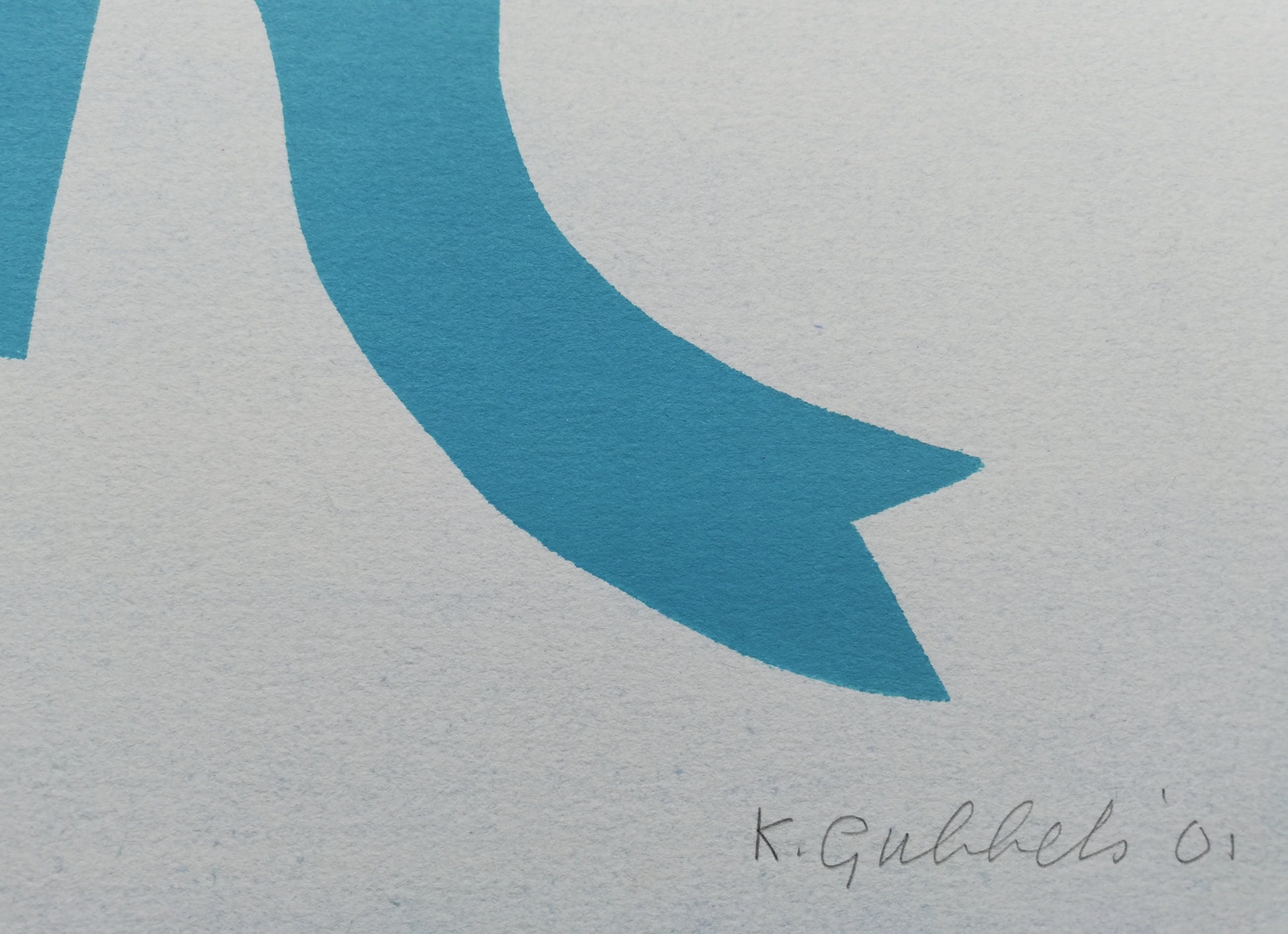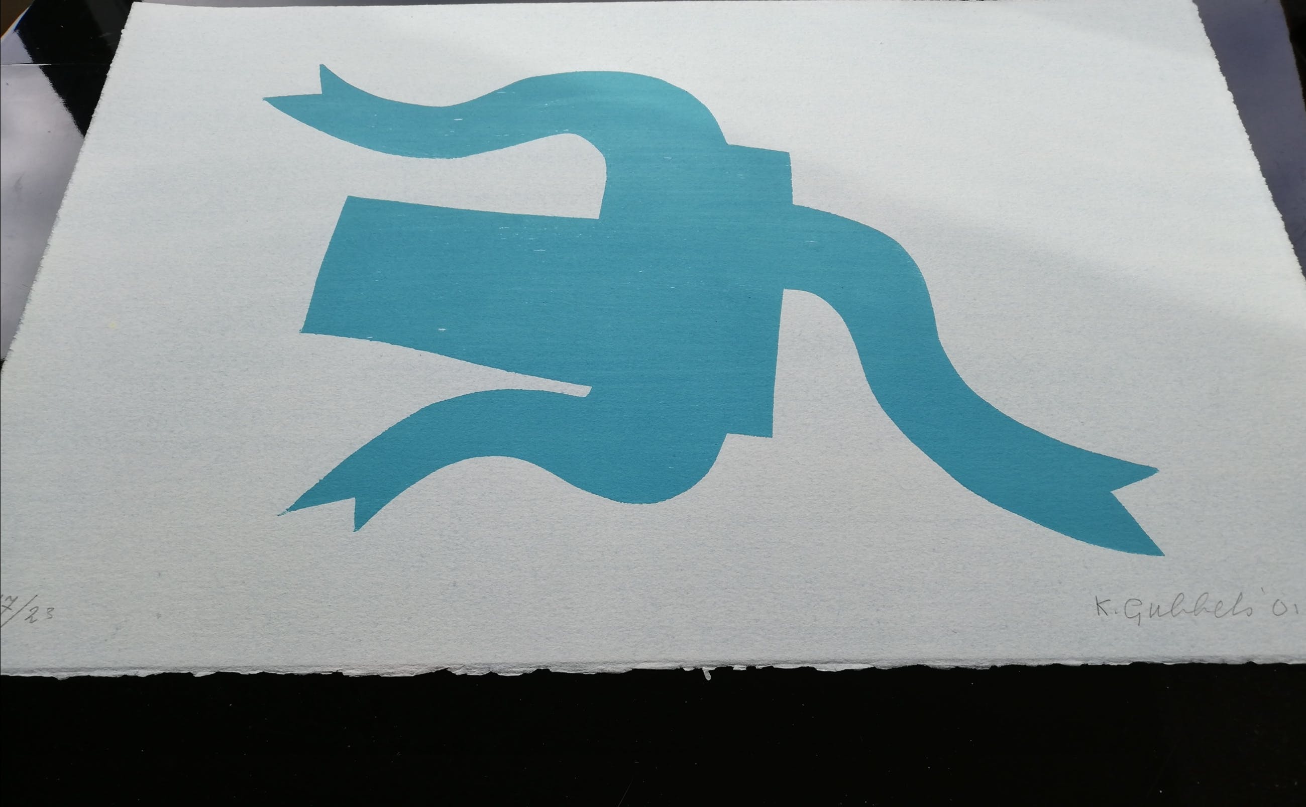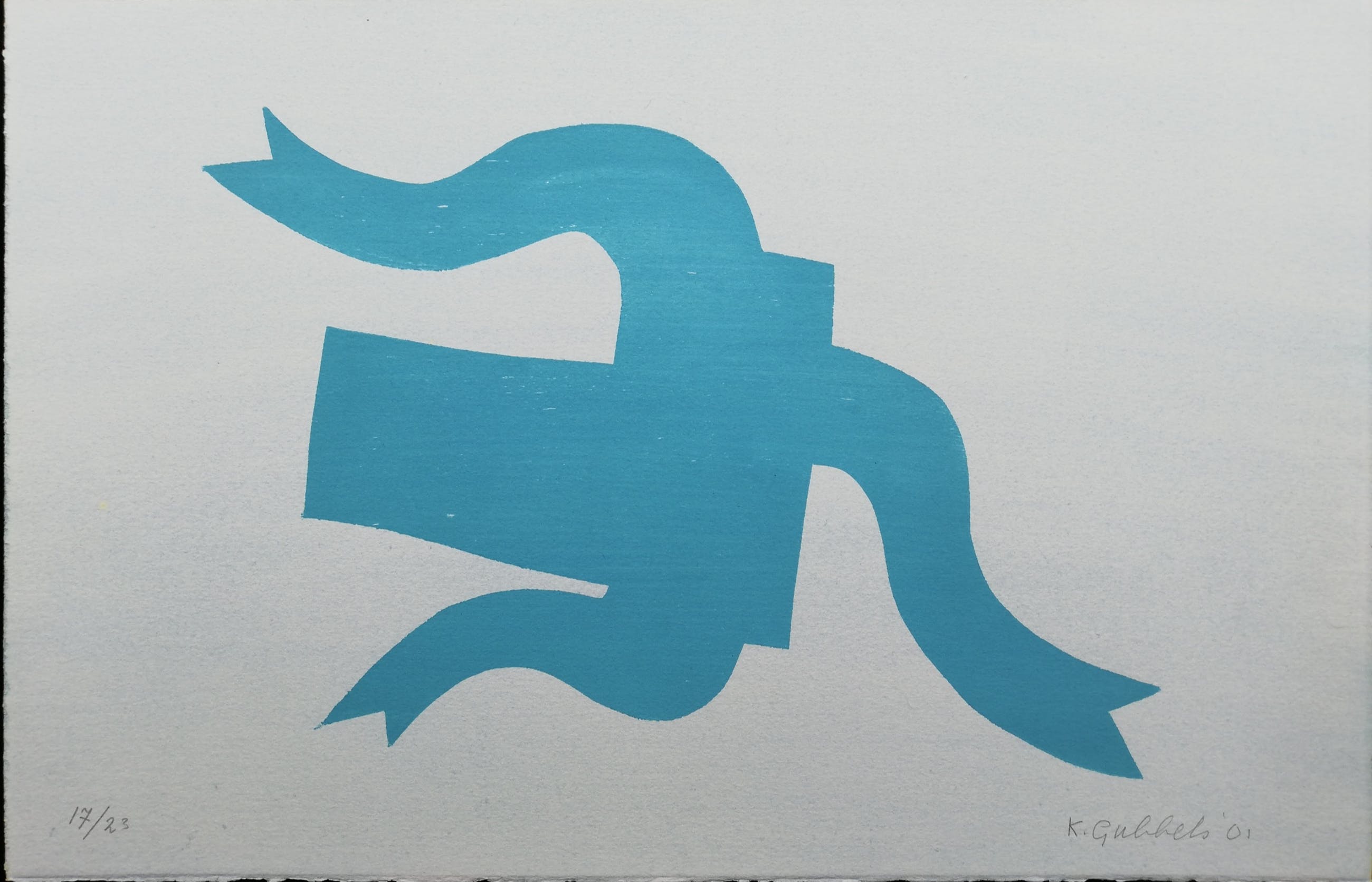 Fraaie houtdruk van geabstraheerde koffiepot op aquarel. Stevig papier. Met potlood gesigneerd en genummerd door Klaas Gubbels. Nummer 17 uit een zeer kleine oplage van 23. Door de aquarel ondergrond zijn alle werken bovendien iets verschillend.
