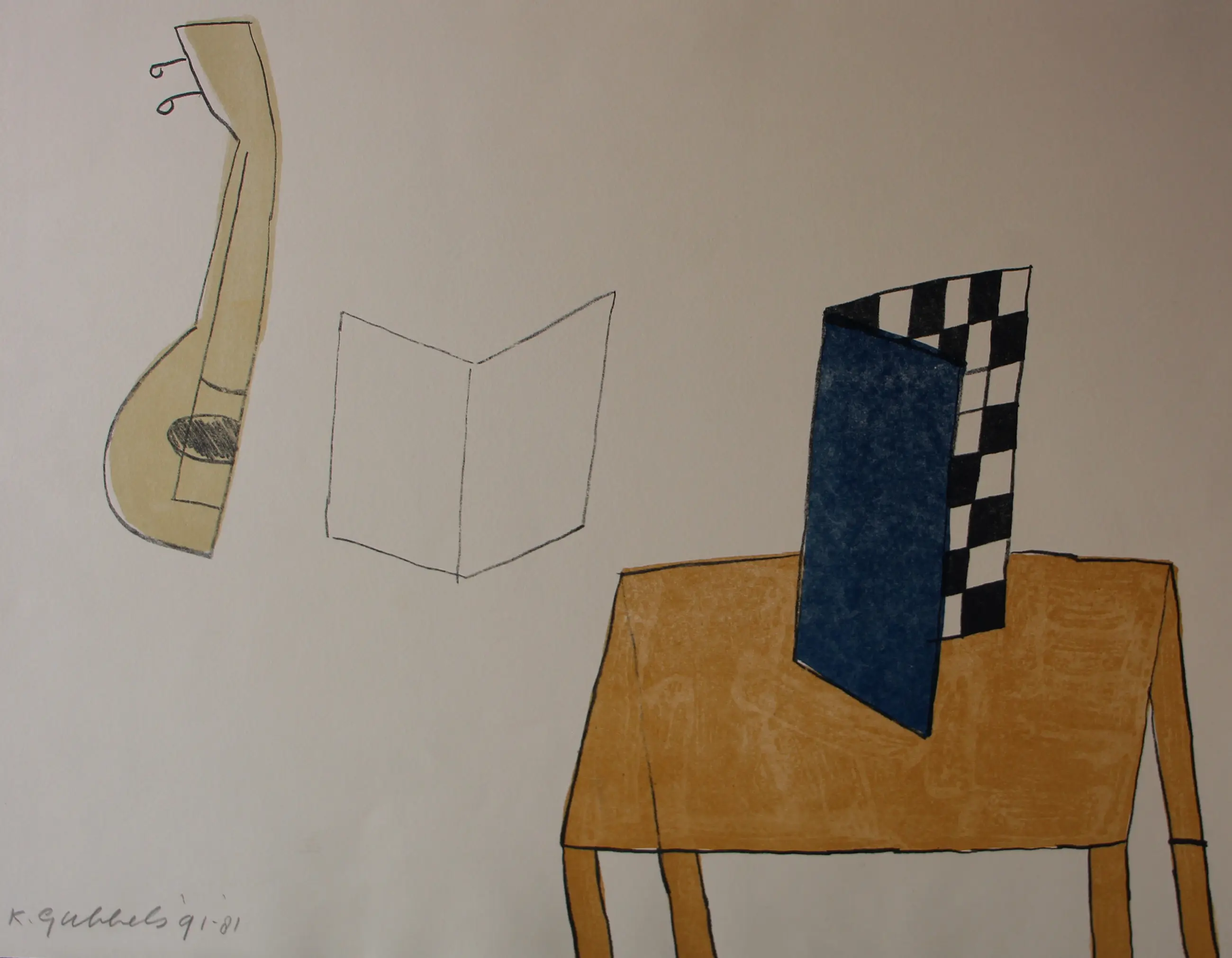 Kleurenlitho van Klaas Gubbels. Stilleven met tafel, gevouwen schaakbord en gitaar. Oplage: 33/100. Jaar: 91/81. Afmetingen blad: H50 x b65cm. Afmetingen voorstelling: H40 x b55cm. Het werk is, links onderaan , met potlood, gesigneerd door de kunstenaar. De authenticiteit van het, aangeboden, werk wordt volledig gegarandeerd. Een certificaat van echtheid kan, op aanvraag, worden gemaild.