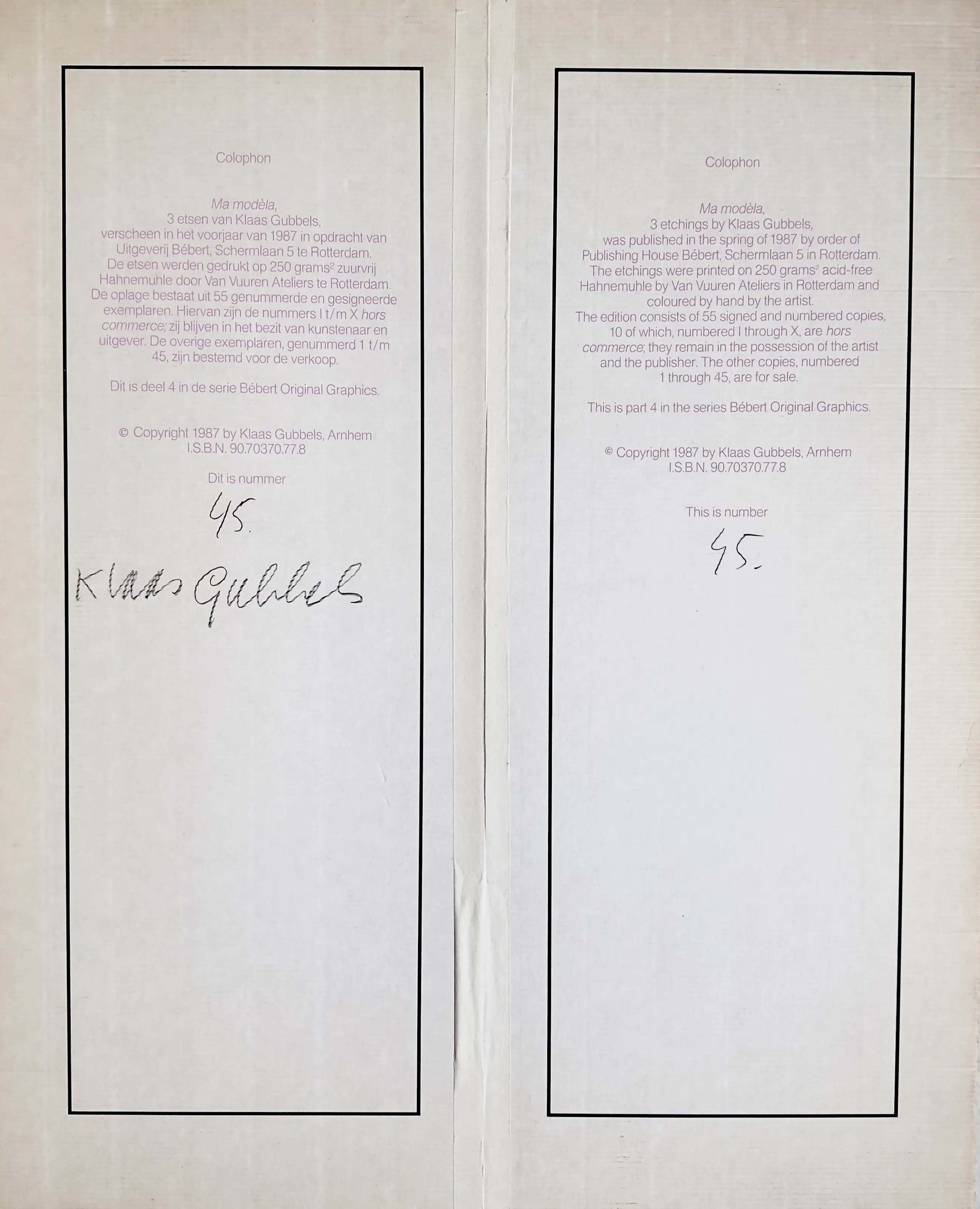 Ma Modèle verscheen in het voorjaar van 1987 in opdracht van uitgeverij Bébert te Rotterdam. De drie etsen werden geleverd in een in zeefdruk uitgevoerde slipcase. De oplage bestaat uit 55 genummerde en gesigneerde exemplaren. Deze zeefdrukken zijn ingelijst en hebben nummer 45. De slipcase, door mij gedrukt, bevat het nummer 45 en is rechtsonder gesigneerd.